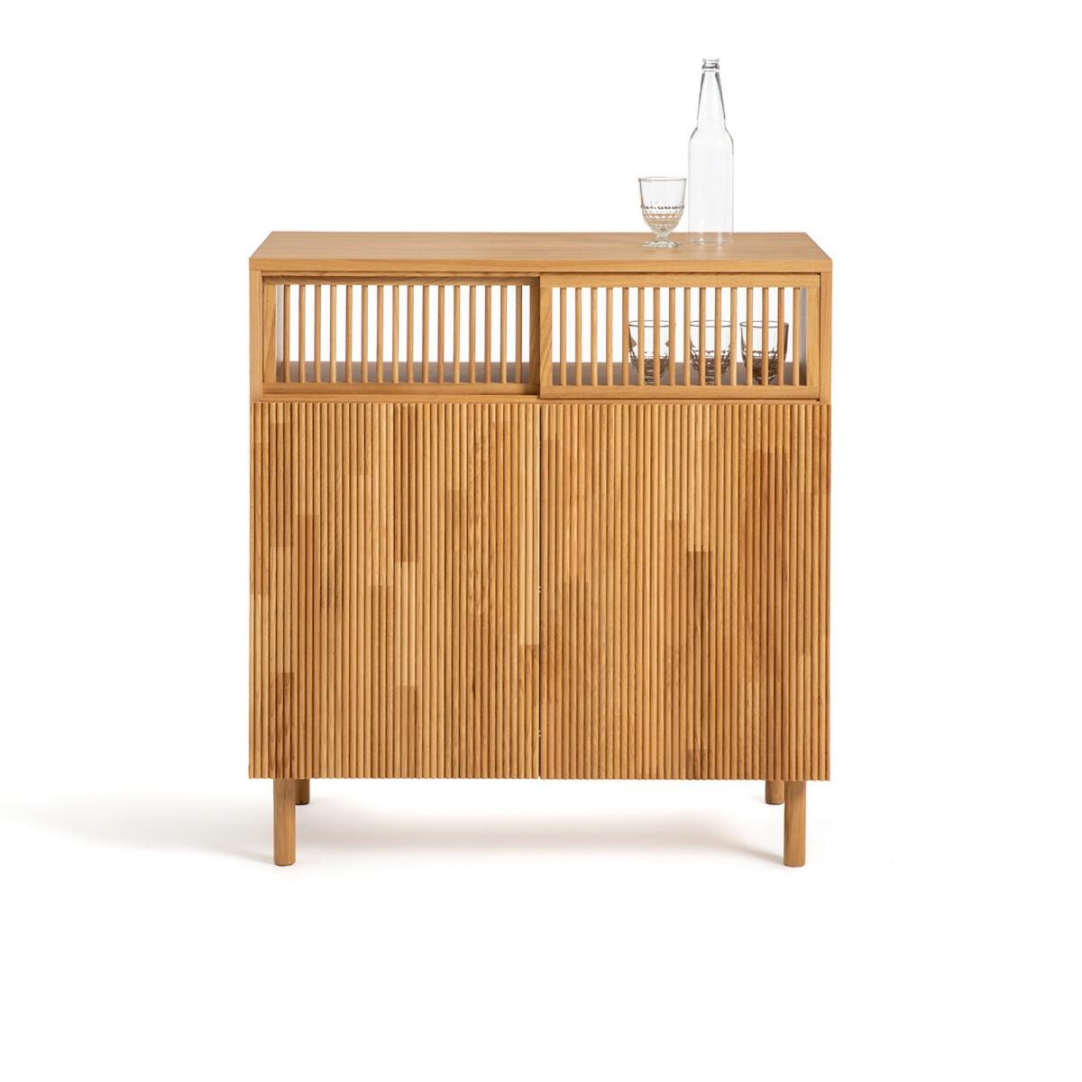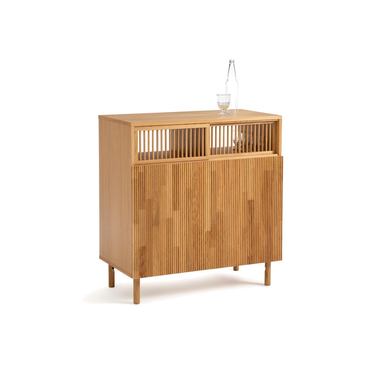 I love this bar for its warm oak finish and minimalist design, making it a versatile addition to various interiors. It works particularly well in contemporary, Scandinavian, or even eclectic spaces where natural wood tones can really shine. For styling tips, consider pairing it with brass or matte black accessories and adding some colourful glassware to highlight its practical use. Its sleek slatted details and compact size make it ideal for smaller dining rooms or open-plan living areas, providing both functionality and a touch of Scandinavian-inspired elegance. Keep styling simple and let the natural grain of the oak be the star, while keeping some essential barware or bottles on display for a practical yet stylish statement.