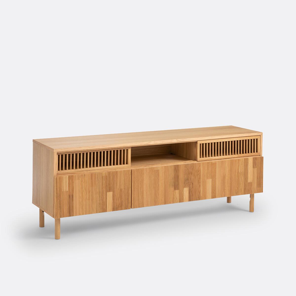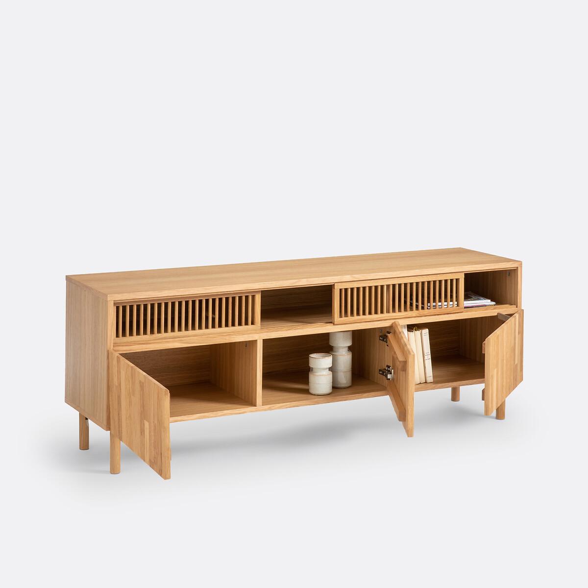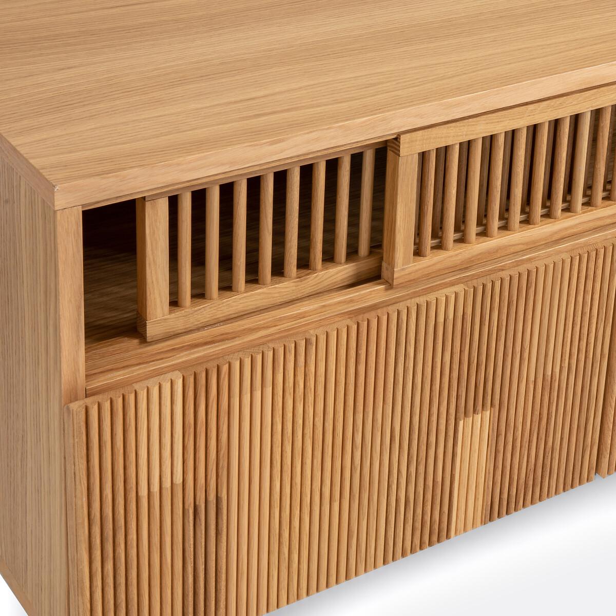 Welcome to your relaxation area. This contemporary-style Bilbao TV cabinet has graphic lines and solid oak fronts. Very functional, it is characterised by its numerous storage spaces to accommodate TV equipment discreetly.. The Bilbao TV cabinet is an original creation by La Redoute Interiors. Made in Europe. Product Details • Cabinet, shelves in oak veneered particle board with polyurethane varnish finish • Oak veneered MDF back • 2 sliding doors with solid oak bars • 3 doors with semi-round grooves in solid oak • Soft closing hinges • 6 compartments • Solid oak legsDimensions. Overall • Width: 160cm • Height: 58cm • Depth: 42.2cm • Height of legs: 14.7cm. Usable space • Upper compartment: L50 x H14 x D33cm • Compartment behind door: L50 x H22 x D34cmDelivery:. Assembly required. Available for home delivery. Note! Please check that all access points are large enough to accommodate your delivery (doors, stairs, lifts). • Made in Europe. • WOOD FROM SUSTAINABLY MANAGED FORESTS. FSC® certified wood comes from forests that are environmentally, socially and economically well managed. Dimensions and weight of parcel2 parcels • L172 x H9 x D52cm. 25.6kg. • L172 x H11.5 x D52 cm. 33.8kg.