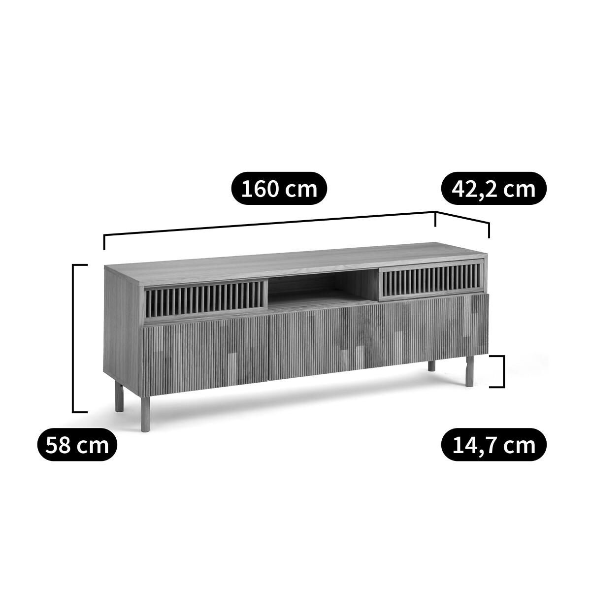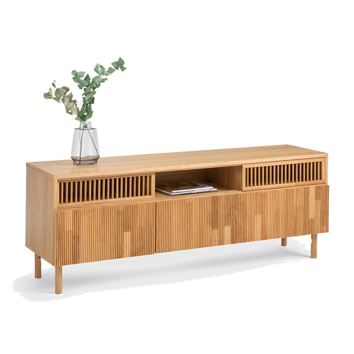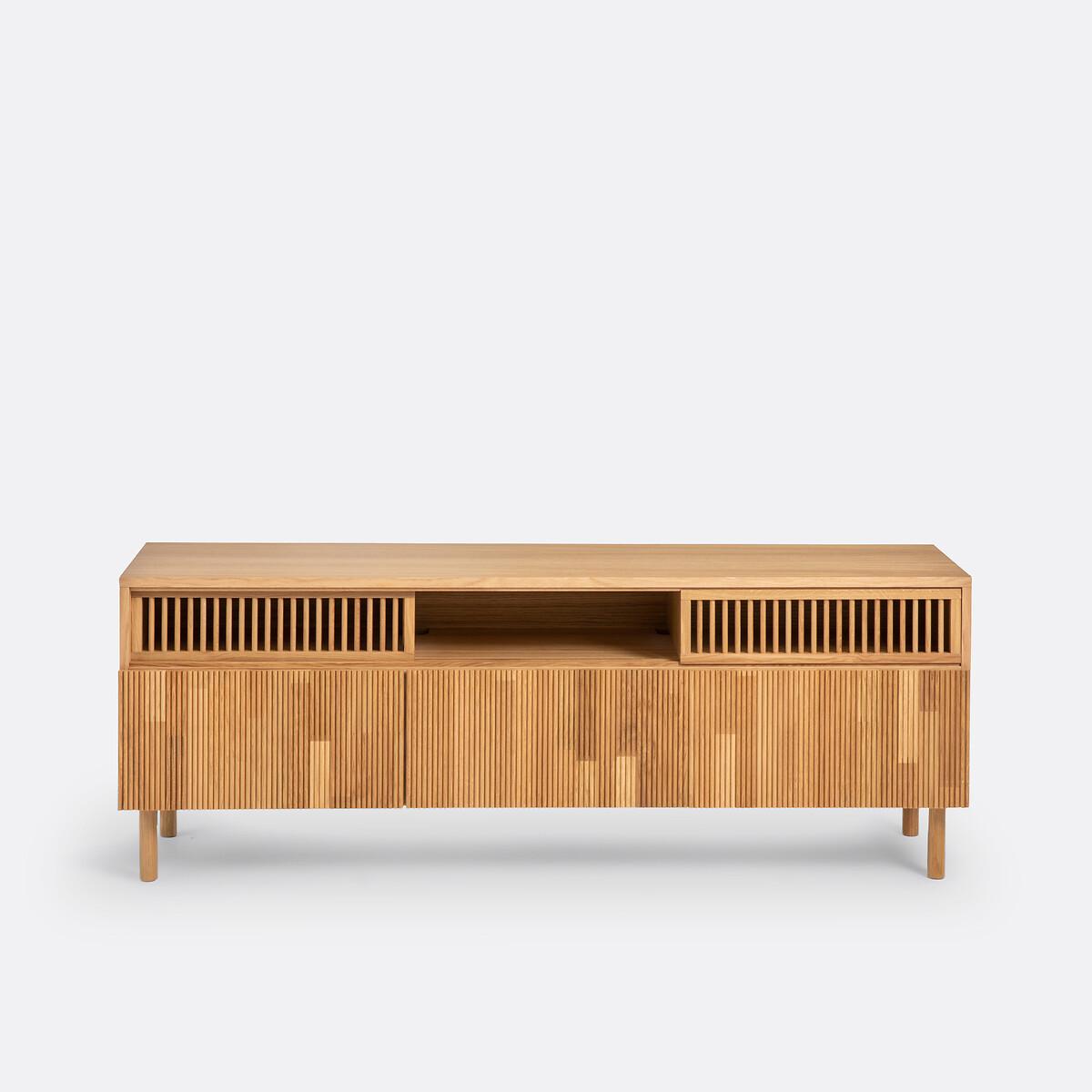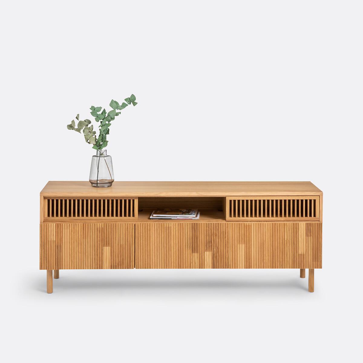 Welcome to your relaxation area. This contemporary-style Bilbao TV cabinet has graphic lines and solid oak fronts. Very functional, it is characterised by its numerous storage spaces to accommodate TV equipment discreetly.. The Bilbao TV cabinet is an original creation by La Redoute Interiors. Made in Europe. Product Details • Cabinet, shelves in oak veneered particle board with polyurethane varnish finish • Oak veneered MDF back • 2 sliding doors with solid oak bars • 3 doors with semi-round grooves in solid oak • Soft closing hinges • 6 compartments • Solid oak legsDimensions. Overall • Width: 160cm • Height: 58cm • Depth: 42.2cm • Height of legs: 14.7cm. Usable space • Upper compartment: L50 x H14 x D33cm • Compartment behind door: L50 x H22 x D34cmDelivery:. Assembly required. Available for home delivery. Note! Please check that all access points are large enough to accommodate your delivery (doors, stairs, lifts). • Made in Europe. • WOOD FROM SUSTAINABLY MANAGED FORESTS. FSC® certified wood comes from forests that are environmentally, socially and economically well managed. Dimensions and weight of parcel2 parcels • L172 x H9 x D52cm. 25.6kg. • L172 x H11.5 x D52 cm. 33.8kg.