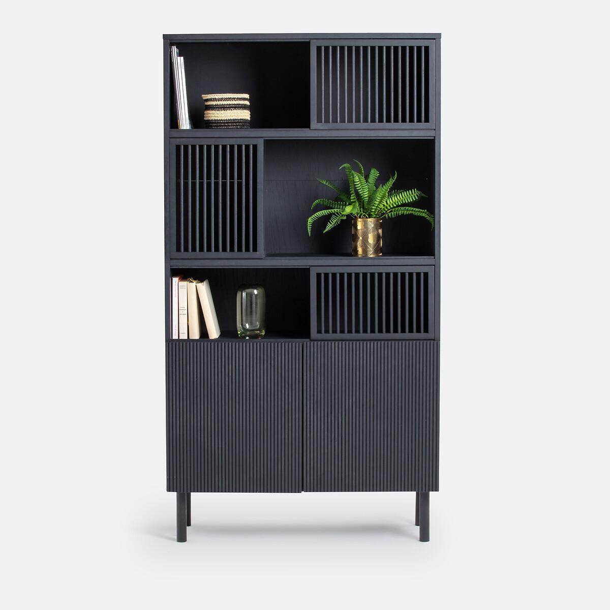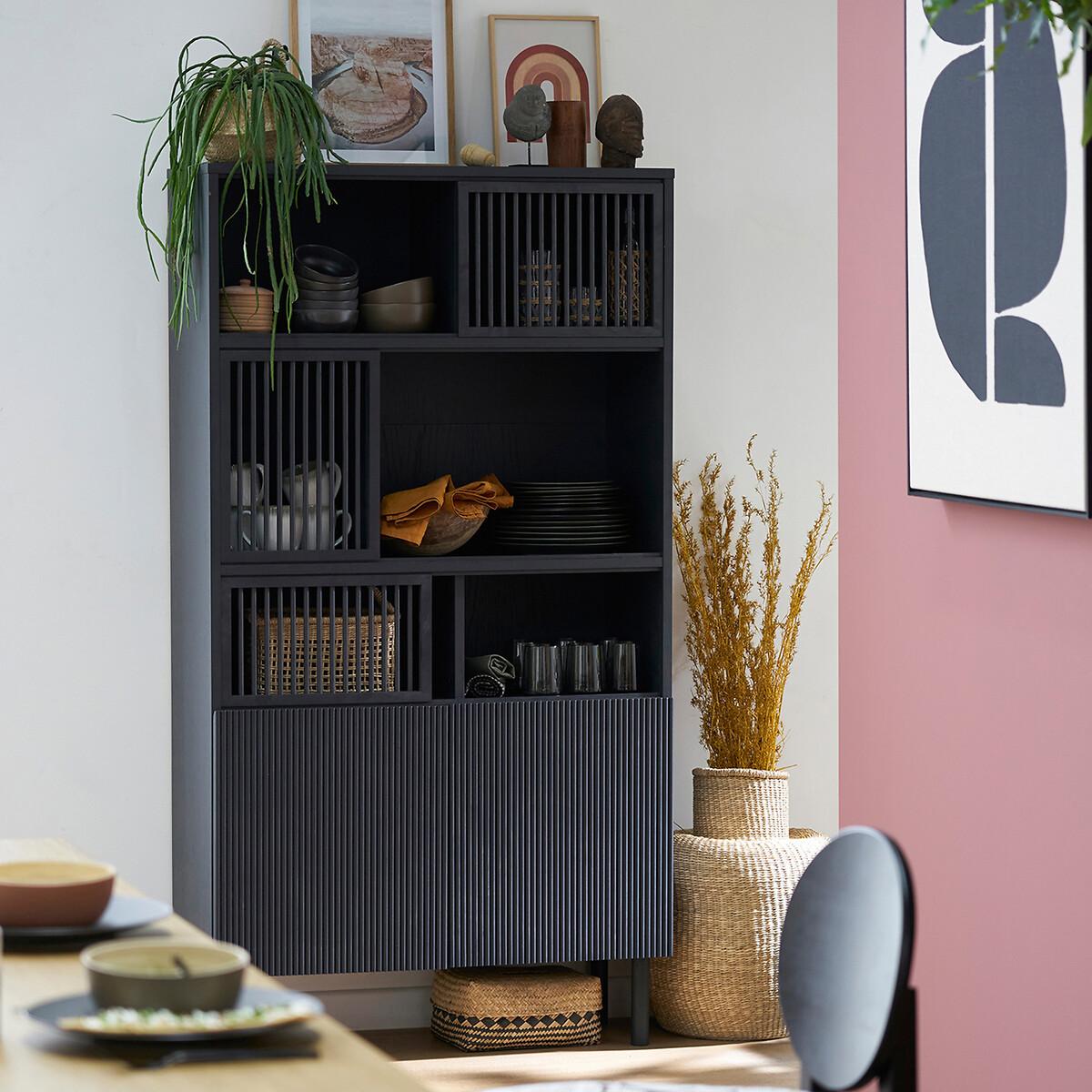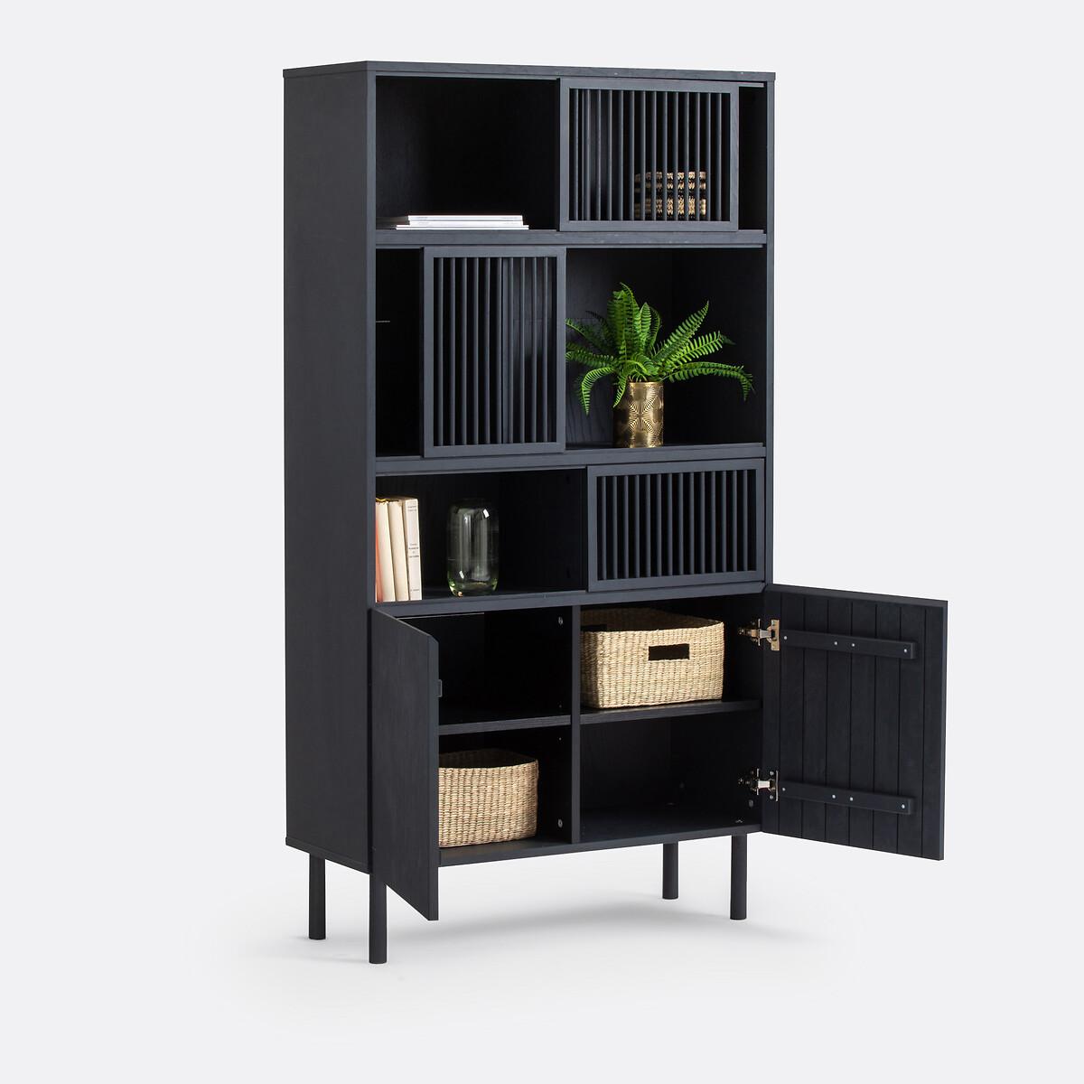 The Bilbao bookcase cabinet. This contemporary style bookcase has graphic lines and solid oak fronts. Very functional, it is characterised by its numerous storage spaces. Designed by La Redoute Interiors. Made in Europe. Product Details • Cabinet and shelves in oak veneered particle board • Black paint, polyurethane varnish finish • 3 sliding doors with solid oak bars • 2 doors with half-round grooves in solid oak • 6 compartments • Back in veneered MDF • Solid oak legs • Soft closing hinges • Can be fixed to the wallDimensions. Overall • Width: 90cm • Height: 168cm • Depth: 37cm • Height of legs: 18cm Usable space • Compartments behind the doors (adjustable shelves):L42.5 x H46 x D35cm • Upper compartments: L44.5 x H30 x D35cm and L38 x H30 x D35cm • Middle Compartments: L28 x H40 x D35cm and L56.5 x H40 x D35cm • Lower compartments:L46.5 x H25 x D35cm and L38 x H25 x D35cm Delivery: • Assembly required. Available for home delivery. • Note! Please check that all access points are large enough to accommodate your delivery (doors, stairs, lifts). • Made in Europe. Dimensions and weight of parcel: 3 parcels • L111 x H16 x D42cm. 19.5kg • L163 x H11 x D42cm. 23.2kg • L105 x H11 x D57cm. 14kg
