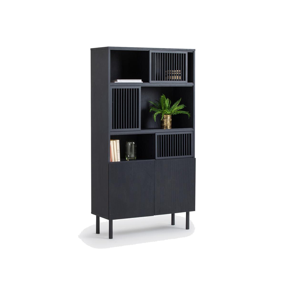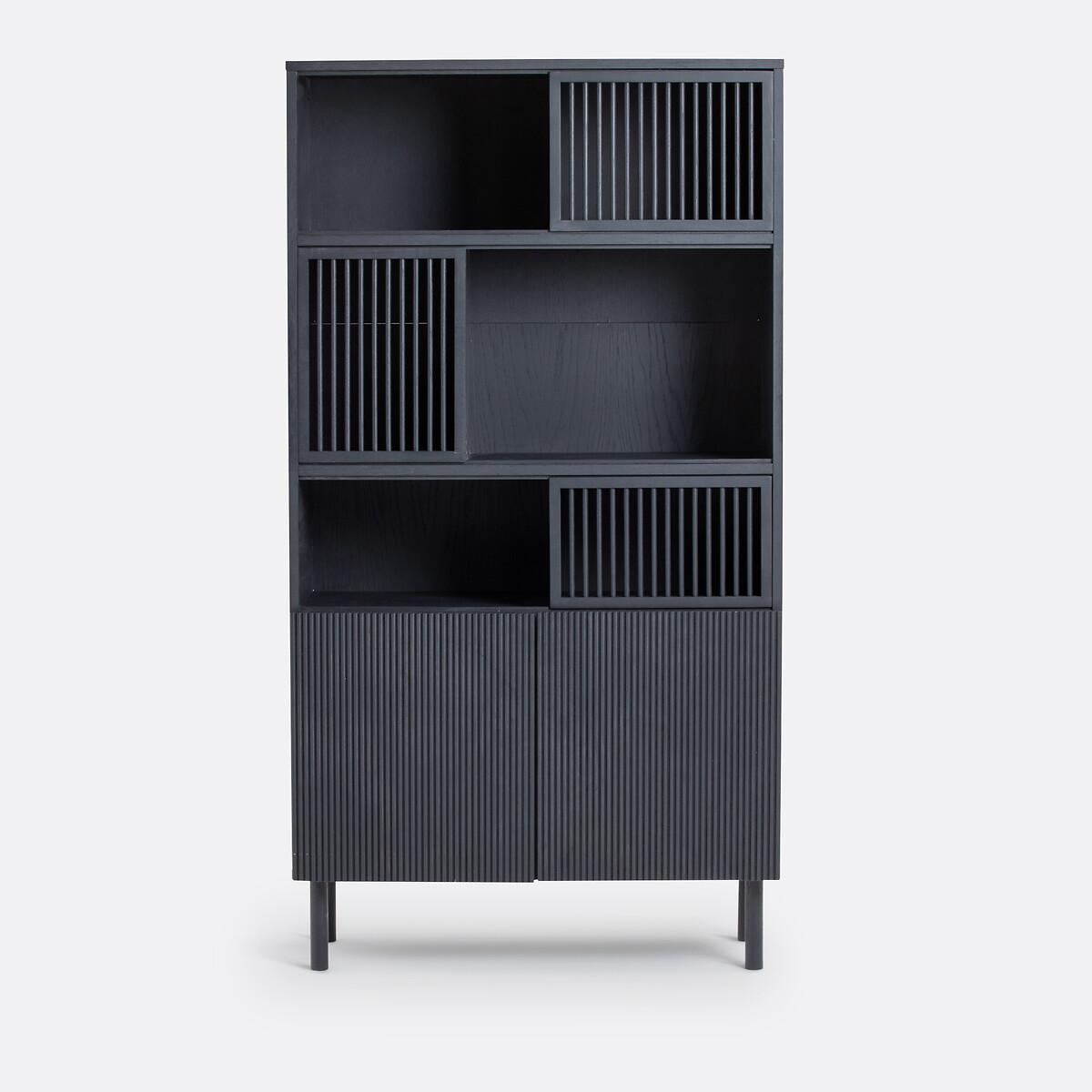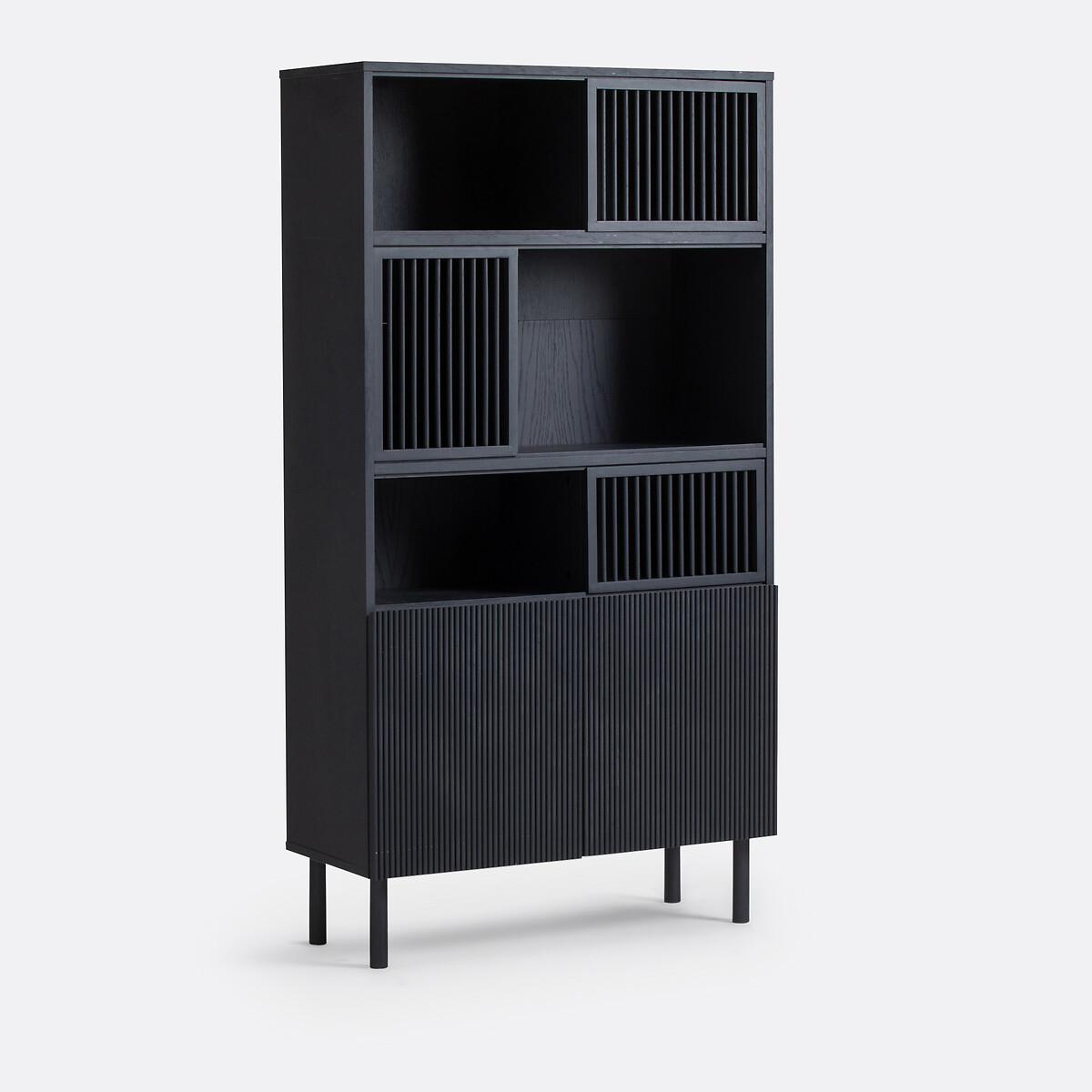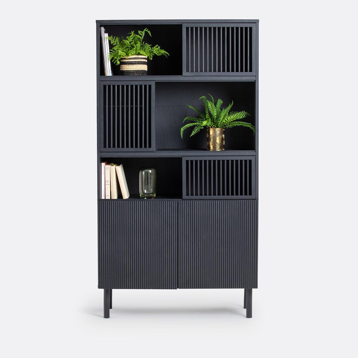 The Bilbao bookcase cabinet. This contemporary style bookcase has graphic lines and solid oak fronts. Very functional, it is characterised by its numerous storage spaces. Designed by La Redoute Interiors. Made in Europe. Product Details • Cabinet and shelves in oak veneered particle board • Black paint, polyurethane varnish finish • 3 sliding doors with solid oak bars • 2 doors with half-round grooves in solid oak • 6 compartments • Back in veneered MDF • Solid oak legs • Soft closing hinges • Can be fixed to the wallDimensions. Overall • Width: 90cm • Height: 168cm • Depth: 37cm • Height of legs: 18cm Usable space • Compartments behind the doors (adjustable shelves):L42.5 x H46 x D35cm • Upper compartments: L44.5 x H30 x D35cm and L38 x H30 x D35cm • Middle Compartments: L28 x H40 x D35cm and L56.5 x H40 x D35cm • Lower compartments:L46.5 x H25 x D35cm and L38 x H25 x D35cm Delivery: • Assembly required. Available for home delivery. • Note! Please check that all access points are large enough to accommodate your delivery (doors, stairs, lifts). • Made in Europe. Dimensions and weight of parcel: 3 parcels • L111 x H16 x D42cm. 19.5kg • L163 x H11 x D42cm. 23.2kg • L105 x H11 x D57cm. 14kg