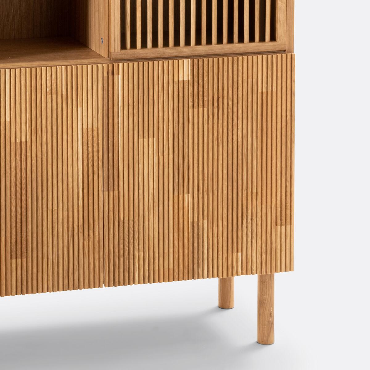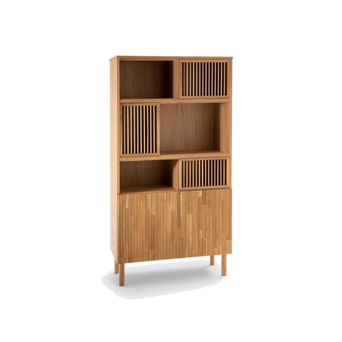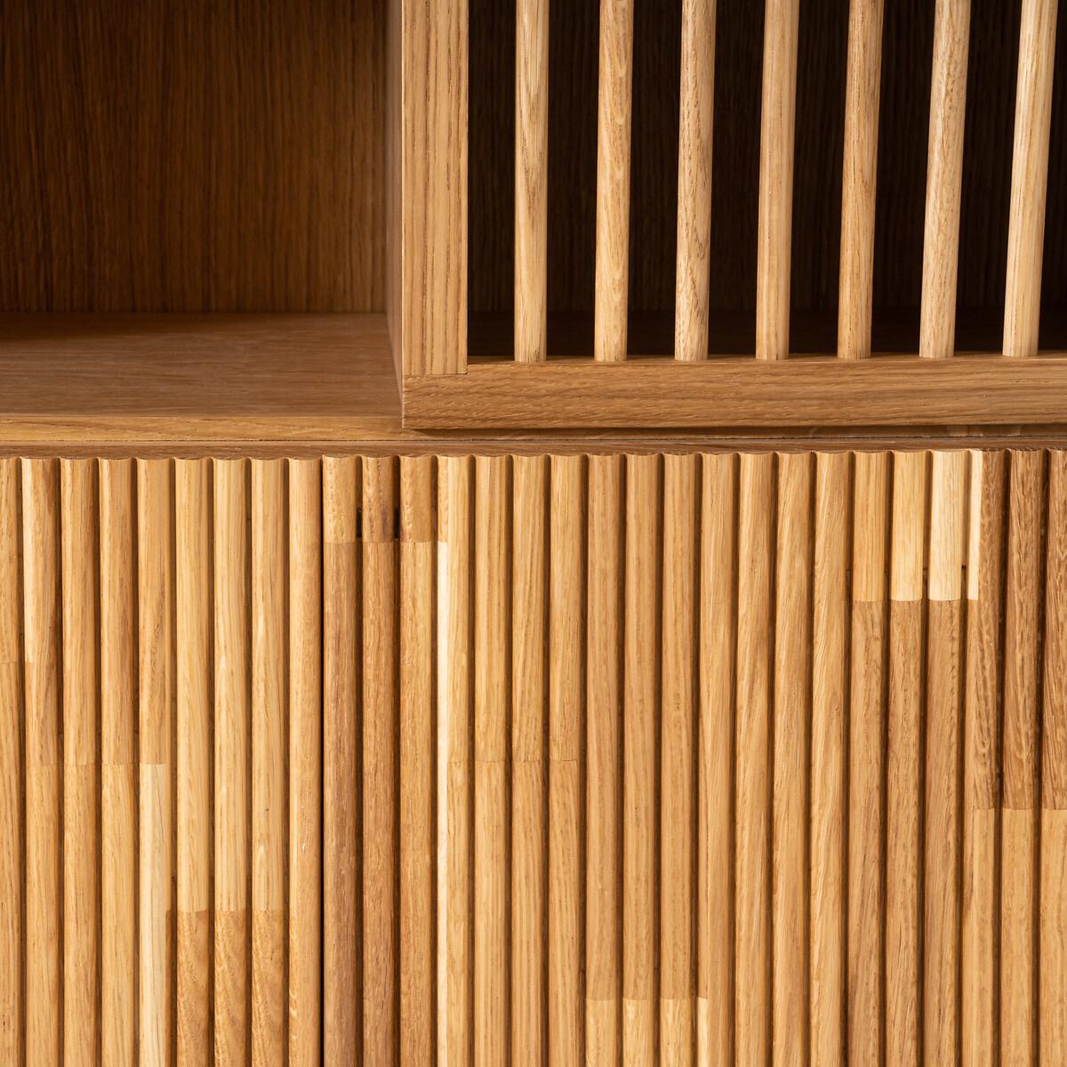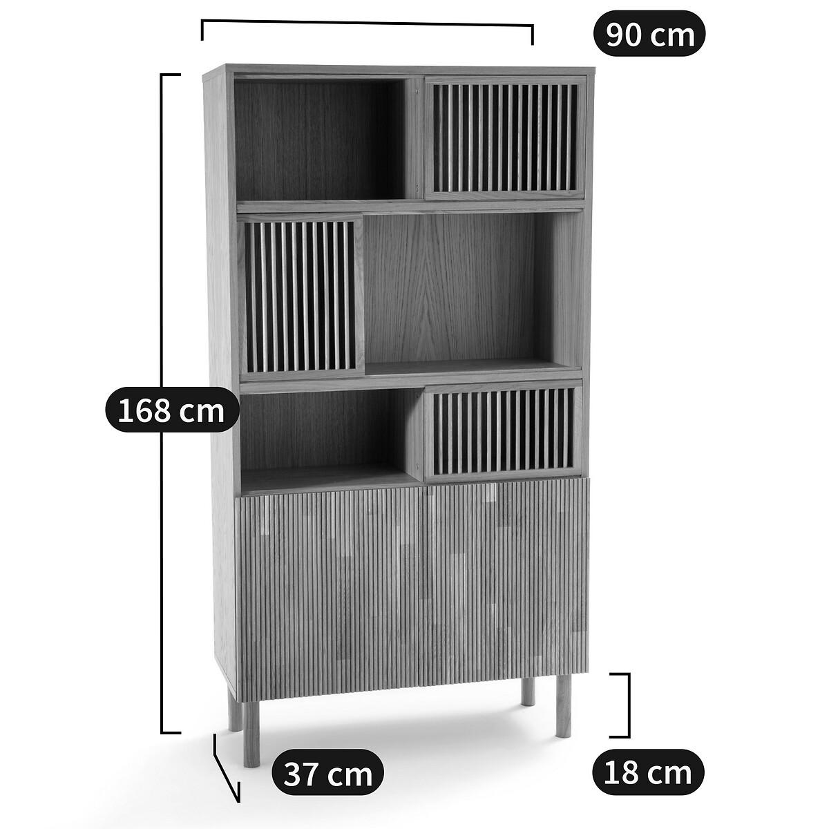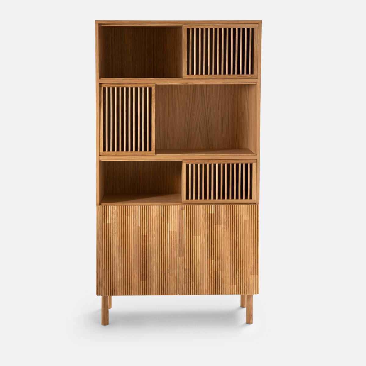 The Bilbao bookcase cabinet. This contemporary style bookcase has graphic lines and solid oak fronts. Very functional, it is characterised by its numerous storage spaces. Made in Europe. Product Details • Case, shelves in PP, oak veneered, PU varnish finish • Oak veneered MDF back • 3 sliding doors with solid oak bars • 2 doors with half-round grooves in solid oak • Soft closing hinges • 6 compartments • Solid oak legs • Can be fixed to the wall • Made in EuropeDimensions Overall • Width: 90cm • Height: 168cm • Depth: 37cm • Height of legs: 18cm. Usable size of compartments • Dimensions of the compartments behind the doors (adjustable shelves):L42.5 x H46 x D35cm • Useful dimensions of the upper compartments:L44.5 x H30 x D35 cm + L38 x H30 x D35 cm • Useful dimensions of the niches in the middle W28 x H40 x D35 cm + W56.5 x H40 x D35 cm • Useful dimensions of the bottom niches W46.5 x H25 x D35 cm + W38 x H25 x D35 cmDelivery:. Your Bilbao bookcase requires self-assembly. It will be delivered to your home! Note! Please check that all access points are large enough to accommodate your delivery (doors, stairs, lifts). • Made in Europe. • WOOD FROM SUSTAINABLY MANAGED FORESTS. FSC® certified wood comes from forests that are environmentally, socially and economically well managed. Dimensions and weight of parcel3 parcels • L105 x H11 x D57 cm - 14 kg • L111 x H16 x D42 cm - 19.5 kg • L163 x H11 x D42 cm - 23.2 kg