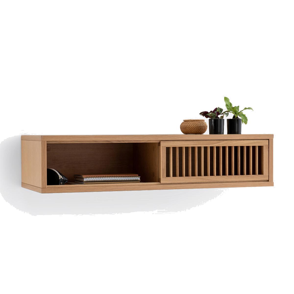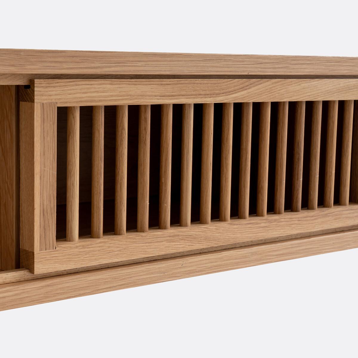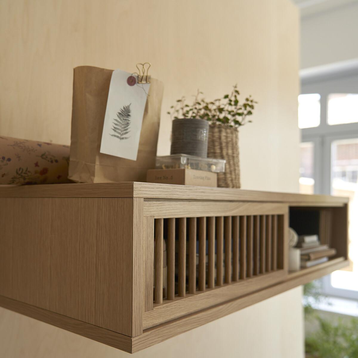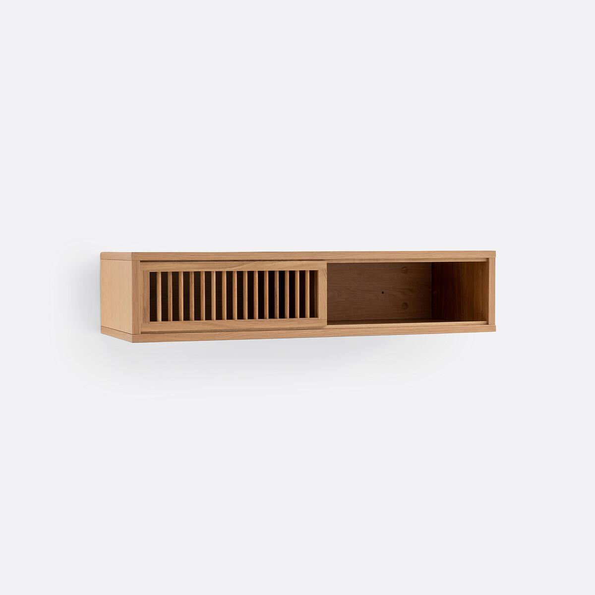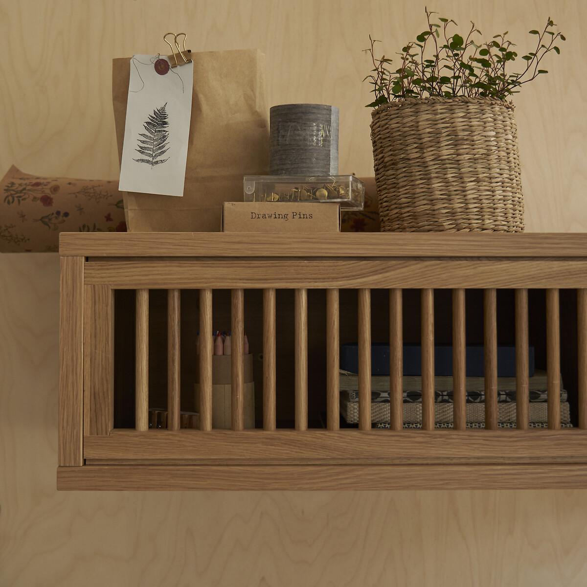 A touch of urban zen. A simplified line and graphic design. The Bilbao wall shelf will go perfectly with a desk in a workspace. Its small sliding door will protect your small office equipment and your notebooks. Made in Europe. Product Details • Solid oak and oak veneered MDF with nitrocellulose varnish finish • Sliding door with bars in solid oak • Associated desk sold separatelyDimensions. Overall • Length: 90cm • Height: 20cm • Depth: 34cm. Usable space • Dimensions of interior compartment: L42 x D32 x H16cmDelivery:. Assembly required. Available for home delivery. Note! Please check that all access points are large enough to accommodate your delivery (doors, stairs, lifts). • Made in Europe. Dimensions and weight of parcel1 parcel • L104 x H21 x D43cm. 15kg.
