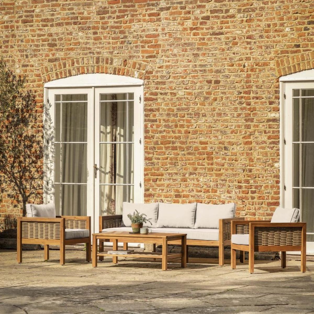 The Bilboa Lounge Set creates the perfect stylish place to sit and enjoy the Summer sun. With a 3 seater sofa, two armchairs, and a large coffee table, there39;s plenty of space to relax. The elegantly modern design features beautiful Acacia wood finished with woven wicker details on the arms and coffee table for the ultimate natural feel. *Simple Self Assembly *Table Dimensions:W52cm x D42cm x H90cm *3 Seater Bench Dimensions: W189cm x D61cm x H75cm *Armchair Dimensions:W70cm x D61cm x H75cm *Made From Acacia, Polyester, Foam, Fibre, and Rattan