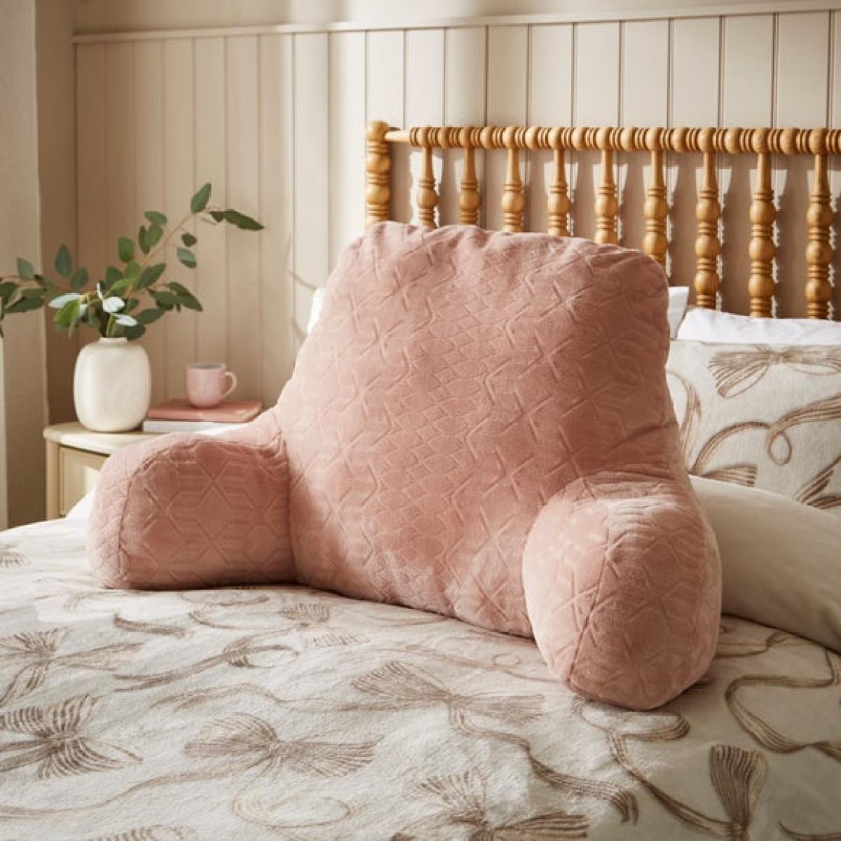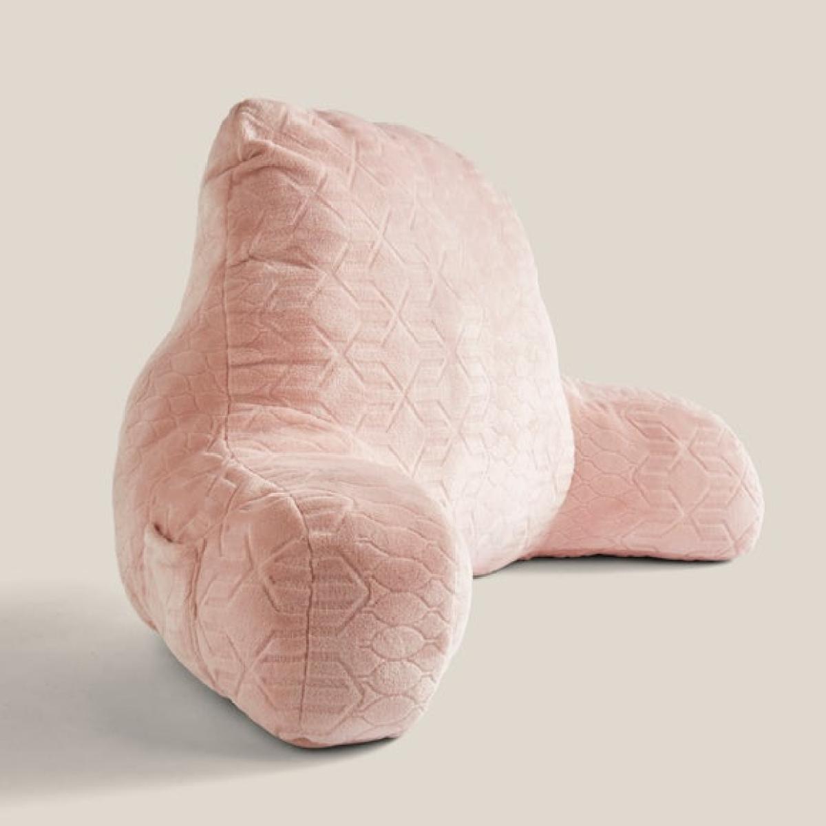 * High back for comfortable support * Embossed geometric design * Choice of colours * Carry handle * Side pocket Settle into comfort with the Billie Embossed High Back Cuddle Cushion, designed to support your back and arms while you relax. Its high back and long, padded armrests make it ideal for reading, watching TV, or simply unwinding. The soft embossed geometric design adds a stylish touch, available in a choice of colours to suit your space. A handy side pocket keeps your phone, remote, or glasses within reach, while the carry handle makes it easy to move from room to room.