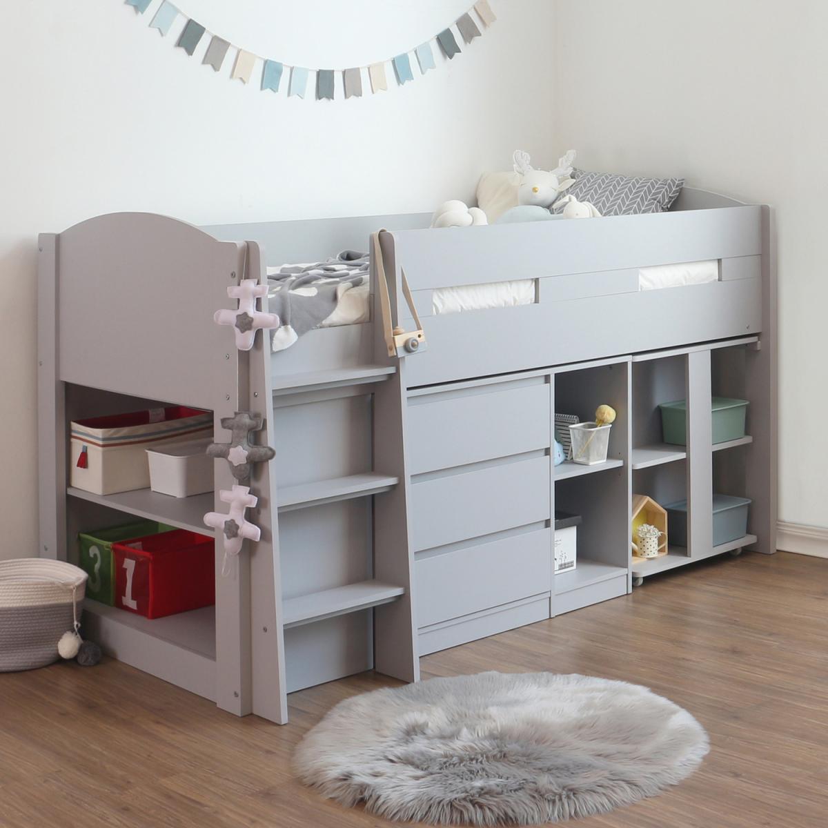 I’m a big fan of the Billie mid sleeper in grey because it combines a sleek, neutral finish with clever storage shelves and drawers, so every toy and book has its place. Its soft grey works equally well in Scandi-inspired, minimalist or contemporary kids’ rooms, and it layers beautifully with pops of pastel or brighter accents. To style it, add woven baskets and labelled boxes underneath for easy tidying, and hang a simple clip-on lamp by the top bunk for bedtime stories. A string of fairy lights or a small garland along the edge gives just the right touch of warmth. Finish with a few soft cushions or a faux-sheepskin rug beneath to create a cosy nook for play and reading.