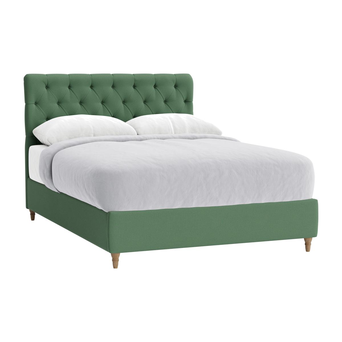 This bed's faded grandeur comes from replacing traditional buttons for discs of fabric and keeping the headboard fabric slightly relaxed. Job done.