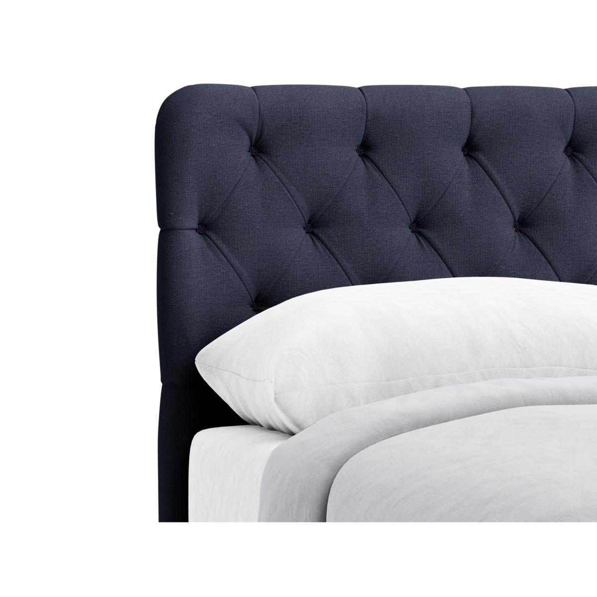 This bed's faded grandeur comes from replacing traditional buttons for discs of fabric and keeping the headboard fabric slightly relaxed. Job done.