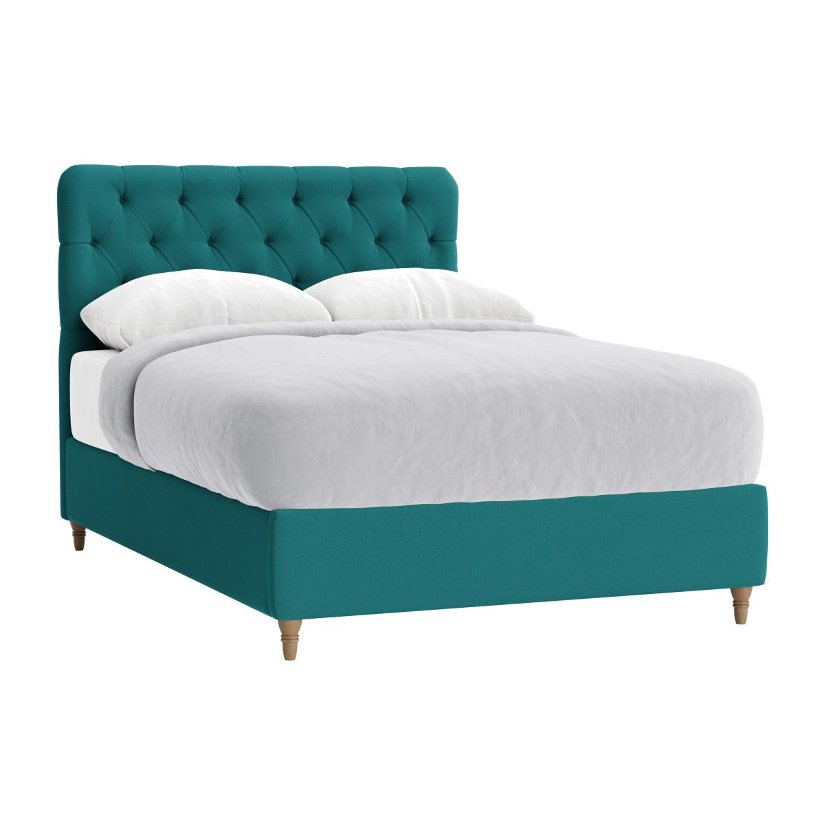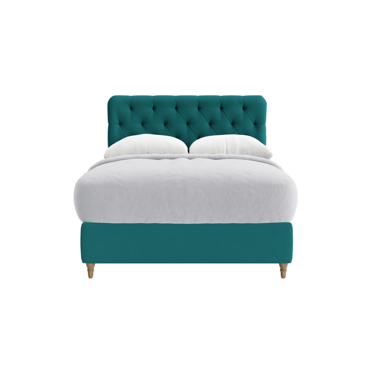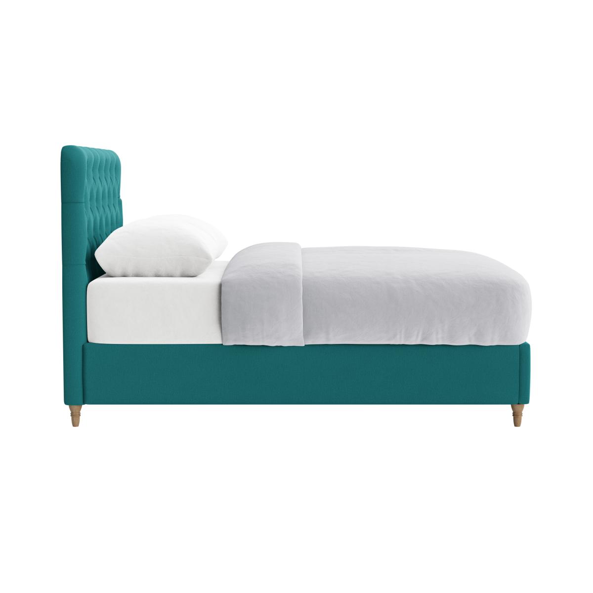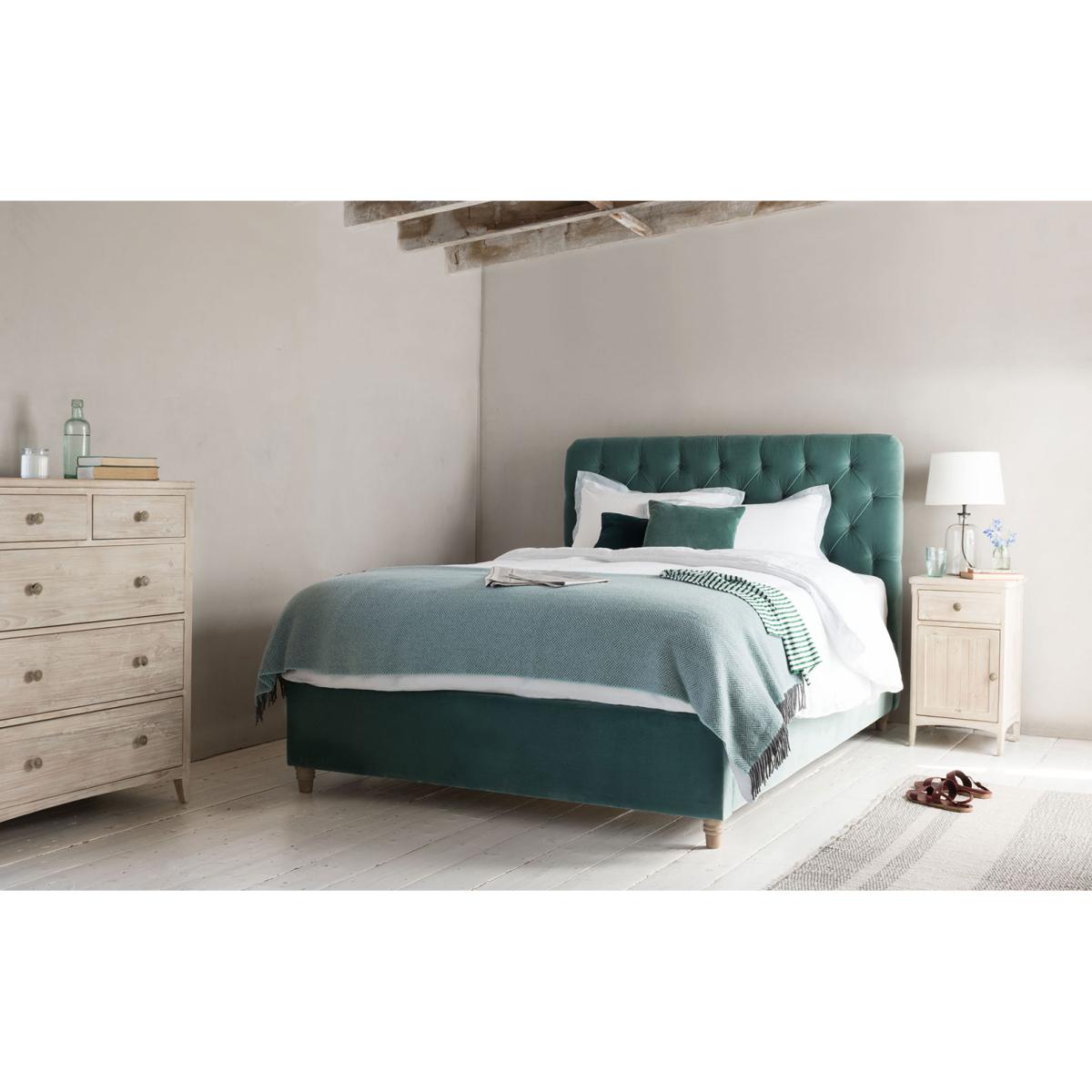 I love this bed for its bold, tufted headboard which instantly elevates a room’s aesthetic. It works particularly well in contemporary or eclectic interiors where a splash of colour and texture is welcome. The rich teal shade adds personality without overwhelming the space, making it versatile for both modern and vintage-inspired schemes. Practical styling tips include pairing it with crisp, neutral bedding to let the headboard stand out, or layer with patterned cushions for a cosy, lived-in look. Additionally, placing it against a plain wall or layering artwork above can help maintain visual balance. Its clean lines and timeless design make it a great investment piece that can adapt as your interior style evolves.