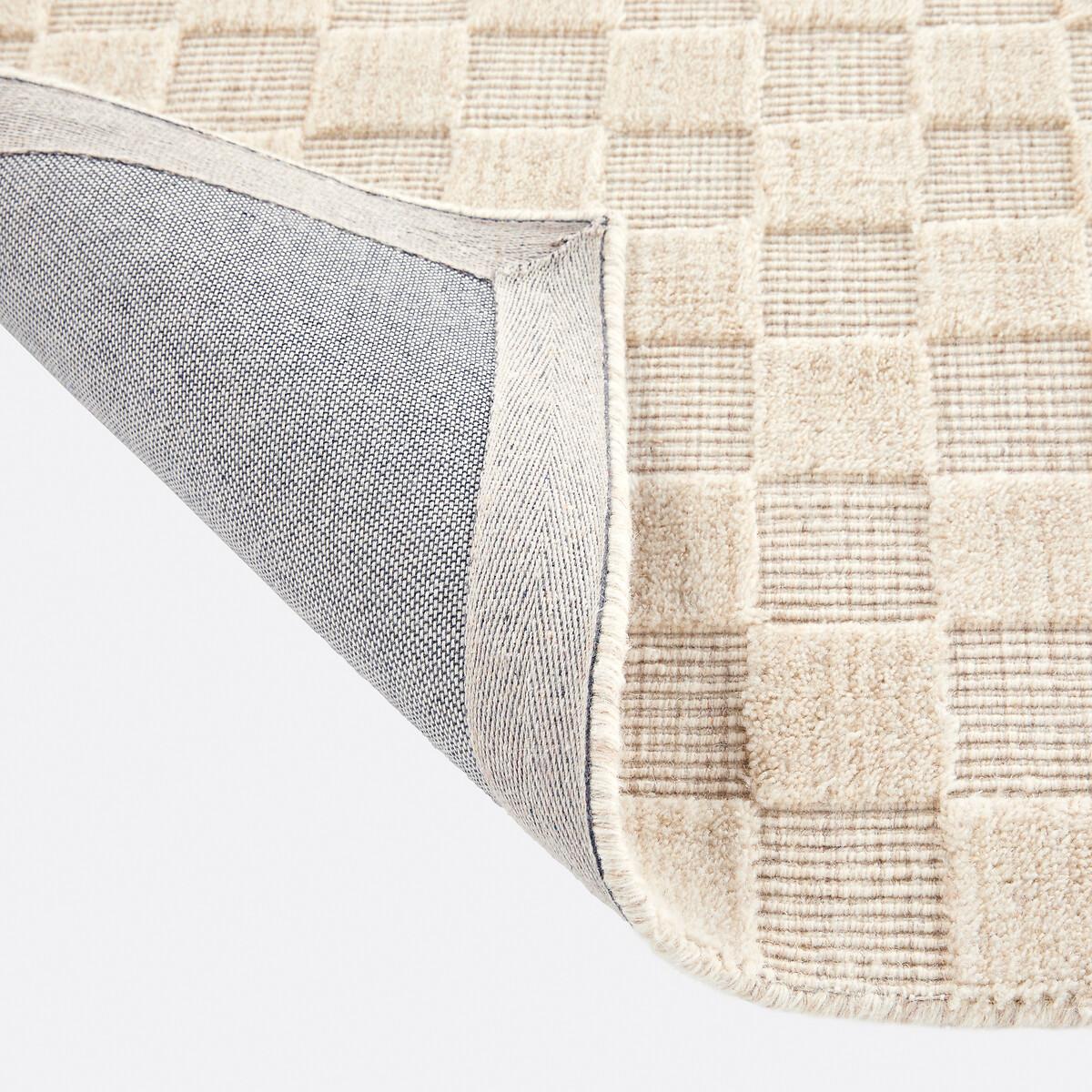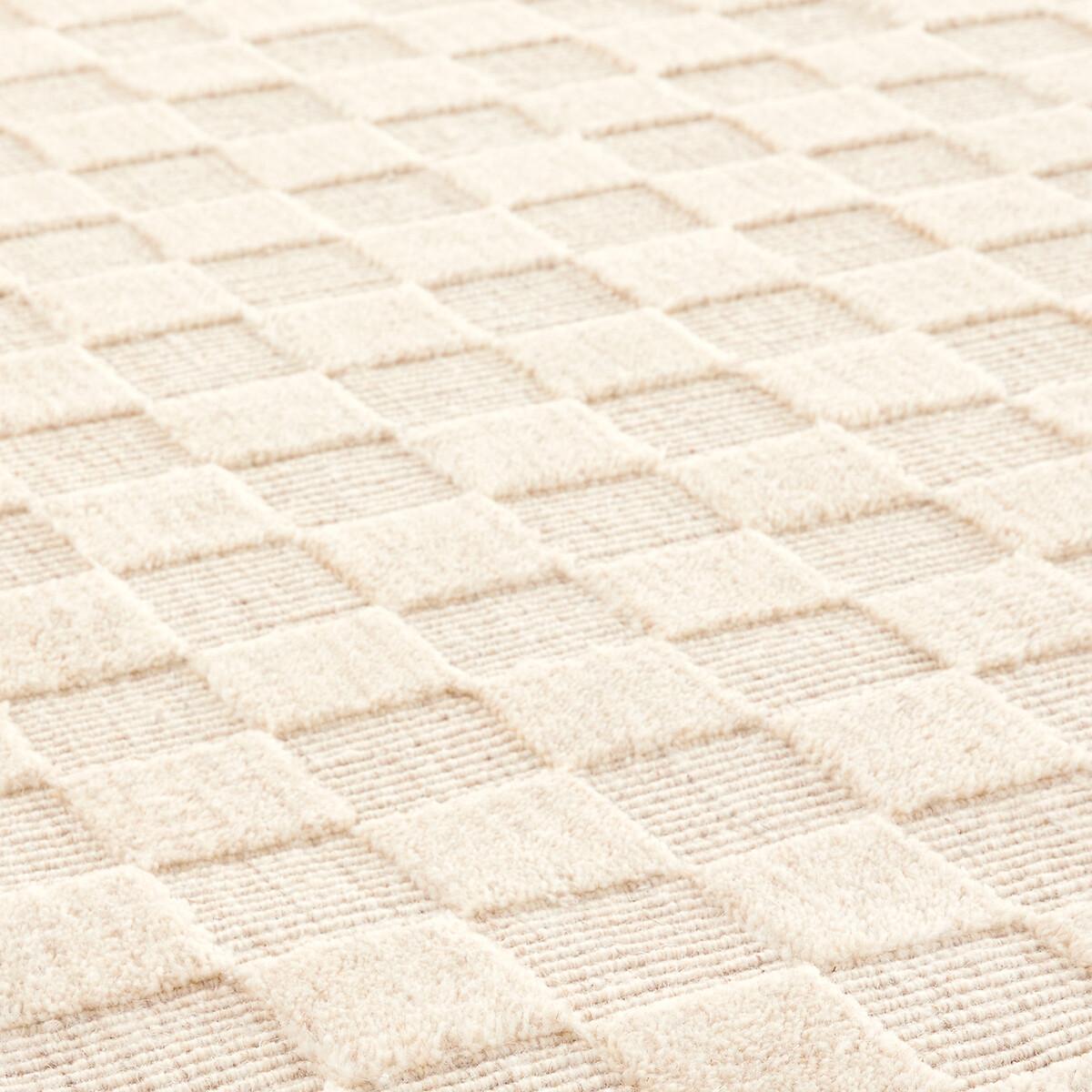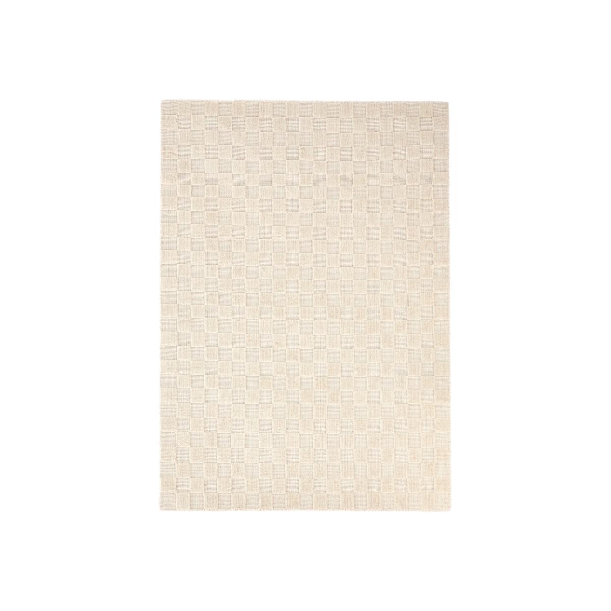 Add texture to your floors with the Bilmo rug. Its tone-on-tone, hand-crafted checkerboard print works a combo of materials and different pile heights. A simple yet refined decorative piece. Product Details • 65% wool, 25% cotton, 10% polyester • 1600g/m² • Thickness: 1cm • Weaving type: Handmade • Underfloor heating compatible: Yes • Interior Use: Yes • For outdoor use: No. Quality Info • Wool is a warm and comfortable fibre. A wool rug is also an excellent thermal and sound insulator. • Hand-woven, each piece is unique and may have small irregularities that give it its authenticity. Colours and dimensions may vary slightly. Care Instructions • Once unrolled, you must wait a few days for the carpet to return to its initial shape. • To keep the edges flat, roll your mat in the opposite direction. Leave it like this for an hour then put it back flat and place a heavy object on it for 2 days. • New, the carpet may give off an odour which dissipates over time. Ventilate your room regularly to reduce it. • To preserve its appearance, rotate your rug regularly in one direction or the other to minimise localised wear in the same places (due to successive passages), and loss of colour due to regular light exposure. Care Advice • Some materials are very fibrous (such as wool) Wool rugs pill naturally during the first few months: this is a normal for this type of product and is not a defect. Remove the excess fibres by hand where possible, do not use a vacuum cleaner with a rotating brush as this can pull and tear the fibres. The pilling will improve over time. • For maintenance, we advise you to vacuum it very little the first month and then to vacuum it without rubbing too much always without using the brush. • Compatible with robot vacuum cleaners: No • Remove stains immediately with a clean, damp cloth. • Dry clean recommended. Dimensions • Width 120 x Length 170cm • Width 160 x Length 230cm • Width 200 x Length 290cm