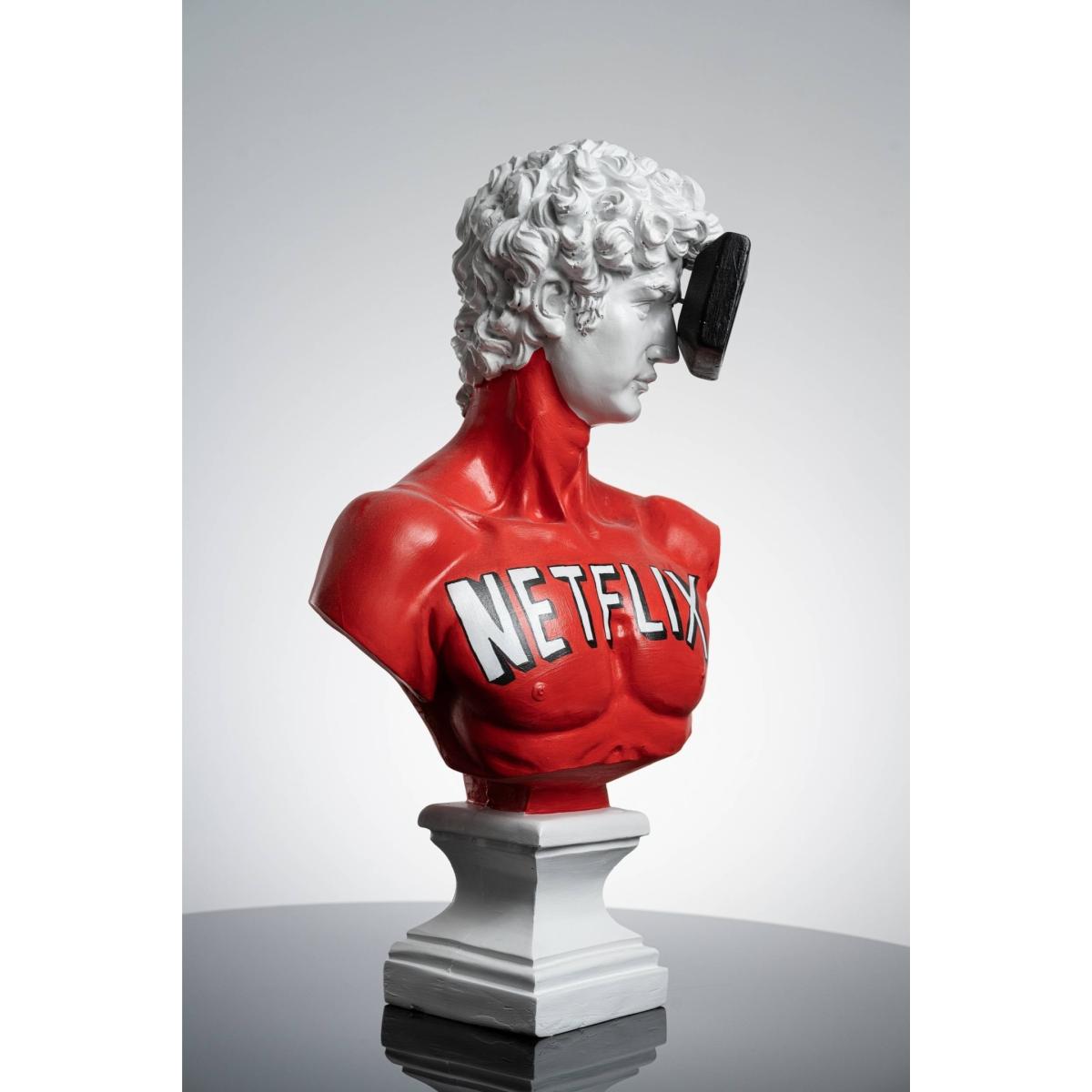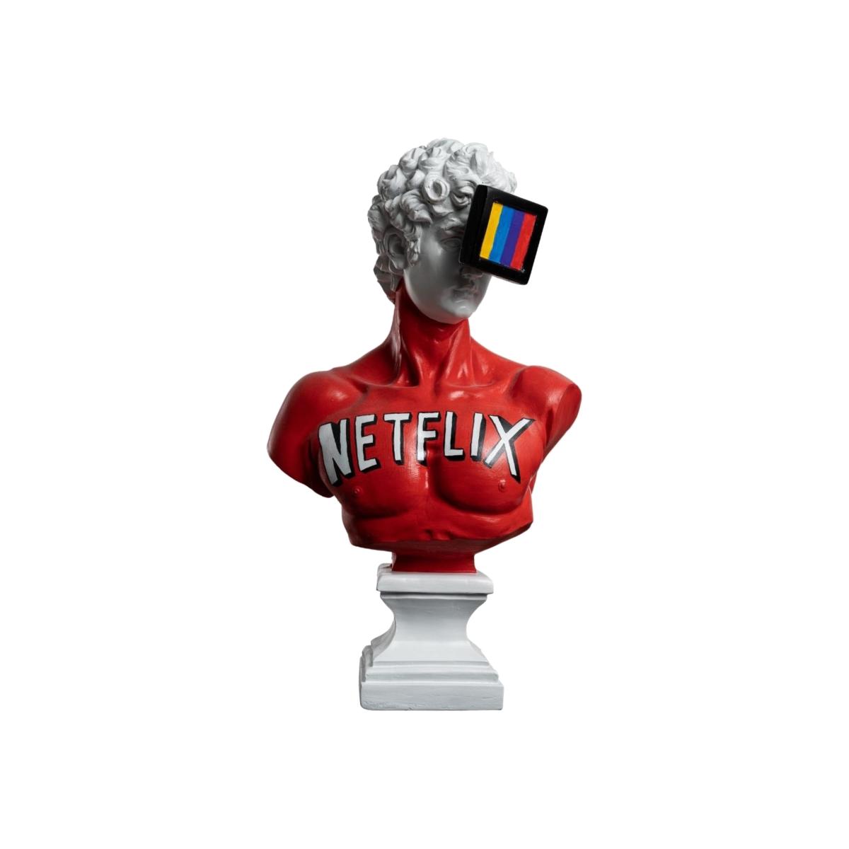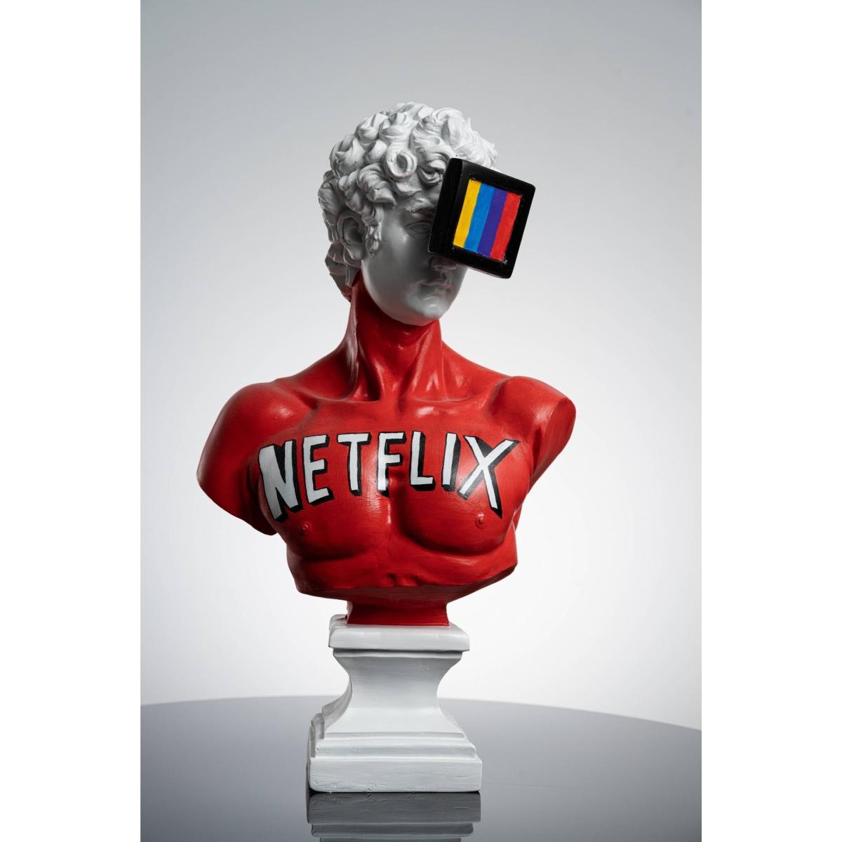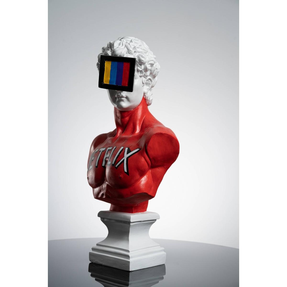 David’s torso bleeds with Netflix. His eyes are deprived of gaze. Has this Biblical underdog warrior lost its strength and sharpness to binge-watching? Would the great king himself succumb to the magnet of modern technology had he lived today? Would he be able to defeat Goliath while craving for yet another part of the Tinder Swindler? If you are a person soaked in television but at the same time, have great ambitions in personal life, this handmade sculpture where the artist contrasted the Renaissance canon of workmanship with the vivid colors of today, will always remind you to stay conscious. This bust will add a vibrant energy to your home or office space to remind you of the benefits and ills of novelty and the ever-present risk of addiction.