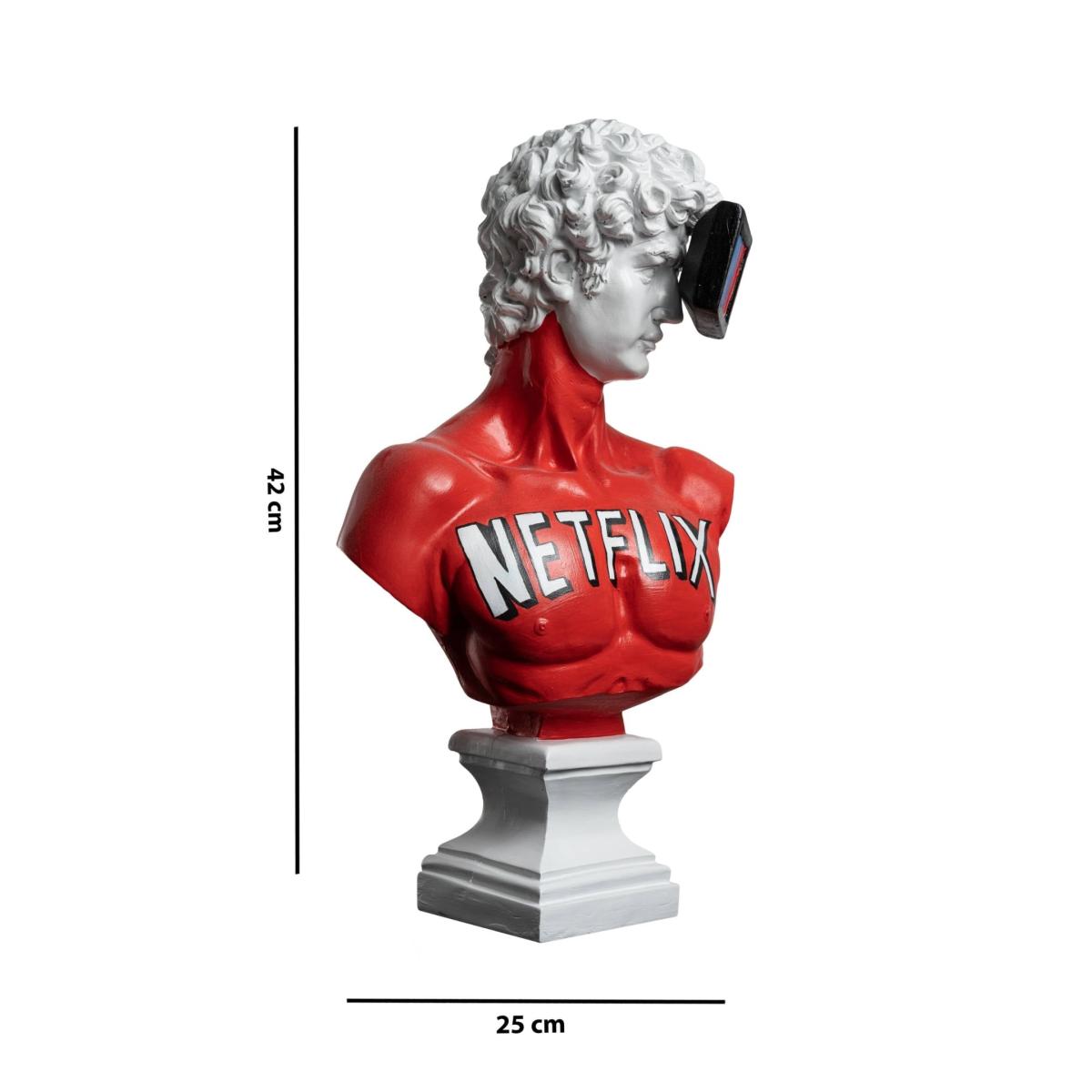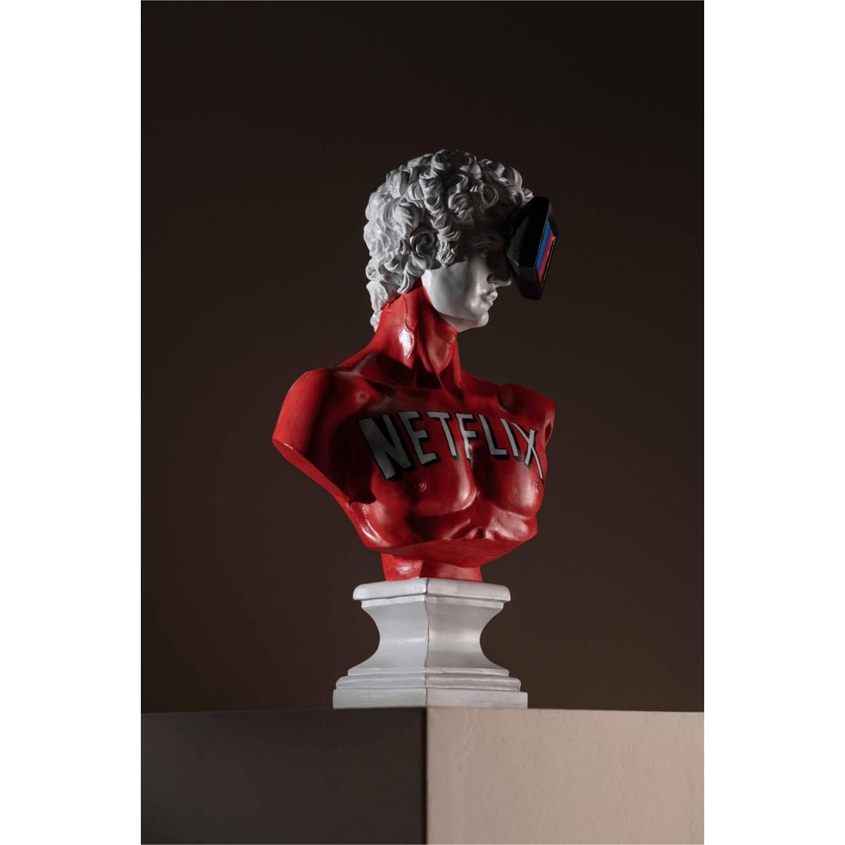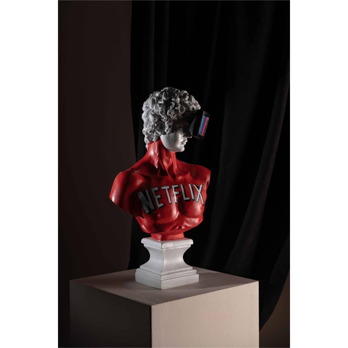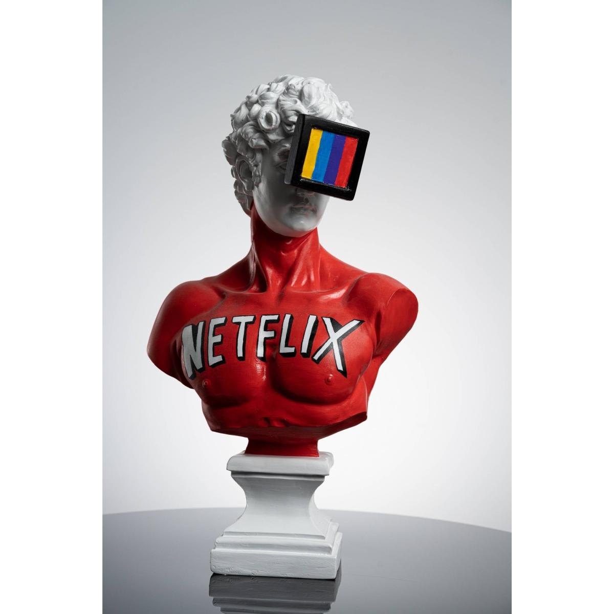 David’s torso bleeds with Netflix. His eyes are deprived of gaze. Has this Biblical underdog warrior lost its strength and sharpness to binge-watching? Would the great king himself succumb to the magnet of modern technology had he lived today? Would he be able to defeat Goliath while craving for yet another part of the Tinder Swindler? If you are a person soaked in television but at the same time, have great ambitions in personal life, this handmade sculpture where the artist contrasted the Renaissance canon of workmanship with the vivid colors of today, will always remind you to stay conscious. This bust will add a vibrant energy to your home or office space to remind you of the benefits and ills of novelty and the ever-present risk of addiction.