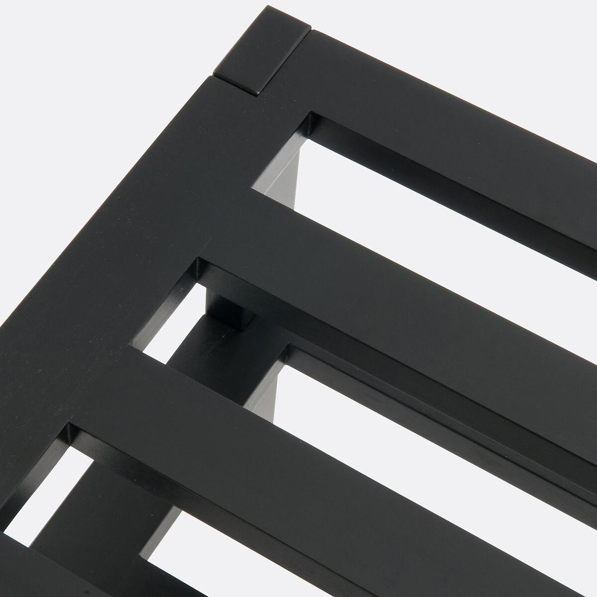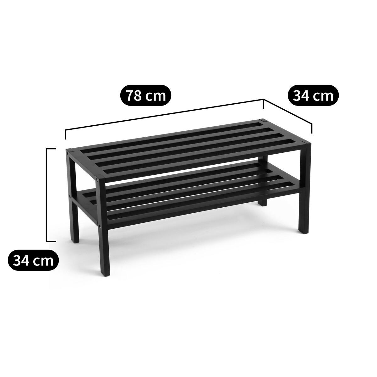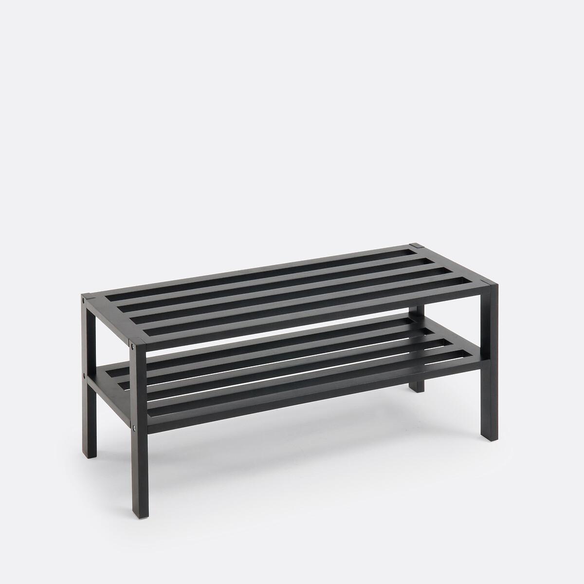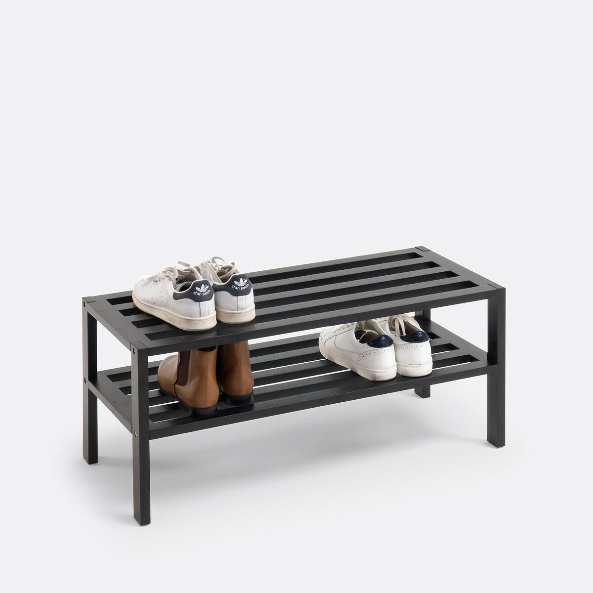 The shoe rack in black birch features 2 shelves. Thanks to its small depth (34 cm), it can be placed anywhere, even in a closet!Product Details • Solid birch with NC finish, black. • Seat and slatted top to store bags, accessories, shoes. • Capacity: 3 pairs of shoes per shelf (size 38, without heel and not high).Dimensions • Length: 78cm. • Height: 34cm. • Depth: 34cm. Dimensions and weight of parcel1 parcel • L86 x H10 x D40cm • 5.6kg