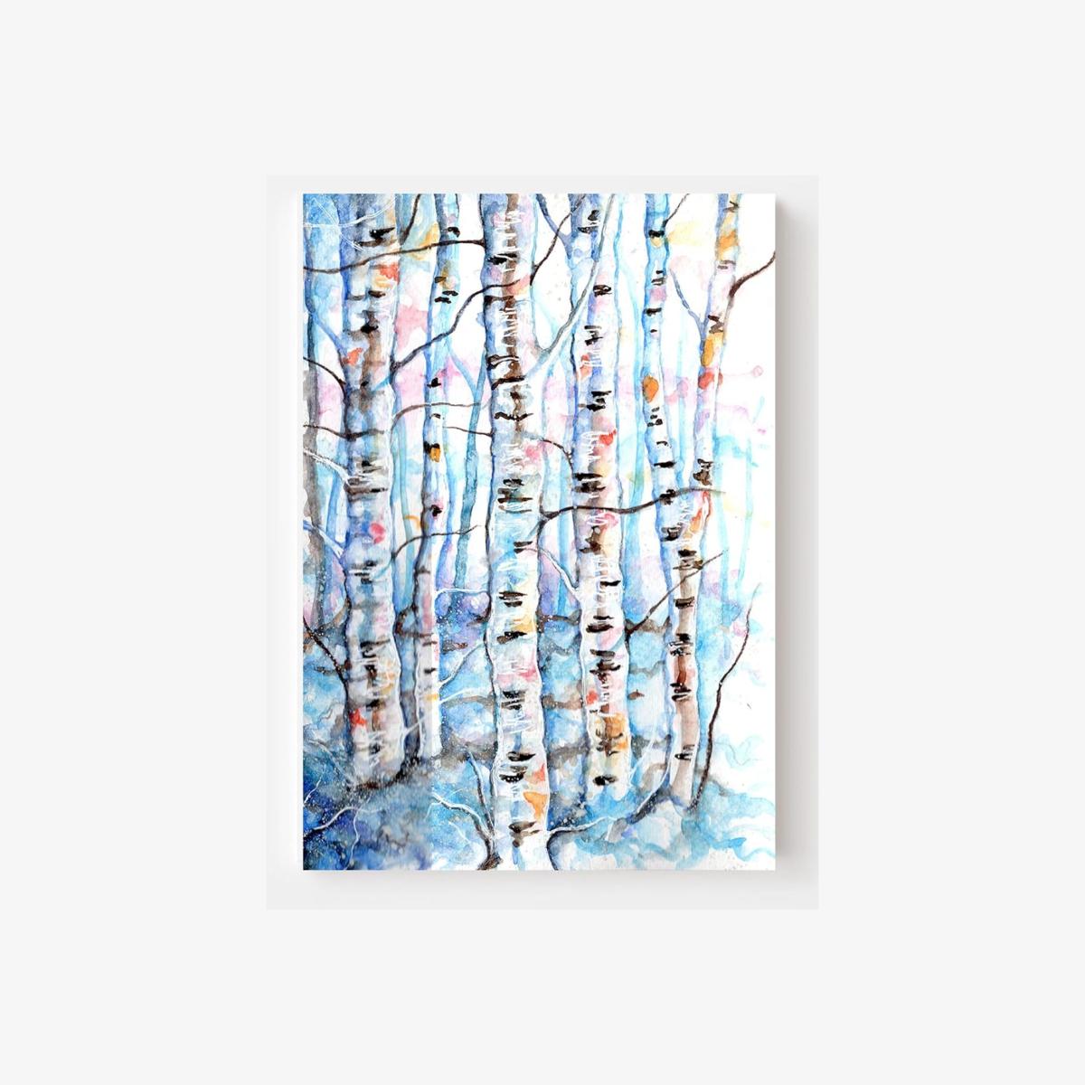 This charming modern watercolor painting of a wood of silver birch trees will add warmth and beauty to your home. The original artwork was created using professional grade watercolors, capturing the delicate shades and textures of the birch trunks and foliage. Now, the design has been faithfully reproduced as a high quality print on thick, matte polyester canvas, preserving the subtle details. For an elegant finishing touch, the canvas print has been professionally mounted to a solid pine wood frame, giving it lovely three dimensional quality. Available in various sizes, this canvas mounted will draw attention without overpowering the space. Display it in your living room, bedroom or office to add a touch of nature's peaceful beauty.