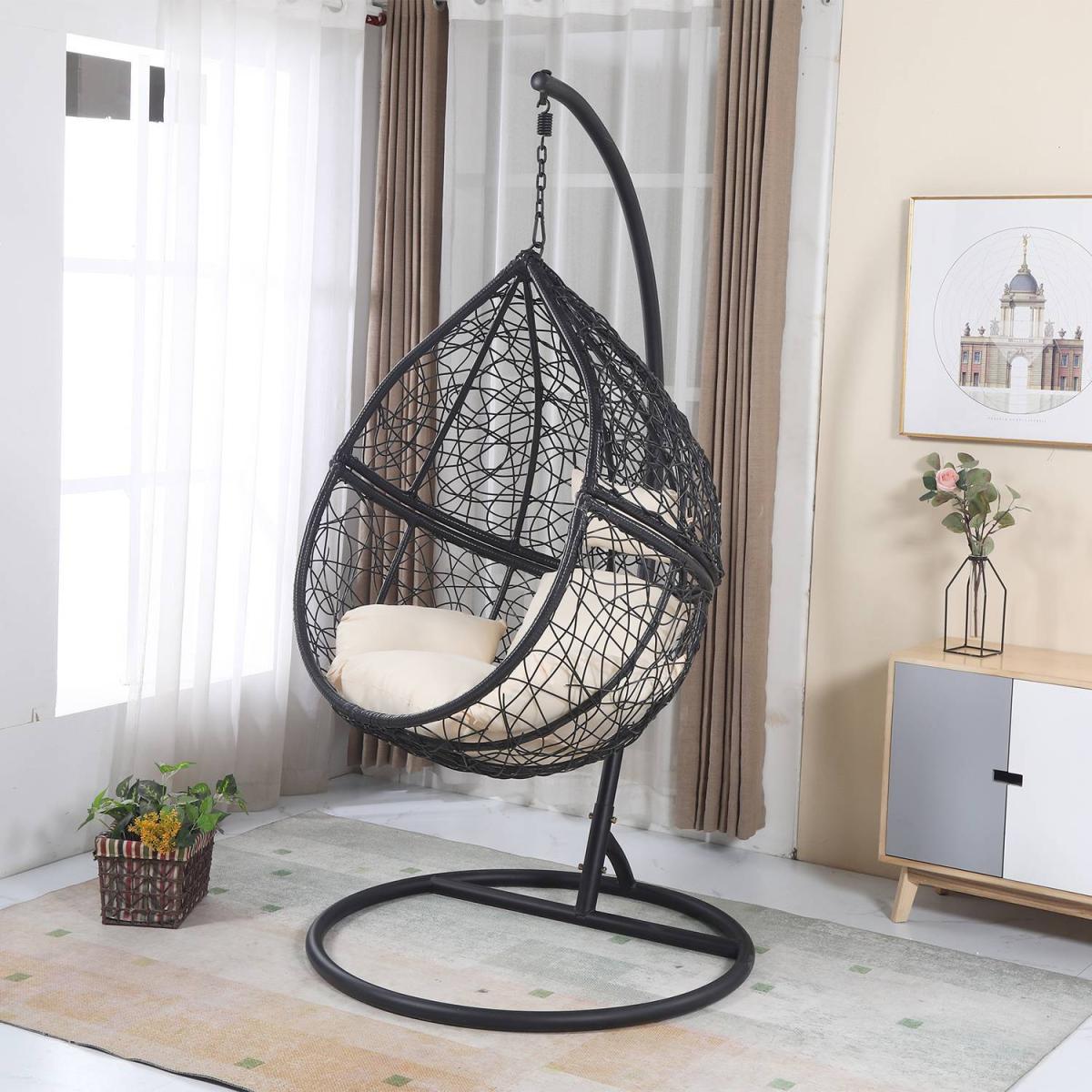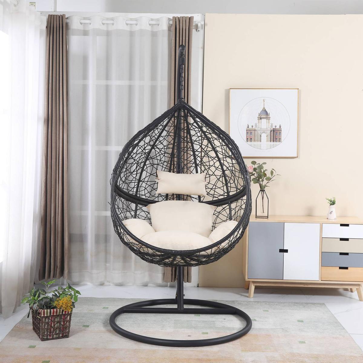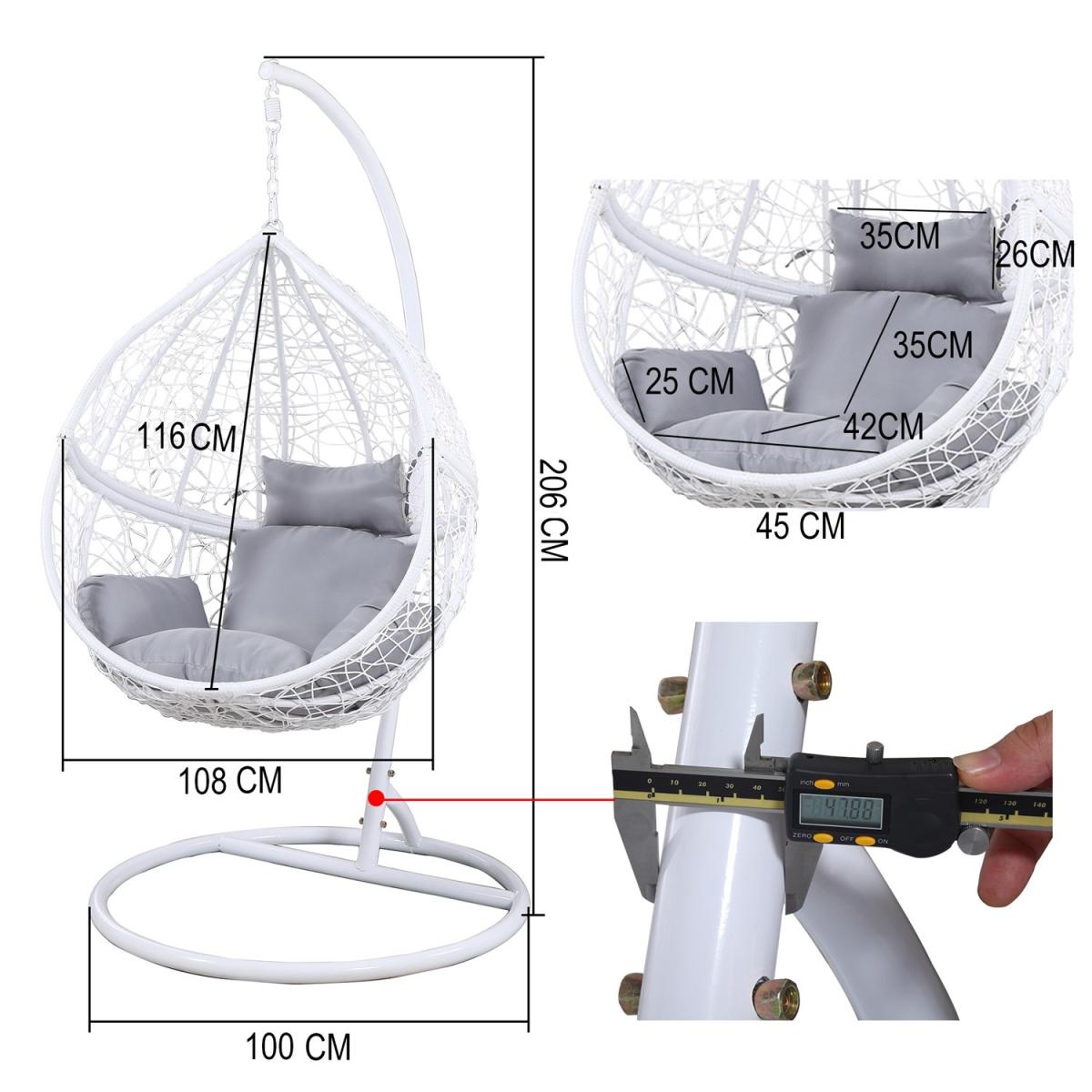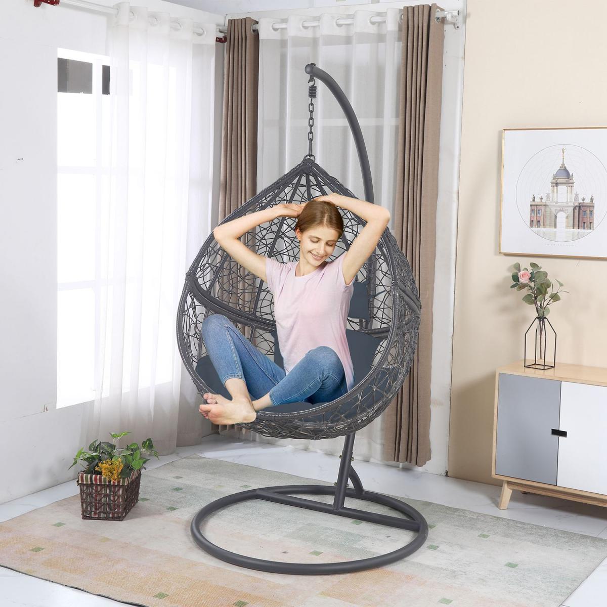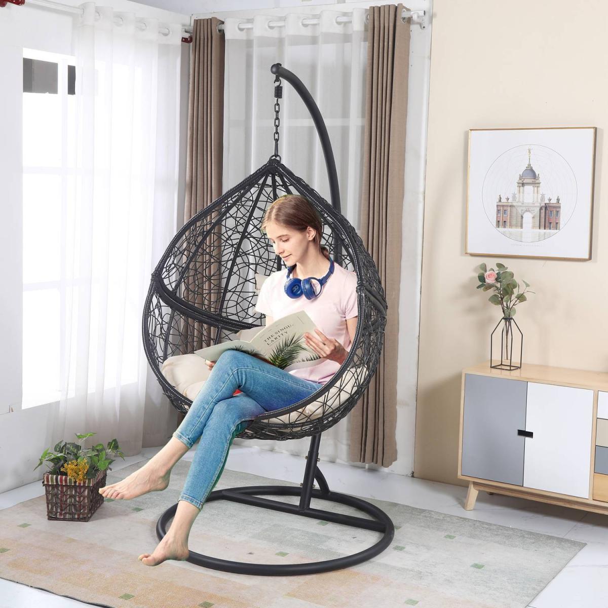 This rattan swing chair is made of strong and high-quality PE, Polyester and Iron material, sturdy and durable to use. Egg shape design makes the rattan swing chair more adorable and can bring a lot of vitality. The stylish and fashionable design perfectly decorates your garden and also adds a touch of elegant charm to your life. It comes with detailed instructions for quick easy assembly. Perfect for Outdoor or indoor relaxation.