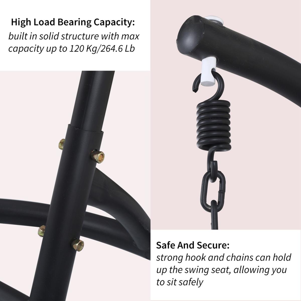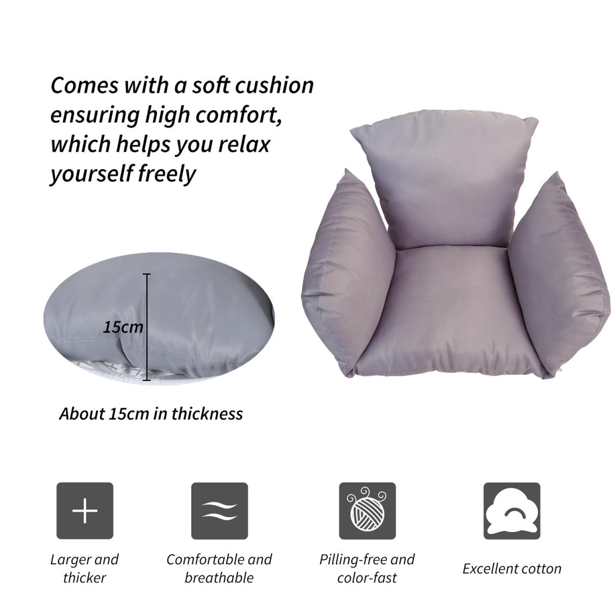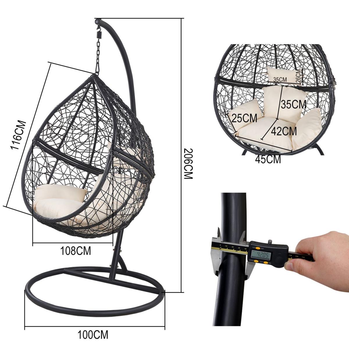 This rattan swing chair is made of strong and high-quality PE, Polyester and Iron material, sturdy and durable to use. Egg shape design makes the rattan swing chair more adorable and can bring a lot of vitality. The stylish and fashionable design perfectly decorates your garden and also adds a touch of elegant charm to your life. It comes with detailed instructions for quick easy assembly. Perfect for Outdoor or indoor relaxation.
