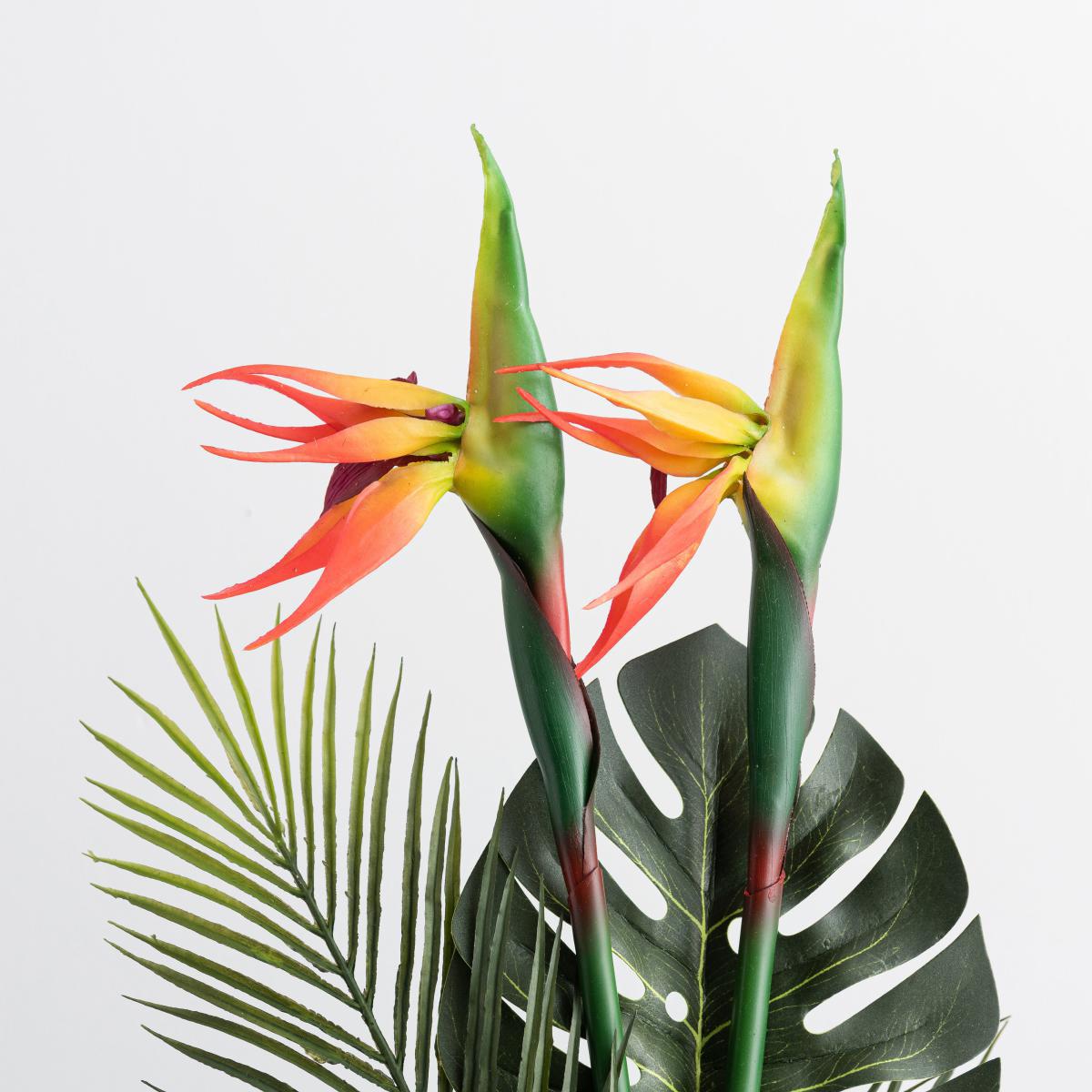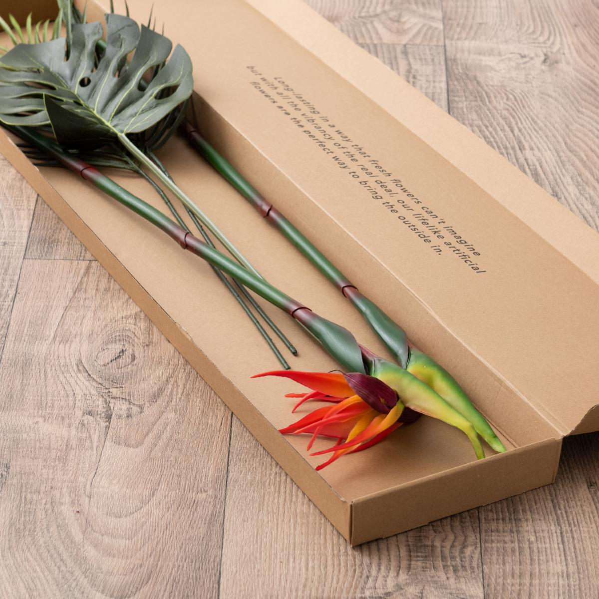 A beautiful tropical bouquet featuring bird of paradise and palm faux flowers. The bouquet is made from individual stems that can be arranged to preference, either by cutting it down to suit smaller vases, adding in real flowers or splitting across multiple vessels. The faux flowers are longer lasting than real flowers with no maintenance required. Conveniently packaged in a box specifically designed to fit through a letterbox, our letter box bouquet makes the perfect gift. Just confirm the delivery address has a standard sized letter box with 1m of space behind it to ensure a successful delivery.