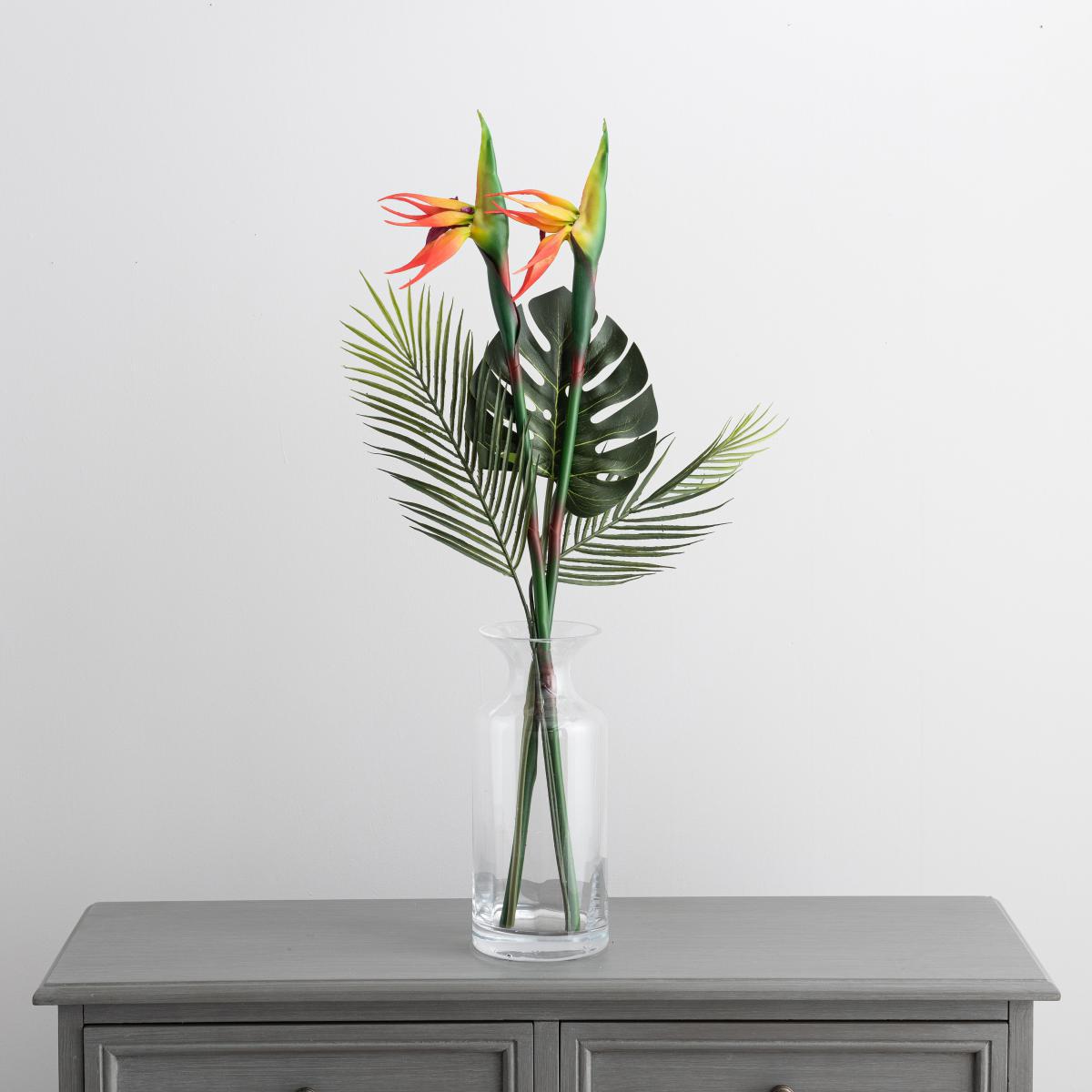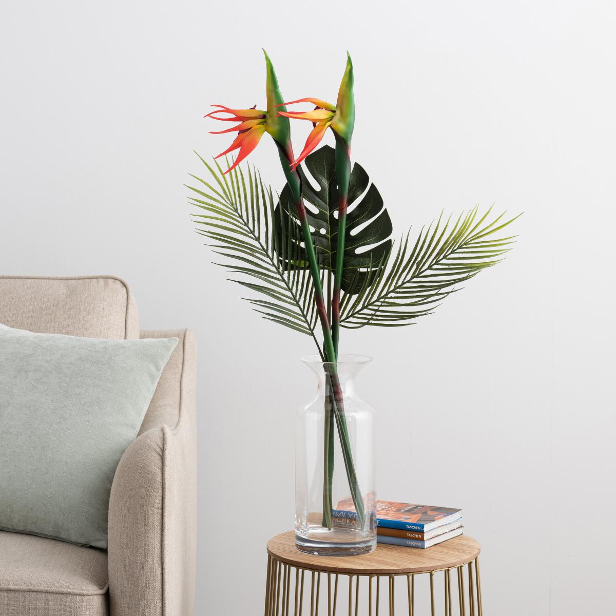 I love this bunch for adding a touch of tropical vibrancy without the fuss of real plants. The Bird of Paradise and palm combo works particularly well in contemporary or minimalist interiors, where it brings a fresh splash of colour and a hint of nature. It’s ideal for accenting neutral palettes or filling empty corners, shelves, or side tables. Practical styling tips include placing it in a clear vase on a side table or console to keep the look light and airy, or using multiples in different heights to create a more dramatic centrepiece. Given it’s artificial, it’s a no-maintenance option that stays impeccable year-round, making it perfect for busy spaces or those lacking natural sunlight.