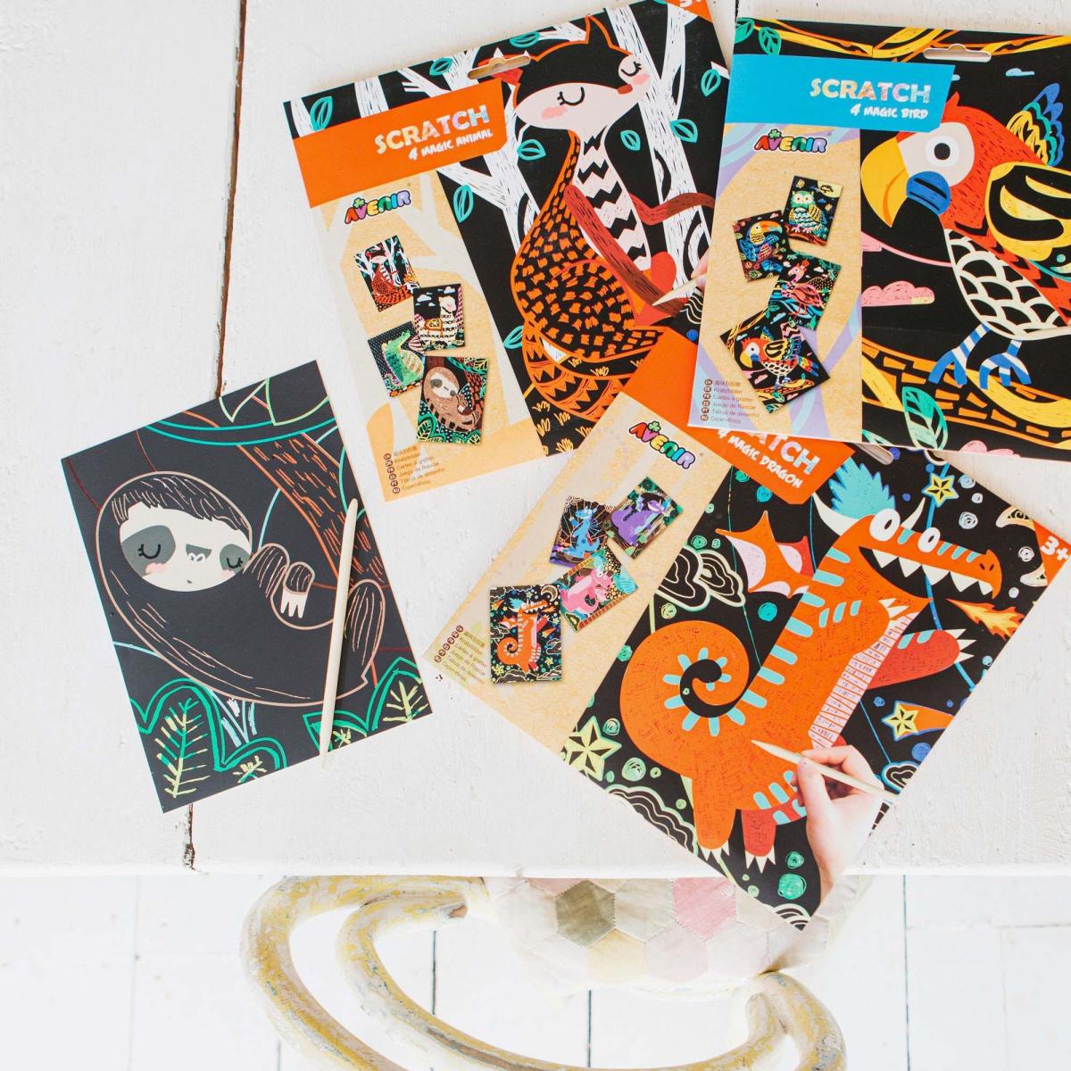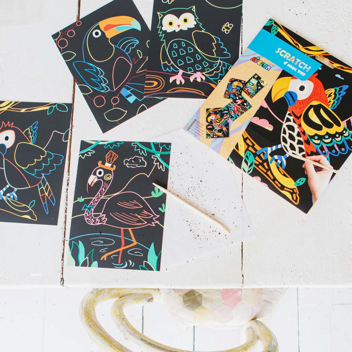 Scratch away the magic black paper to reveal four vibrant bird designs.
