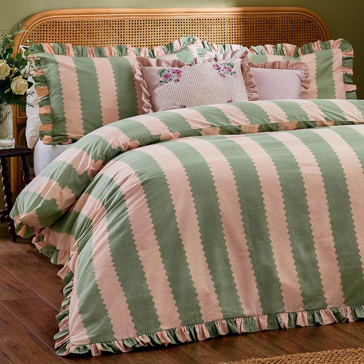 Bring a touch of elegance to your bedroom with the Birdie Stripe Ruffle Duvet Cover Set. Crafted from cotton-rich fabric with a 180 thread count, this duvet cover set offers a blend of comfort and style. The delicate ruffle trim nods to British heritage while adding a subtle hint of cottagecore charm. Its double-sided design features classic stripes on both sides, offering versatility to match your décor. Designed for those who appreciate classic prints and patterns, this timeless bedding will become the centrepiece of your room, creating a serene retreat inspired by the natural world. Sizes Available:1 - Single (135x200cm)2 - Double (200x200cm)3 - King (230x220cm)4 - Super King (220x260cm)Composition: 60% Cotton 40% Polyester. This product will be dispatched by one of our trusted suppliers. You’ll be contacted by their selected courier about your delivery.