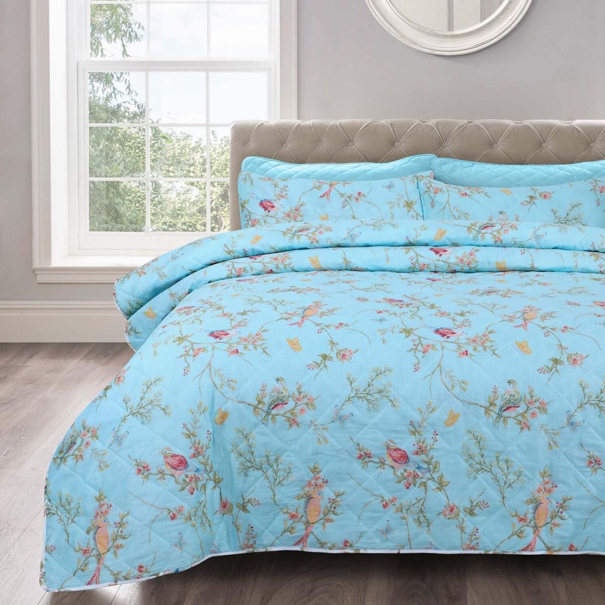 This exquisite bedspread set is crafted with a harmonious combination of 50% polyester and 50% polycotton, ensuring both durability and softness for a luxurious sleep experience. The stunning duck egg colour adds a touch of tranquillity and elegance to any bedroom decor. Designed with practicality in mind, the Birds Floral Bedspread Set is easy to care for, making it an ideal choice for busy individuals. It is machine washable, allowing you to effortlessly maintain its pristine appearance and freshness. The quilted construction enhances its visual appeal while providing a gentle cosy texture. With its lightweight design, this bedspread set offers comfort without compromising on warmth. It is perfect for year-round use, keeping you snug during colder nights and pleasantly cool in warmer seasons. The reverse side, crafted from 100% polyester, adds an extra layer of softness and ensures a comfortable sleep surface. The Birds Floral Duck Egg Bedspread Set is not just a functional bedding accessory but also an exquisite decorative piece. The delightful floral pattern featuring birds adds a touch of nature-inspired beauty to your bedroom. Transform your space into a serene sanctuary with this exceptional bedspread set, perfect for both contemporary and traditional aesthetics. Indulge in comfort and style with this remarkable addition to your bedding collection.