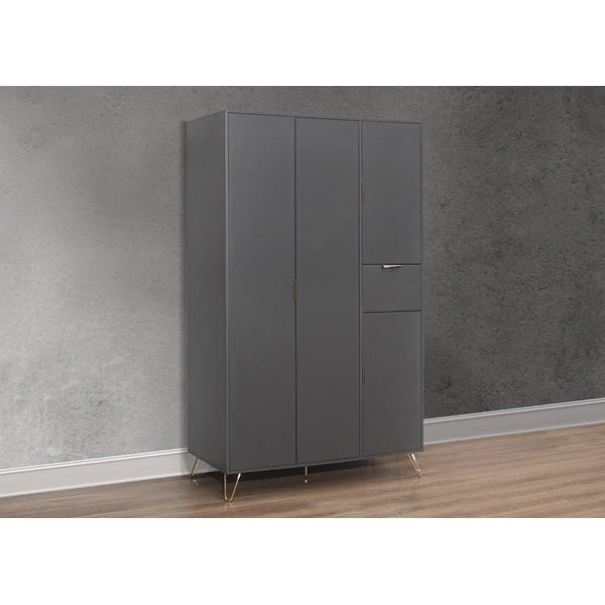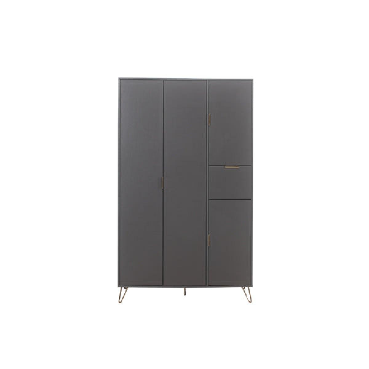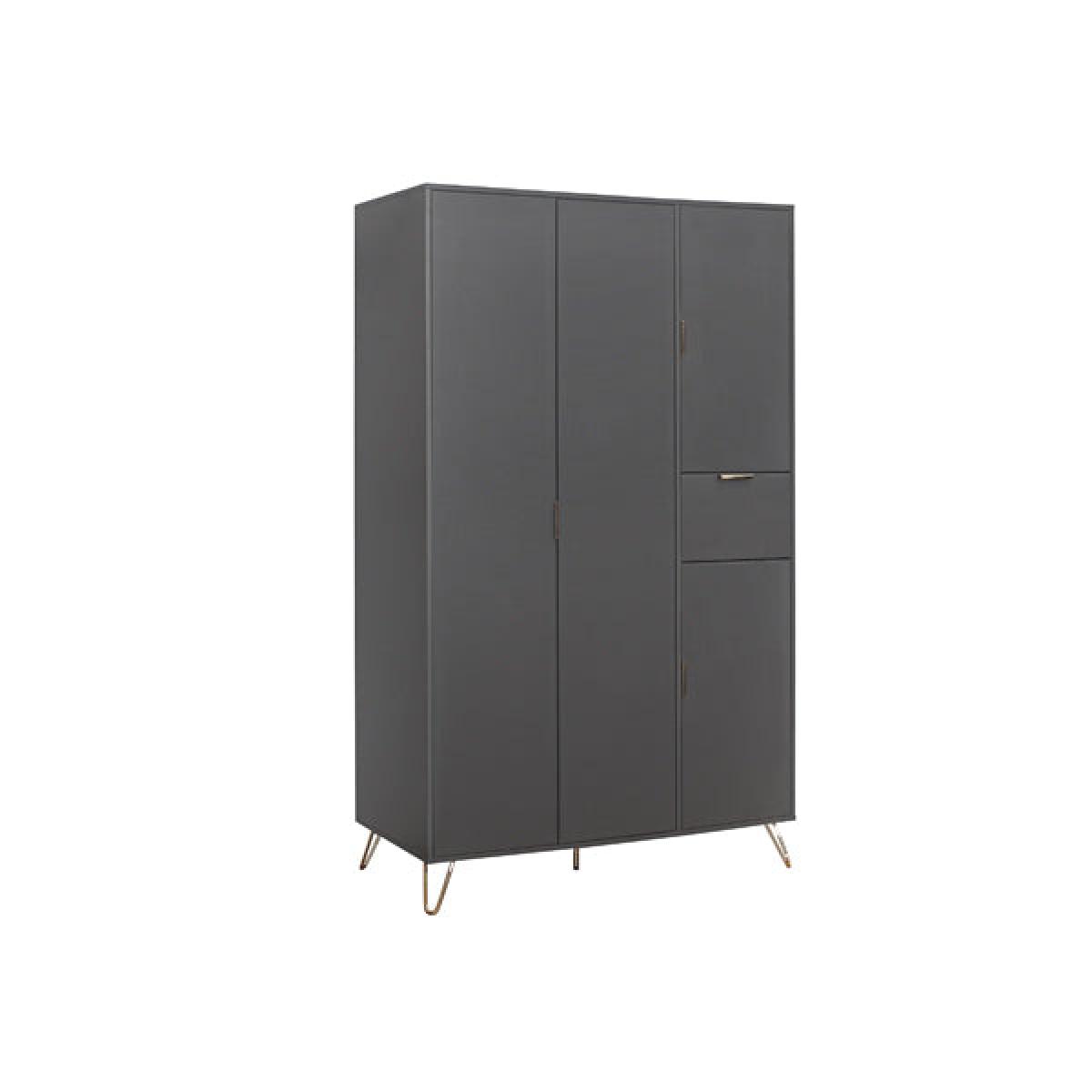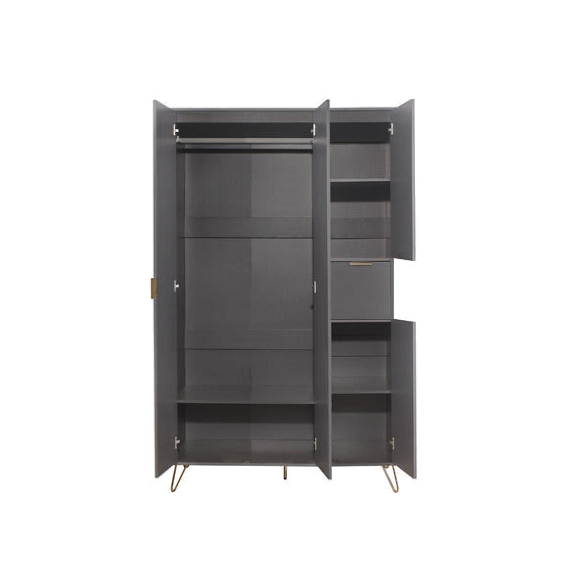 The Arlo's stylish matt grey finish brings a fresh and modern look to any bedroom. With a gold accent handle and hair pin legs this range is sure to impress. The Arlo's 4 door wardrobe offers ample space and features internal shelves along with a handy drawers for storing clothing and accessories. This versatile range is crafted from particle board with modern grey effect finish. Care instructions: Wipe carefully with a soft, dry cloth.