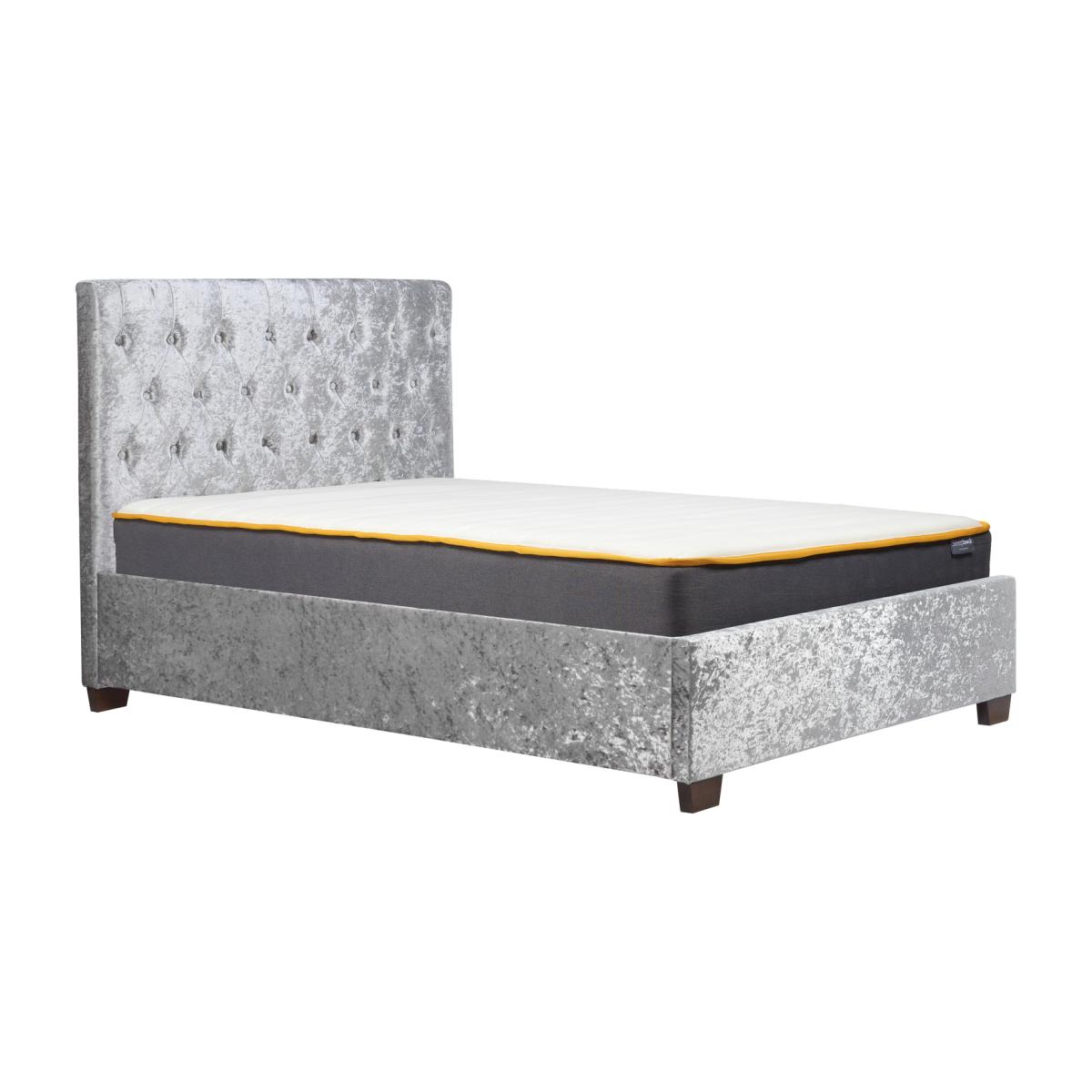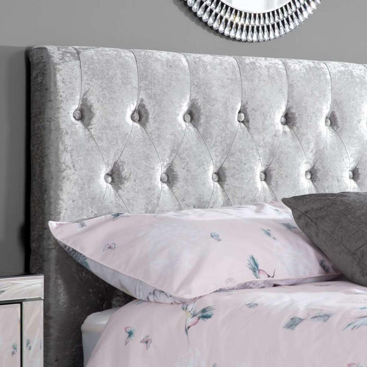 This fabulous contemporary bed frame will be focal point in any bedroom. The Cologne bedstead is upholstered in either a steel crushed velvet or a grey fabric and features a striking buttoned headboard. This frame has a sprung slatted base to give natural bounce, adjusting to where pressure is most exerted for greater comfort. Also available in an ottoman bed frame. The maximum weight load for the 4'6 frame is 300 kg, and the 5' frame is 400 kg. Please note Birlea beds are only suitable for a UK standard size mattress and the recommended maximum mattress height is 305 mm.