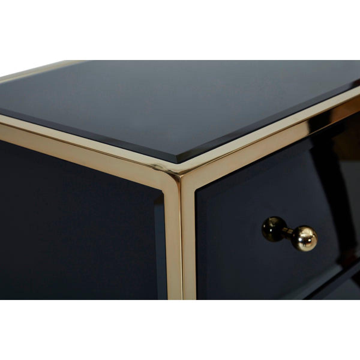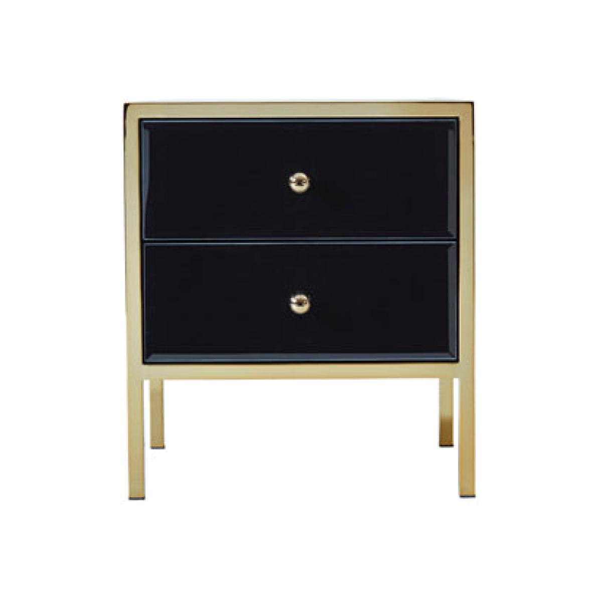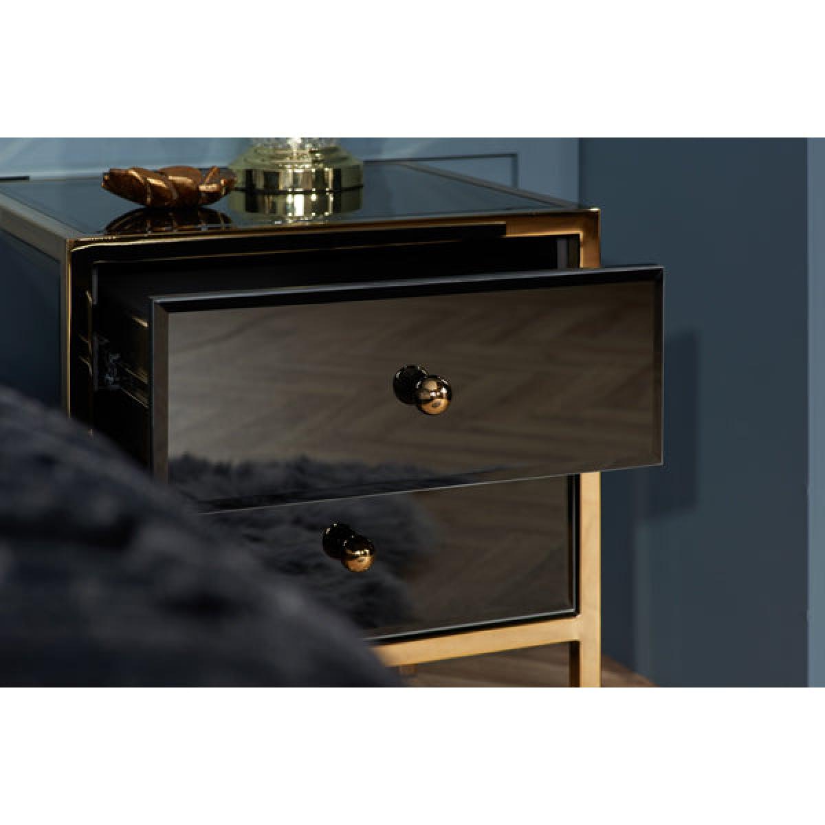 Our Fenwick range exudes glamour, charm and luxury. At home in any classic room, this stunning design demands attention thanks to its bevelled glass black panels and stunning gold frame. The Fenwick 2 drawer bedside features 2 spacious drawers providing plenty of storage space. This range is certainly eye catching and guaranteed to be suitable for most stores, showroom and online stores. Cleaning and Care: Wipe with dry cloth.