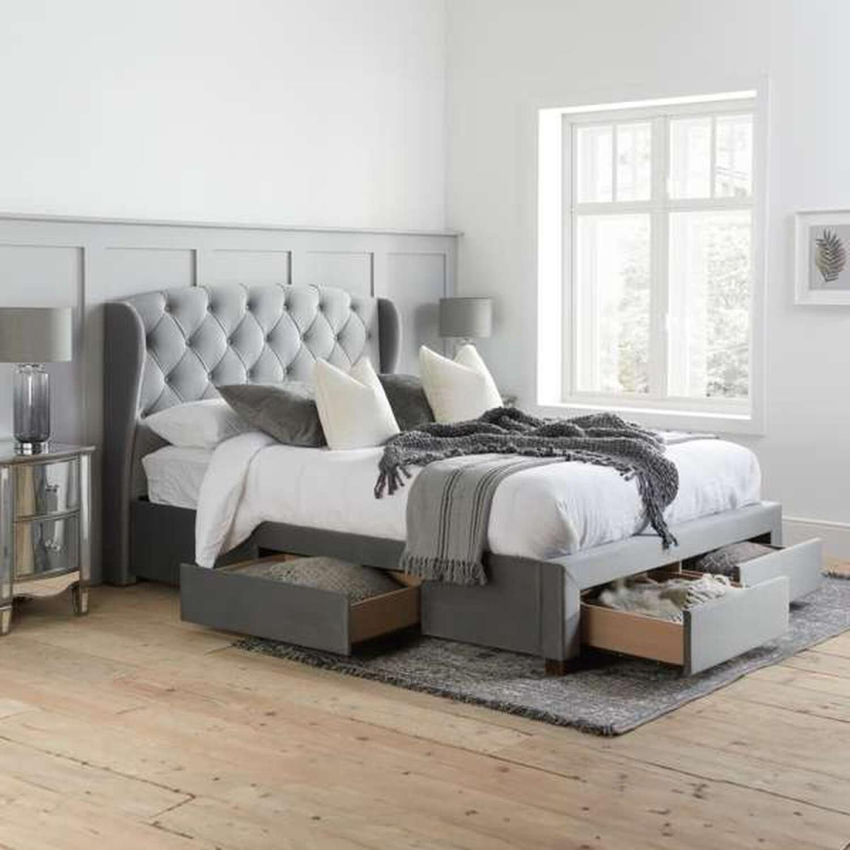 Make a grand style statement with this elegant and contemporary bed frame. Featuring a wingback headboard with tufted detailing and 4 drawers. Featuring a sprung slatted base to give natural bounce, this bed adjusts to where pressure is most exerted for greater comfort. Add a touch of elegance to any style bedroom with the Hope bed. The maximum weight load for the 4'6 frame is 300 kg, the 5' frame is 400 kg, and the 6' frame is 450 kg. Please note Birlea beds are only suitable for a UK standard size mattressand the recommended maximum mattress height is 3200 mm.