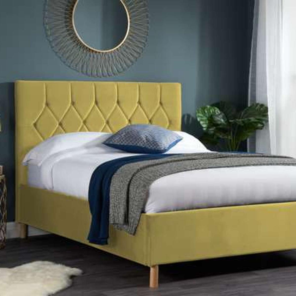 Modern and stylish the Loxley ottoman bed is upholstered in a beautiful fabric and is perfect for those who want to create a luxe look with the added benefit of extra storage. The Loxley bed frame is upholstered in polyester with complementary light feet and is available in mustard, grey, green and blue. This frame has a sprung slatted base with natural bounce, adjusting to where pressure is most exerted to provide greater comfort. The maximum weight load for this bed frame is 250kg. The recommended mattress height is 230mm. Please note Birlea beds are only suitable for a UK standard size mattress.
