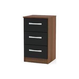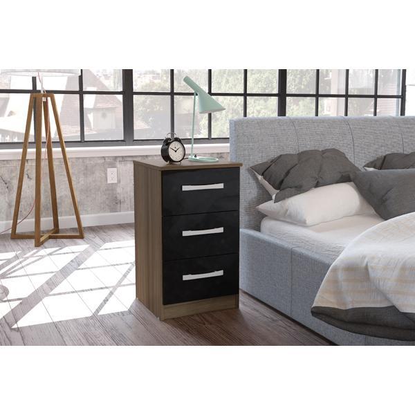 Modern and sleek, the Lynx 3 drawer bedside combines a high-gloss finish with bold silver detailing to make any space feel contemporary. Constructed from MDP (multiple density particleboard), this high-quality bedside is available in a choice of four high-gloss lacquer colour options: white & grey, black, white, or black & white, or alternatively there are an additional colour option combining high-gloss lacquered panels with walnut paper foil: walnut & black. The top panel of this bedside can support up to 5 kg of weight and each drawer can support up to 2. 5 kg.