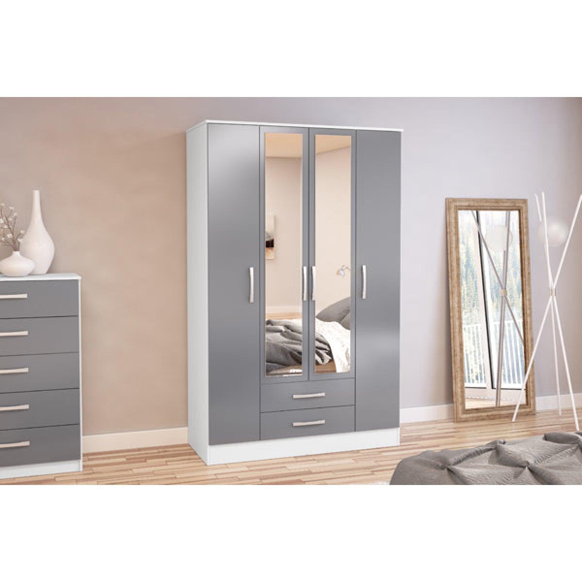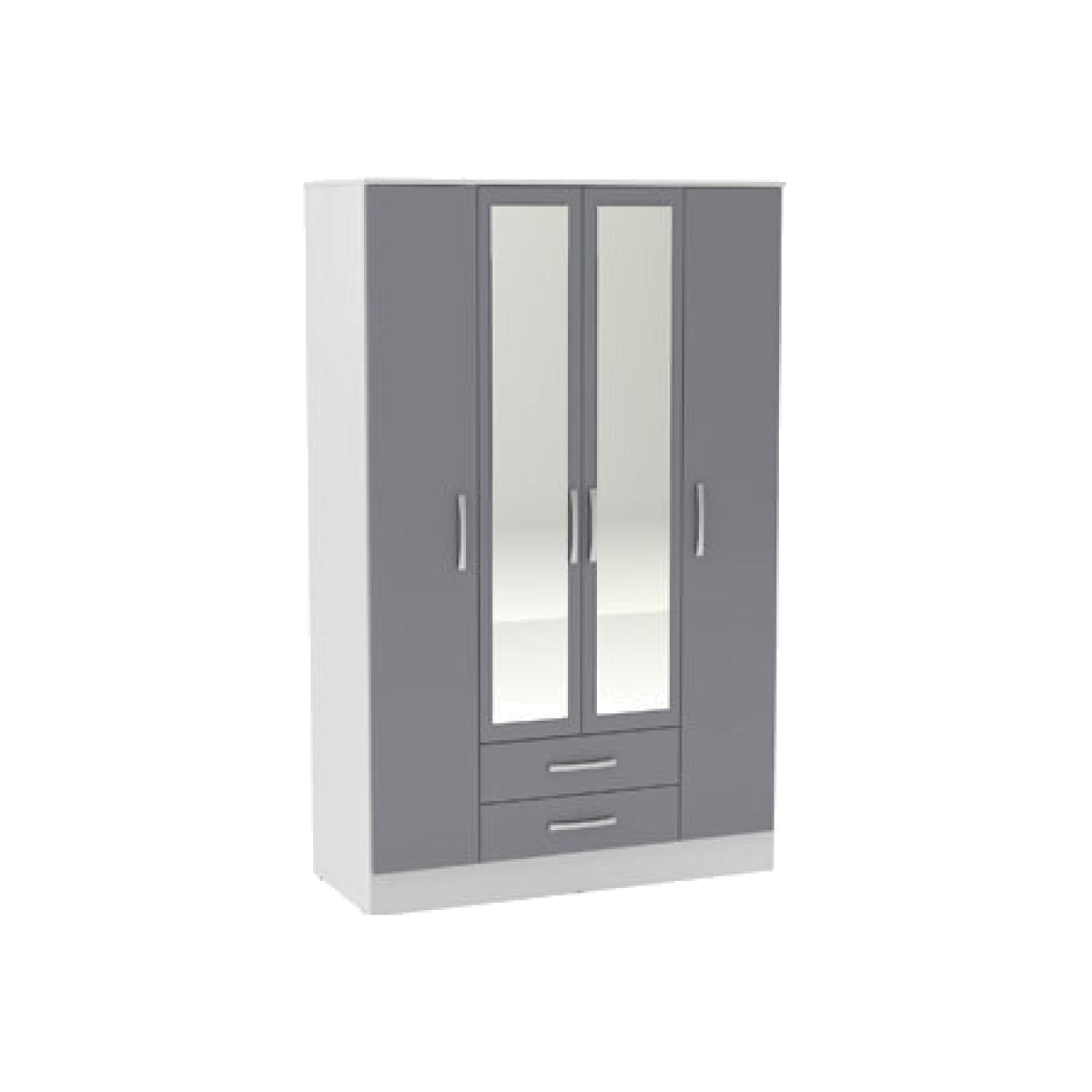 Modern and sleek, the Lynx 4 door 2 drawer wardrobe with mirror combines a high-gloss finish with bold silver detailing to make any space feel contemporary. Constructed from MDP (multiple density particleboard), this high-quality wardrobe features an internal top shelf for additional bedroom storage. The top shelf of this wardrobe can support up to 15 kg of weight and the hanging rail can support up to 12 kg. Each drawer can support up to 4 kg.