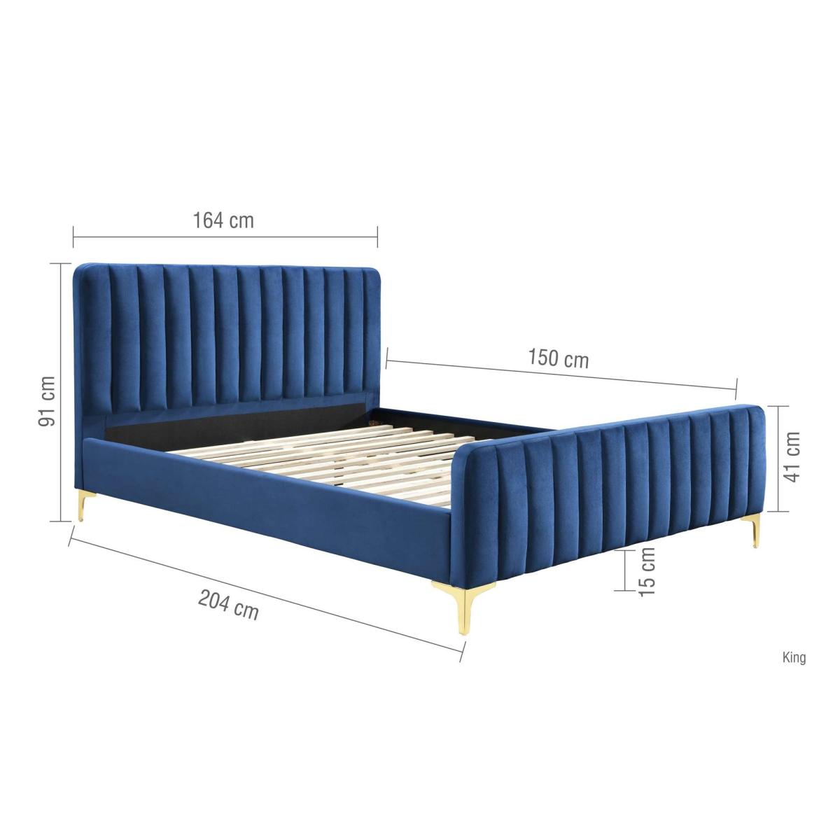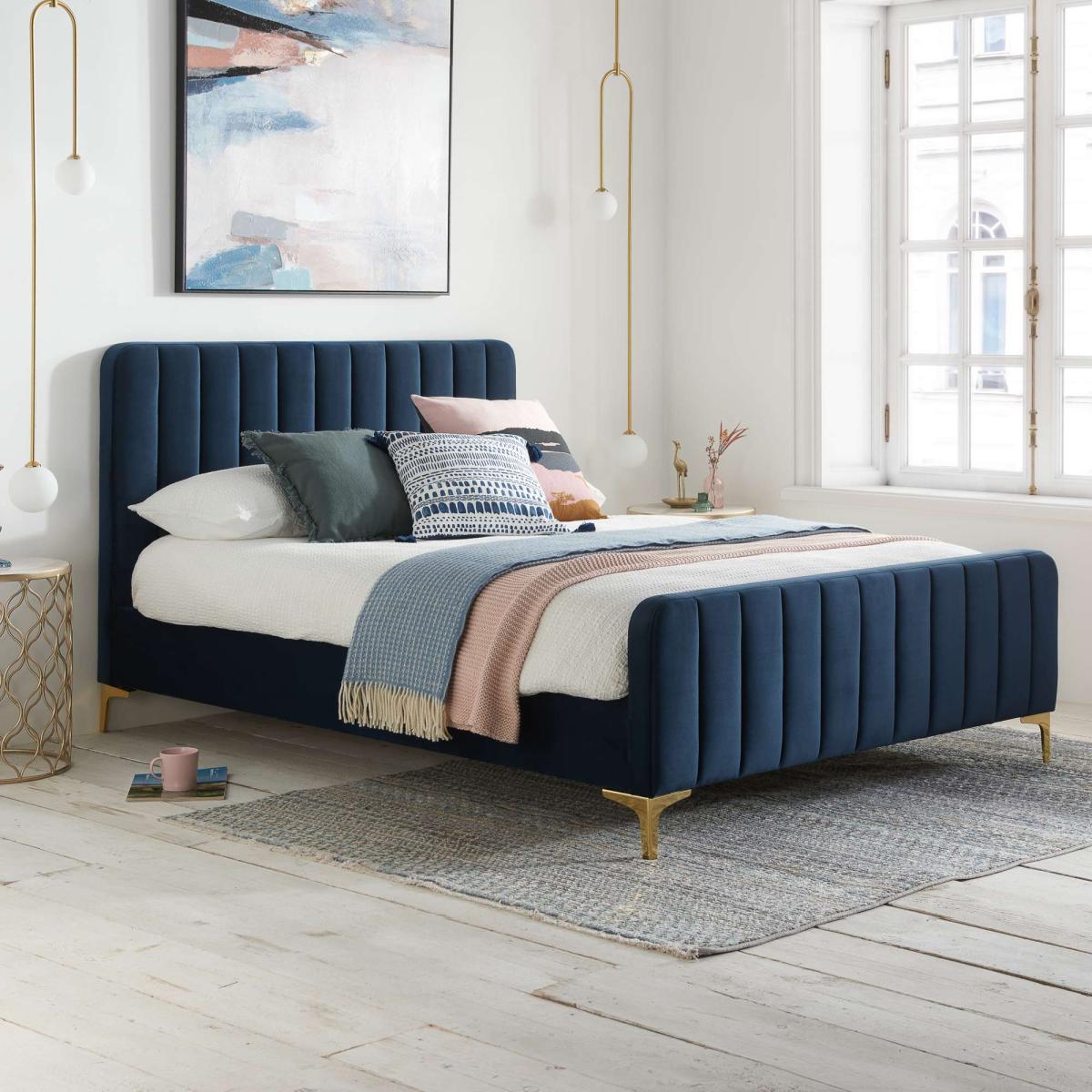I love this bed frame for its rich velvet finish and deep midnight blue colour, which adds a touch of elegance without feeling overly formal. It's a great piece for contemporary or luxe-influenced bedrooms, working well with both neutral tones and jewel-toned accents. To style it effectively, consider pairing it with crisp white or pastel bedding to create contrast, or go bold with patterned textiles for a more layered look. Since it's quite eye-catching, keep surrounding decor simple and minimal to let the bed be the focal point, and add metallic or glass accents to elevate the overall aesthetic. Practical tip: complement with cosy throws and cushions to soften the look and make it inviting.
