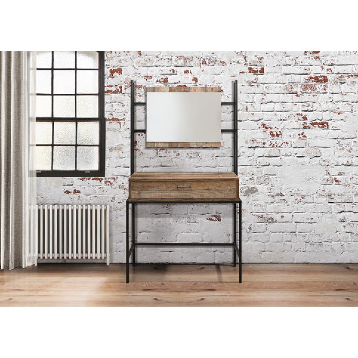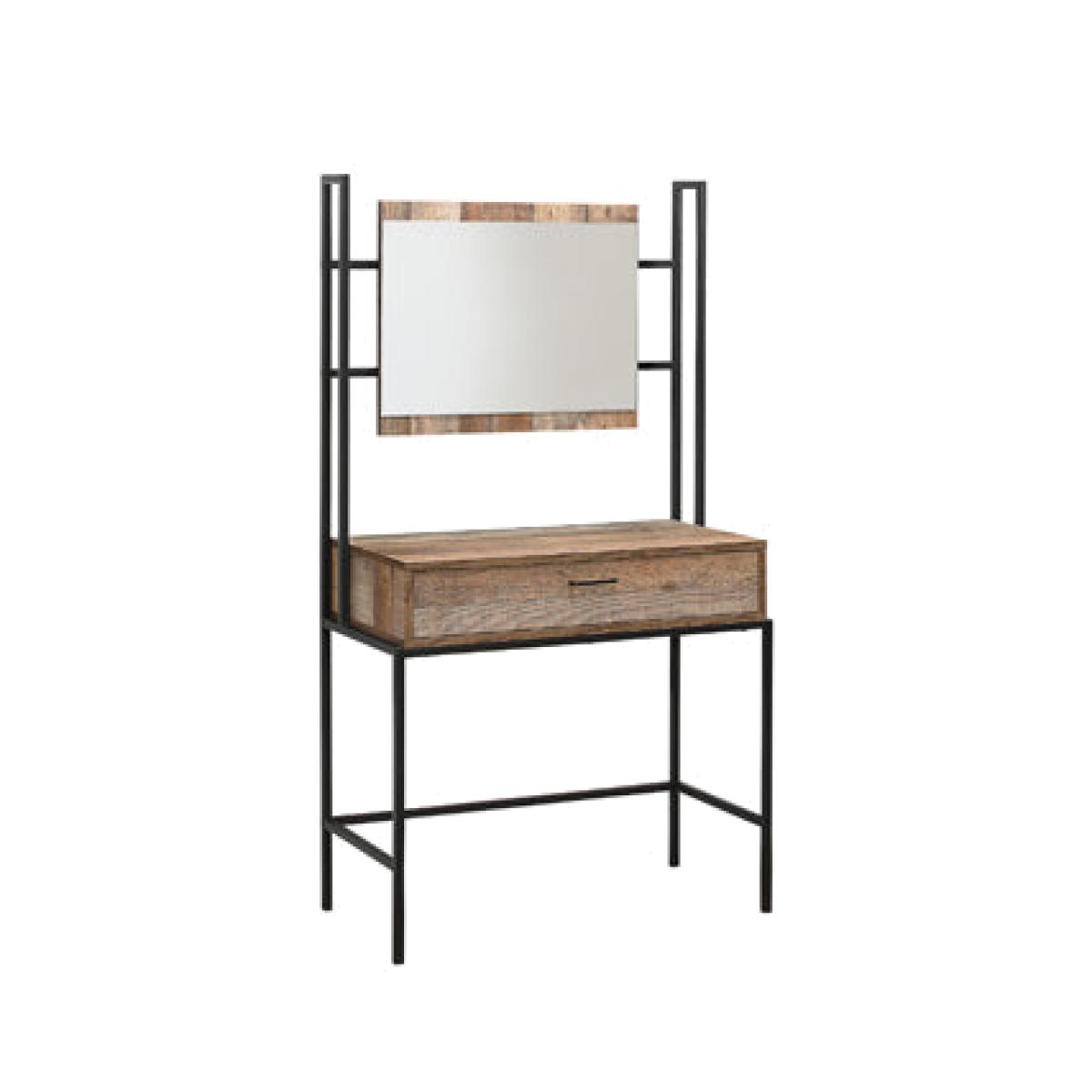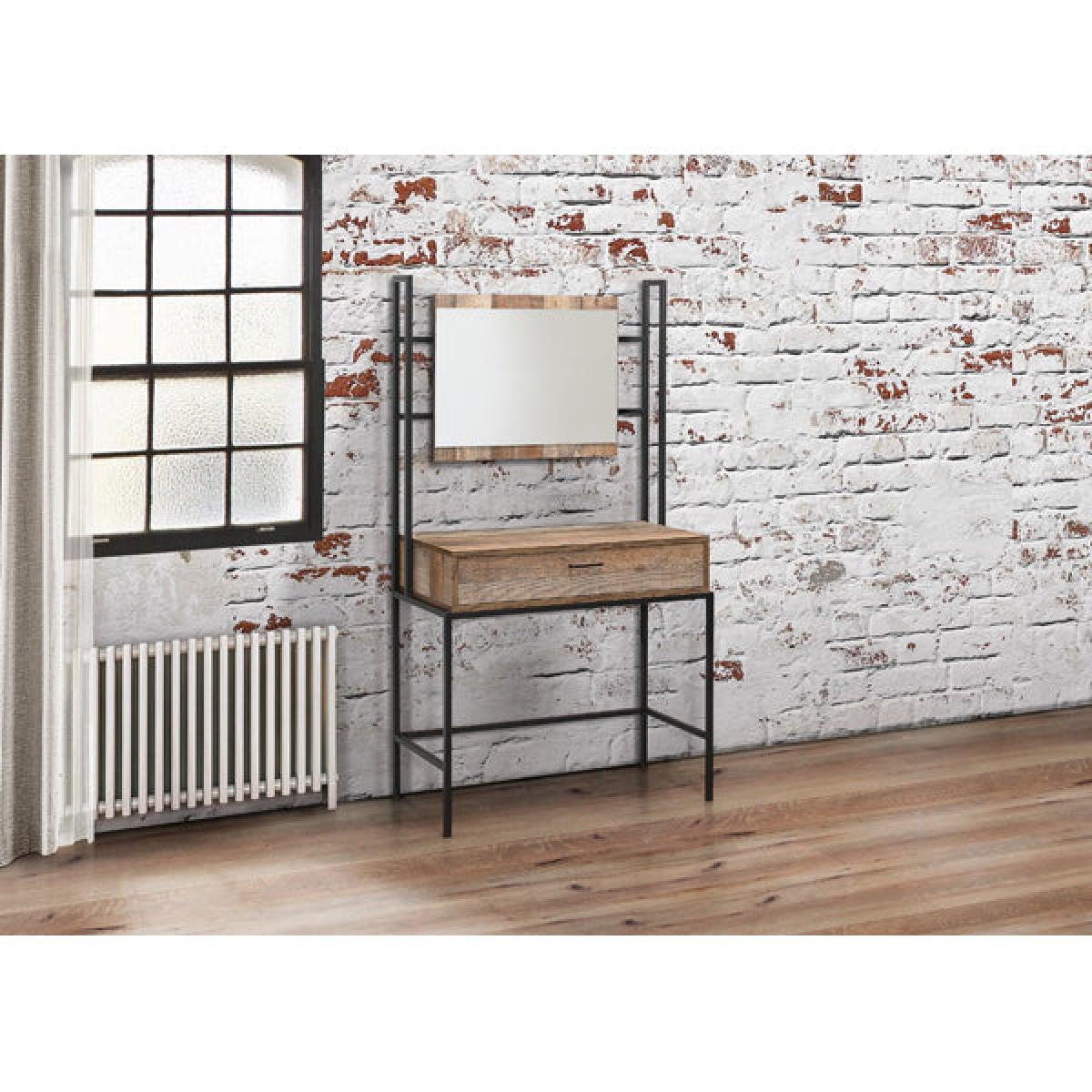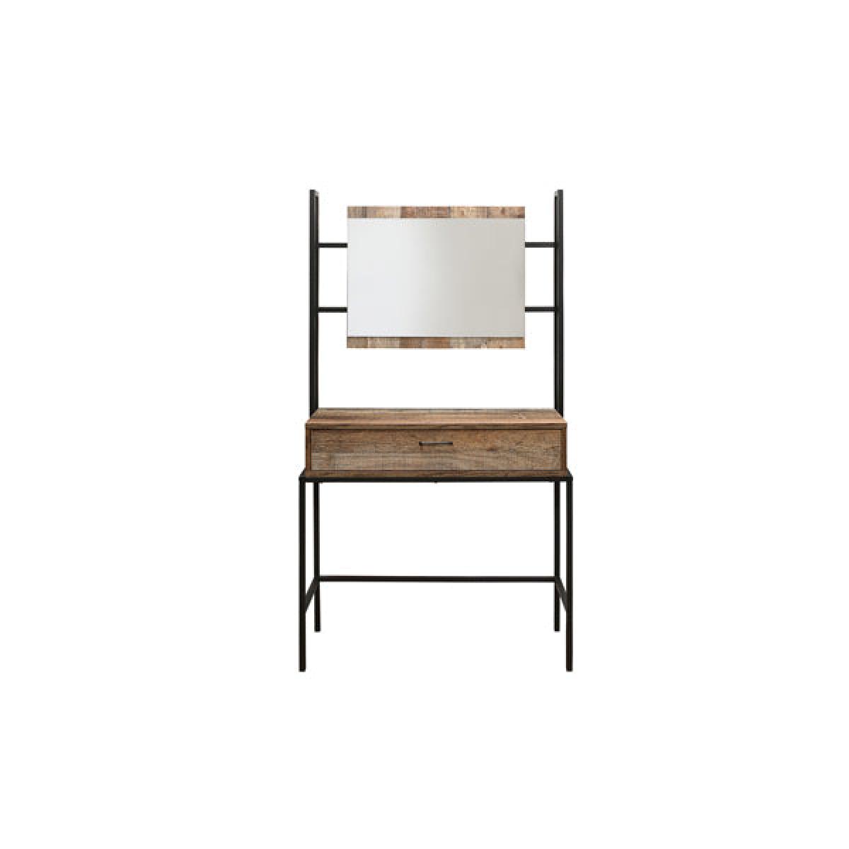 I love this dressing table because it combines rustic charm with a sleek, modern frame, making it versatile for various interiors. It works particularly well in industrial or minimalist spaces that want a touch of warmth, thanks to its natural wood finish. Practical styling tips include pairing it with a few simple accessories like a ceramic tray for jewellery, a small vase of fresh flowers, or classic glass jars for beauty essentials. Keep the colour palette neutral and consider contrasting textures, such as soft textiles or matte metals, to create a balanced look. The mirror's straightforward design makes it easy to incorporate into both contemporary and vintage-inspired bedrooms, offering both functionality and style without dominating the space.