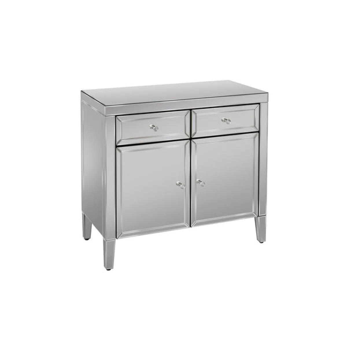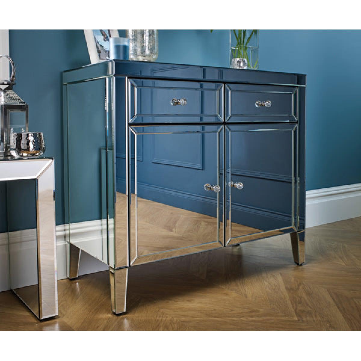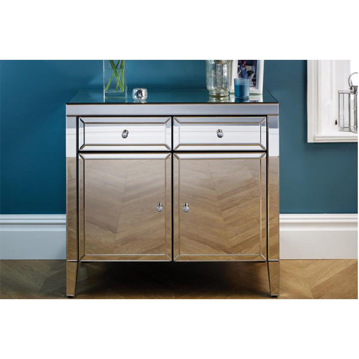 The beautiful and glamorous Valencia 2 drawer sideboard will be a stylish addition to any room. Constructed from a MDF frame this stunning range features a mirrored finish with bevelled edges and elegant mock crystal handles. Cleaning and Care: Wipe with dry cloth.