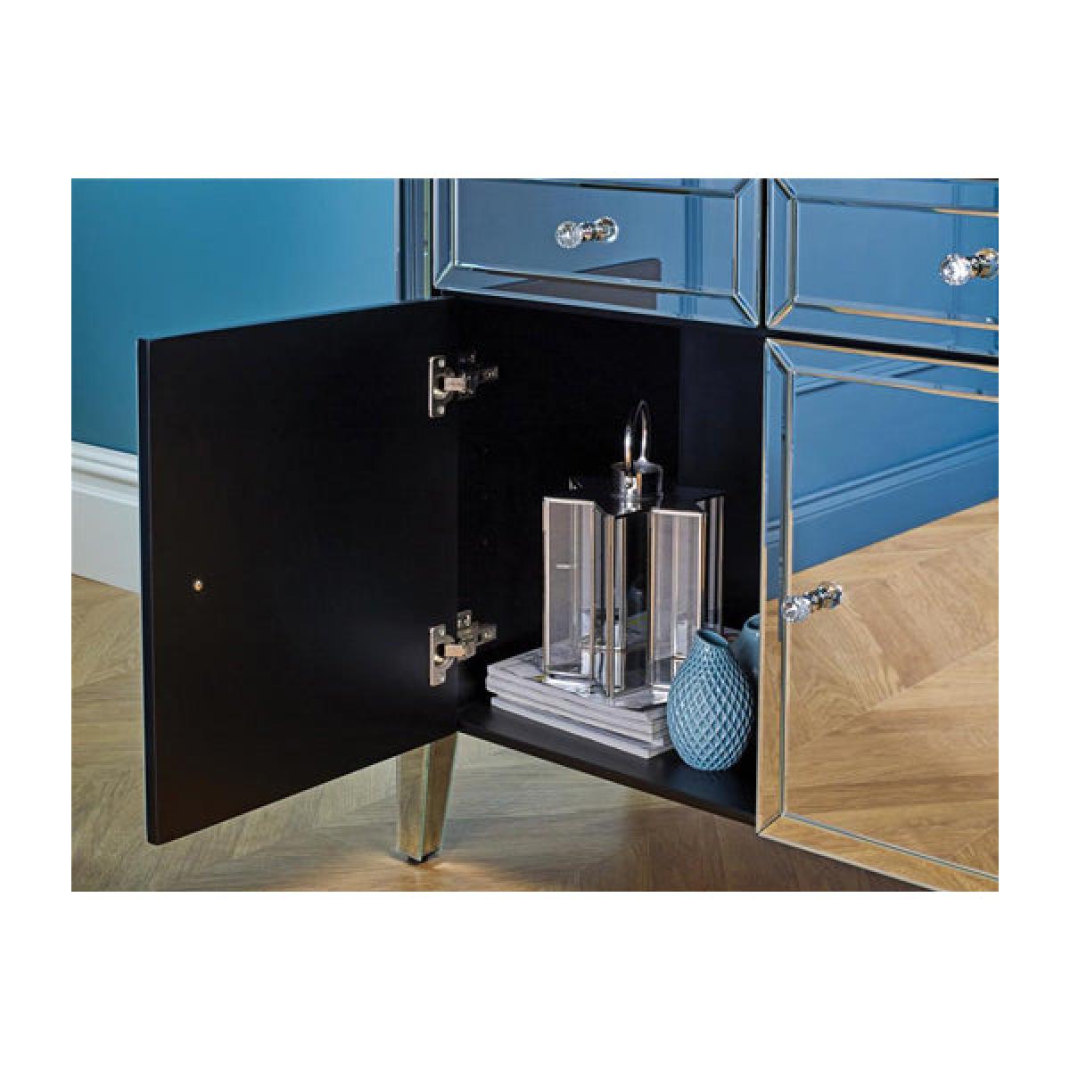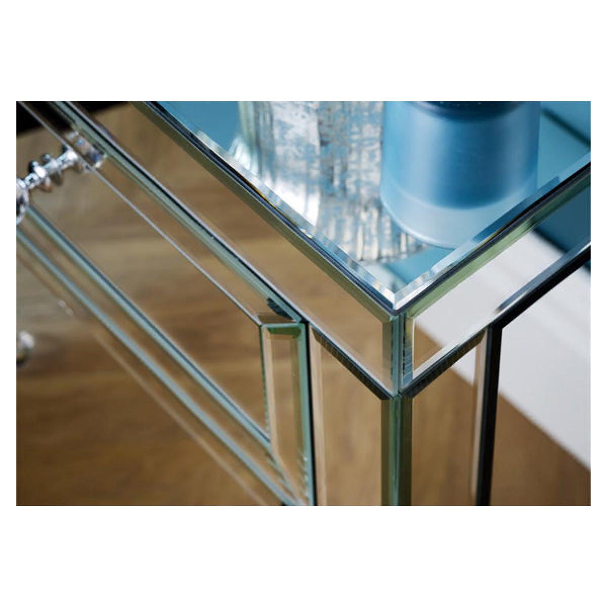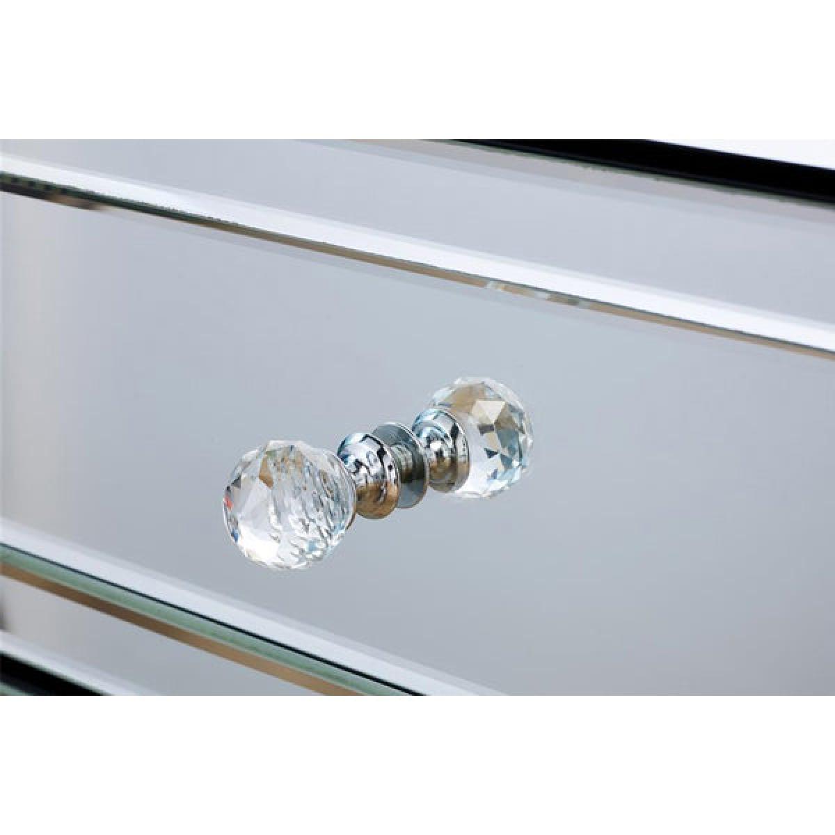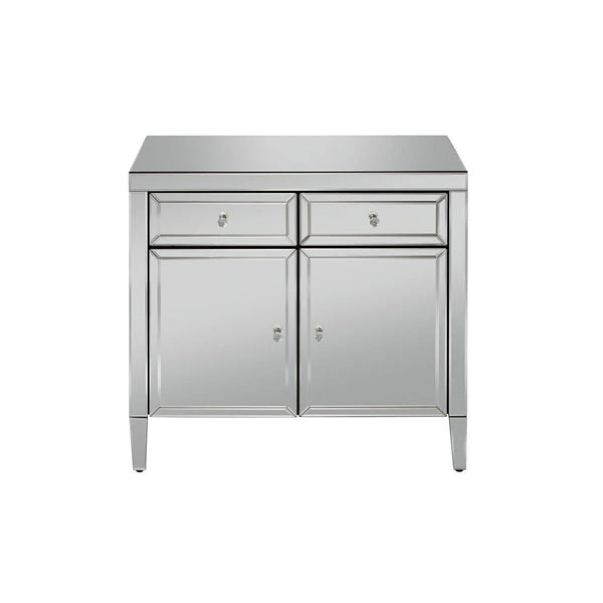 The beautiful and glamorous Valencia 2 drawer sideboard will be a stylish addition to any room. Constructed from a MDF frame this stunning range features a mirrored finish with bevelled edges and elegant mock crystal handles. Cleaning and Care: Wipe with dry cloth.