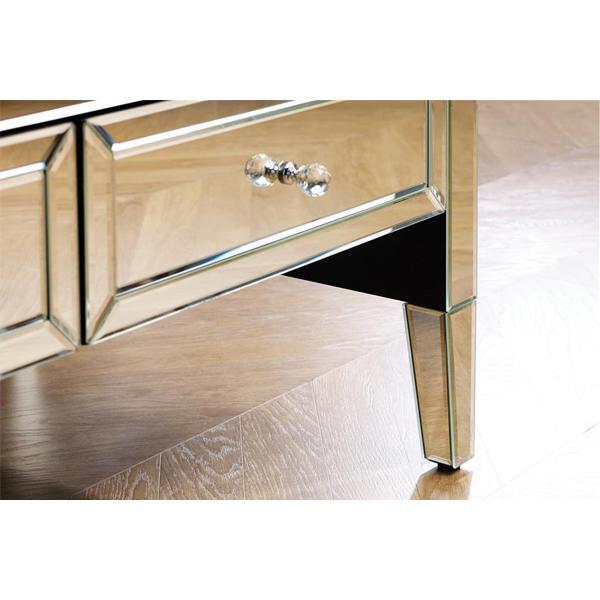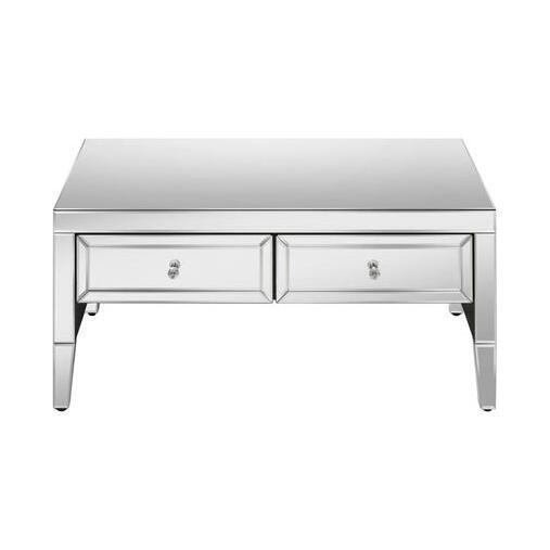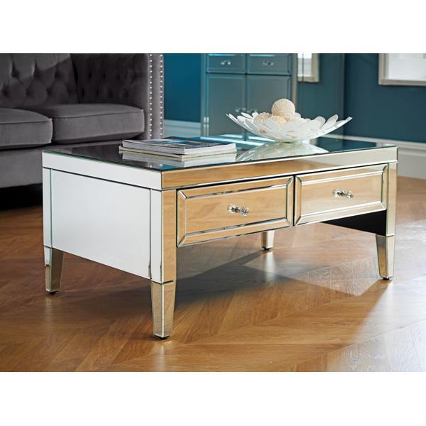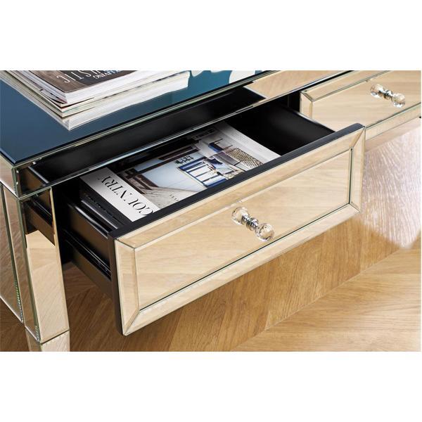 The beautiful and glamorous Valencia coffee table will be a stylish addition to any room. Constructed from a MDF frame this stunning range features a mirrored finish with bevelled edges and elegant mock crystal handles. Cleaning and Care: Wipe with dry cloth.