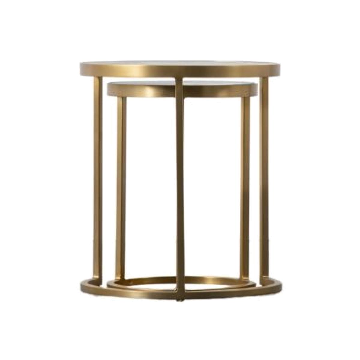 Nest of two tables ideal for adding a touch of glamour to a room. They pair metal frames with a lovely gold finish and glass tops to give an elegant look. The tables are also available in silver. Material: Iron. Colour/Finish: Gold. Table Shape: Round.