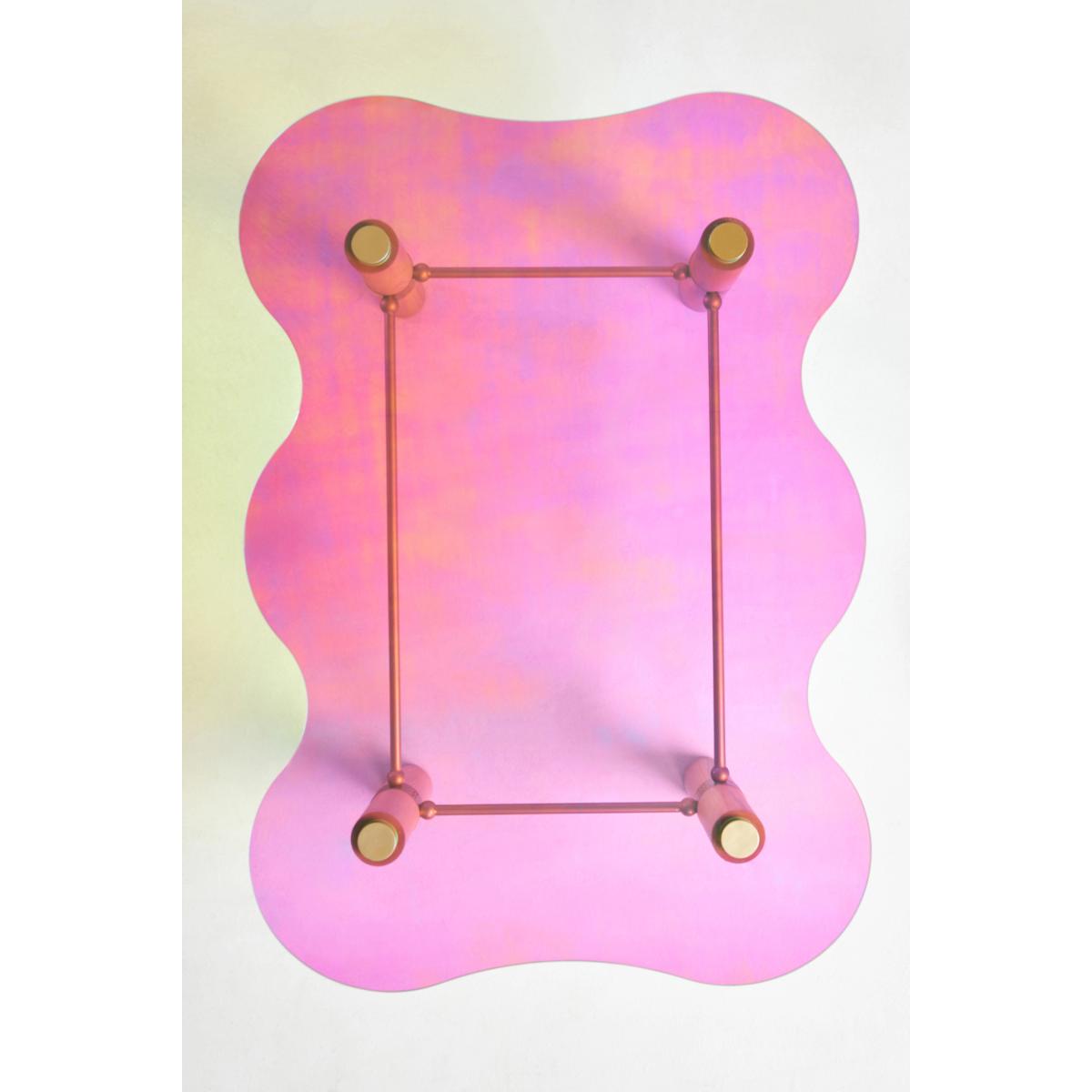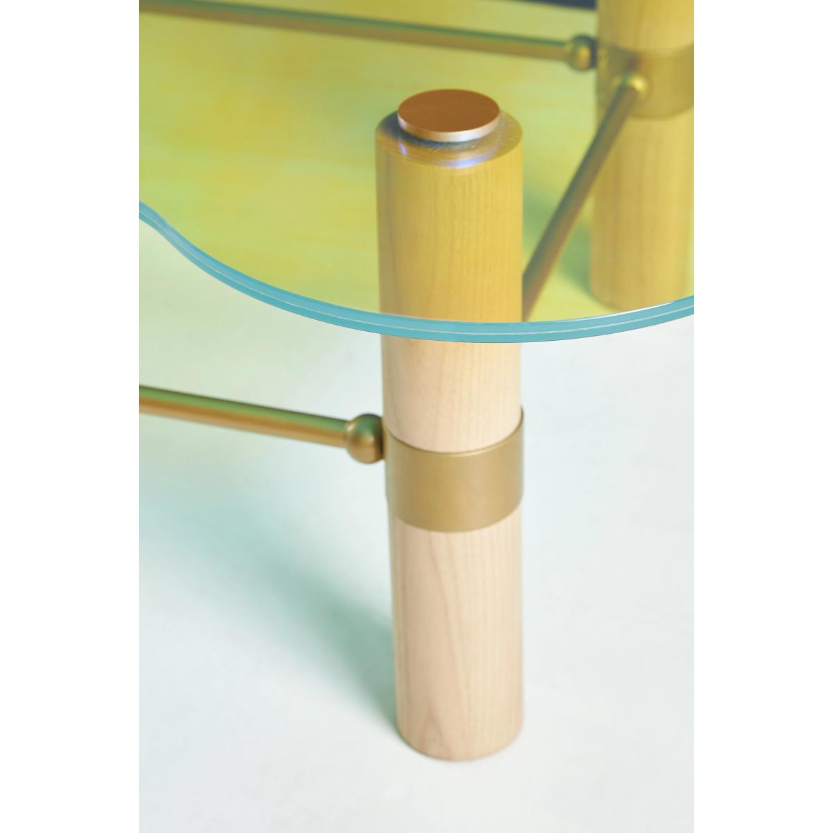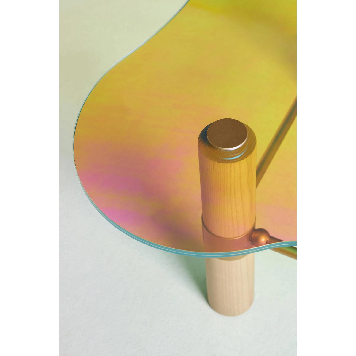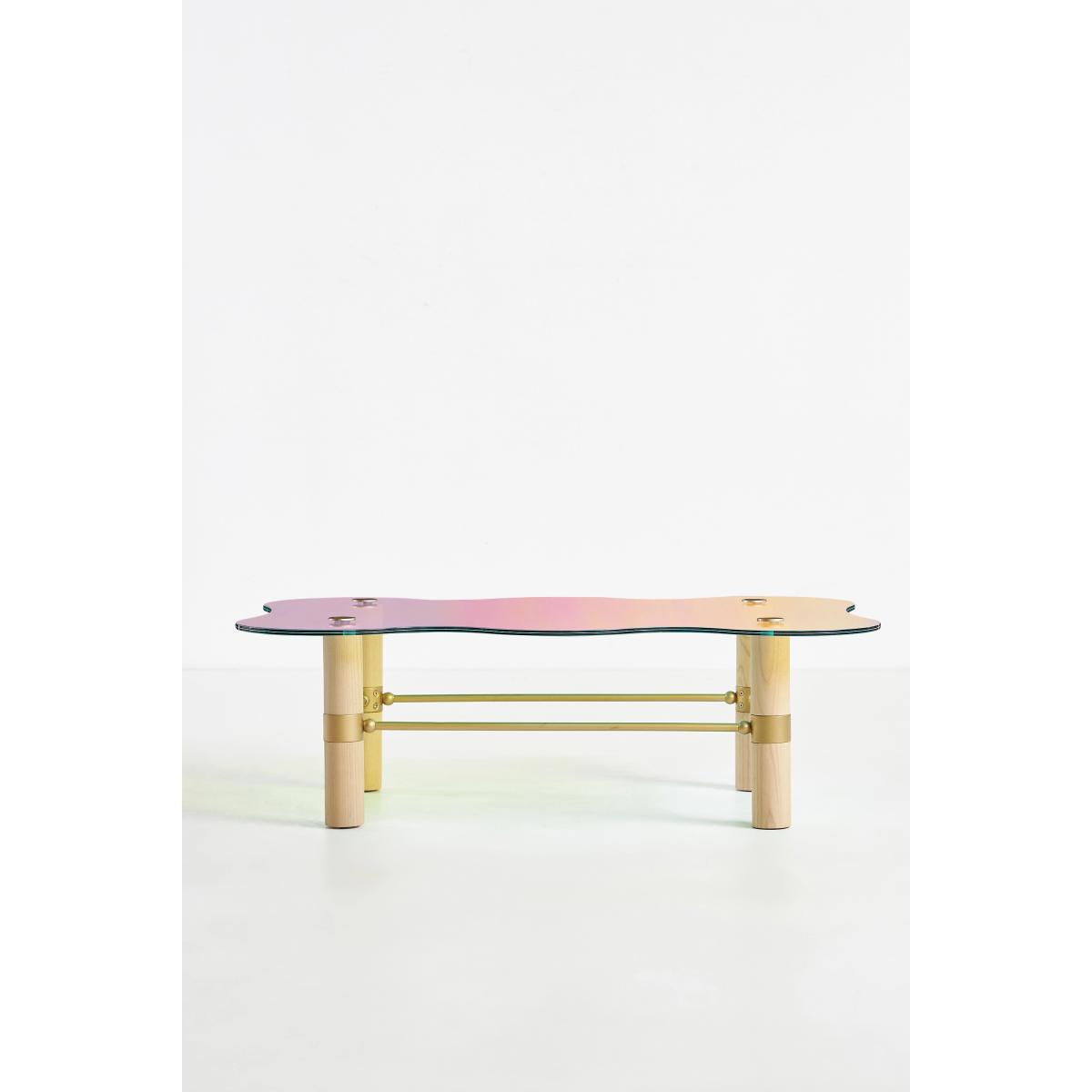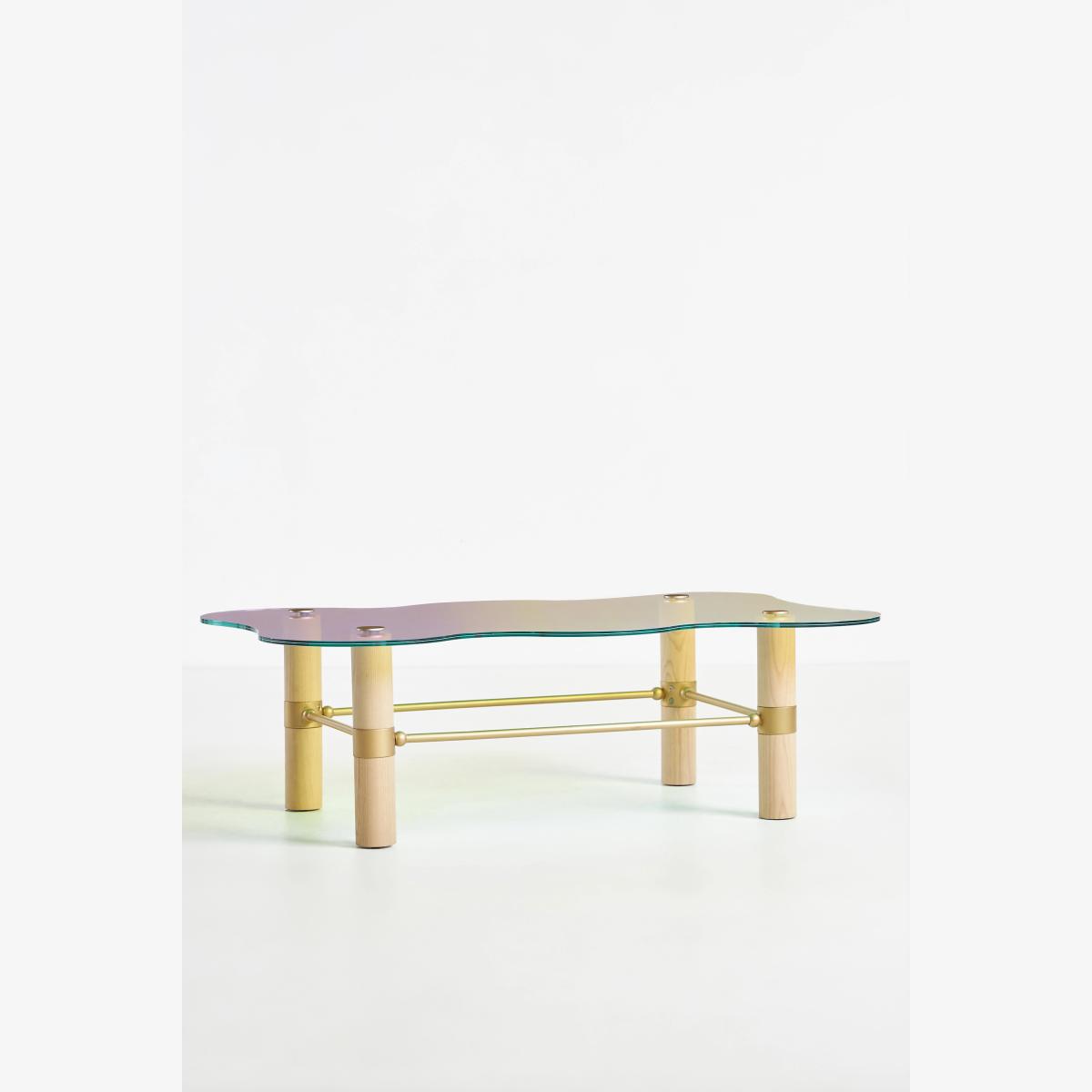 A scalloped holographic glass top takes centre stage in an exquisitely formed collection that's finished with accents of natural wood. * Glass coffee table with ash wood legs and metal accents * Sealed with clear lacquer for protection * Dust often with soft, dry cloth * Blot spills immediately with clean, damp cloth * This piece is intended for indoor use * Some assembly required * Imported