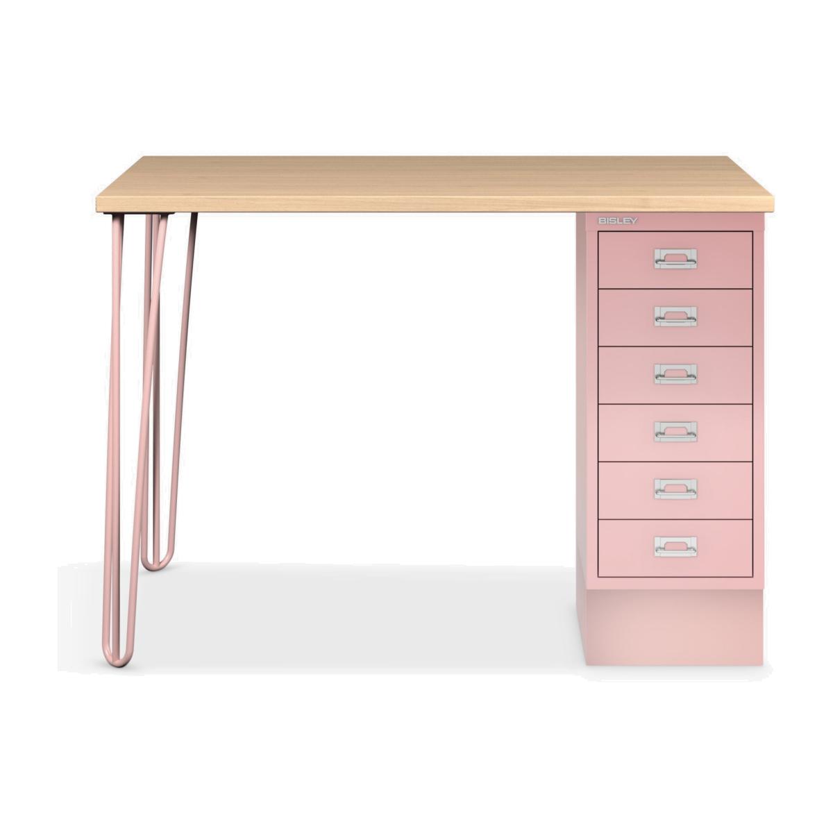 Perfect for smaller spaces, the Multi Desk brings you all the benefits of the iconic Bisley Multi Drawer storage cabinet, transformed into a multi-functional desk. Stay organised while working comfortably and maximising space within the home or office. Made in the UK, your Multi Desk can be assembled with your Multi Drawer at the right or left side, whatever is handier for you. The contemporary design features six drawers, sturdy steel hairpin legs and a beautiful oak veneer top. Want to see it first? You may want to see and get a feel for the furniture in one of our shops before ordering. We'll be able to tell you where the range you'd like to view is on display.