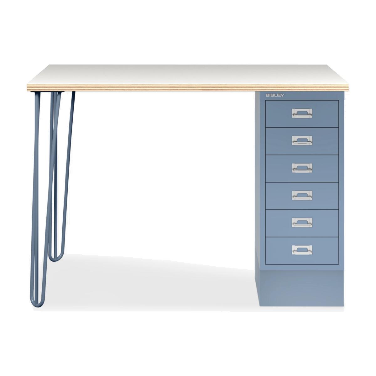 Perfect for smaller spaces, the Multi Desk brings you all the benefits of the iconic Bisley Multi Drawer storage cabinet, transformed into a multi-functional desk. Stay organised while working comfortably and maximising space within the home or office. Made in the UK, your Multi Desk can be assembled with your Multi Drawer at the right or left side, whatever is handier for you. The contemporary design features six drawers, sturdy steel hairpin legs and a painted ply wood top. Want to see it first? You may want to see and get a feel for the furniture in one of our shops before ordering. We'll be able to tell you where the range you'd like to view is on display.