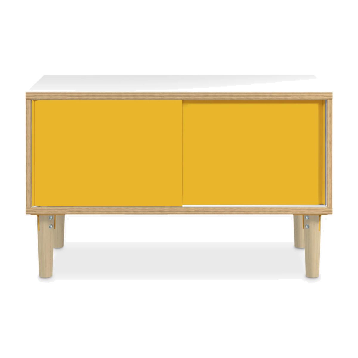 I love this piece for its modern yet versatile aesthetic-perfect for adding a pop of colour while maintaining a clean, contemporary look. The yellow sliding doors make it a statement piece that works particularly well in neutral or minimalist interiors, injecting personality without overwhelming the space. Practical styling tips include pairing it with stripped-back accessories like monochrome vases or sculptural objects to keep the focus balanced. It’s equally suited to living rooms, dining areas, or even hallway schemes, offering ample storage whilst acting as a bold focal point. Its natural wood accents also ensure it blends seamlessly with both warmer and cooler palettes, making it a flexible choice for a variety of interior styles.