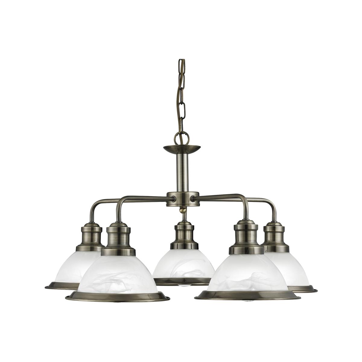This Bistro antique brass 5 light pendant with acid glass shades has a simplistic look that will add a retro feel to any dining room or kitchen. Reminiscent of the style of classic diners and bistros, this ceiling light comprises five classic art deco shades finished in a traditional antique brass, with acid glass to provide clean lighting effects. This ceiling pendant brings a distinctive and elegant style to any setting, and the chain suspension can be adjusted for different ceiling heights.