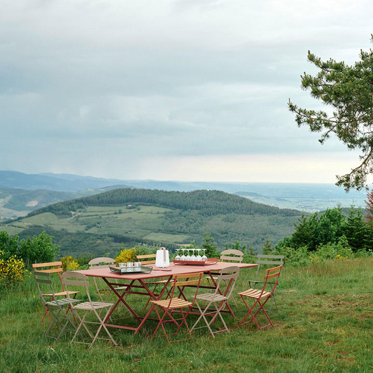 Enter the legend with the mythical Bistro folding chair! Designed in 1889 for café terraces, the iconic folding chair from Fermob has been delighting us for over a century. Times Square or Bryant Park in New York have never resisted its “so French” style. Still made according to the original model, the folding Bistro chair has benefited since from several innovations to make it more ergonomic and practical. Robust, light, simple and quickly stored away, this jolly chair is full of ingenuity and simplicity and has not lost any of its charm or authenticity. The Bistro range is ideal for creating a very nice dining area, indoors or out. kitchen, balcony, veranda or terrace. The folding chair is available in a host of colours which offer as many options for creating your own décor. Compact and ideal for tight spaces. This version combines a painted metal structure with curved slats in Textrol®-treated natural beech. Protected against the weather, the natural wood provides an authentic, warm look which contrasts nicely with the range of modern colours. This chair is equipped with plastic clips for slow, safe folding / unfolding.