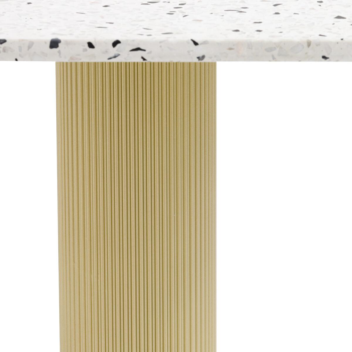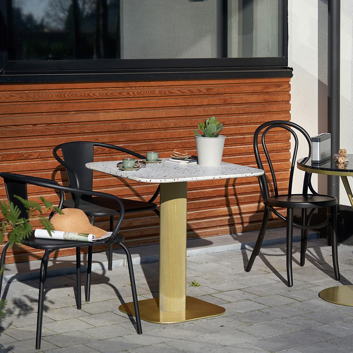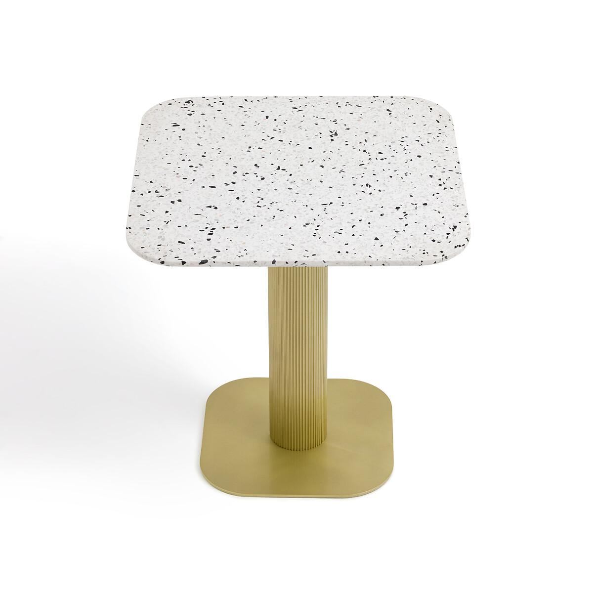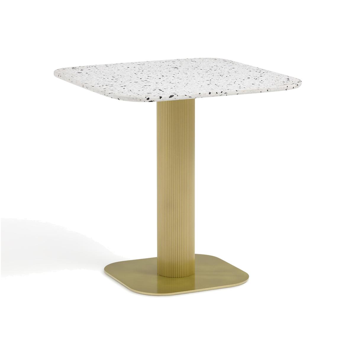 Clean lines, with a terrazzo top: this garden table revisits the bistro style in a more contemporary design. Perfect for lunch on the terrace. Designed by La Redoute Interiors. Product Details • Terrazzo top, beige colour, thickness 1.8cm • Column-shaped base, in steel metal, brushed-effect brass lacquered finish, diameter 13.4cm • Seats 2 • Use: indoor and outdoor. Dimensions • Width: 70cm • Depth: 70cm • Height: 71cm • Weight: 36.5kgDelivery:. Requires assembly. Dimensions and weight of parcel2 parcels • L81 x H12 x D81cm. 36.7kg • L16 x H71 x D16cm. 5.5kg