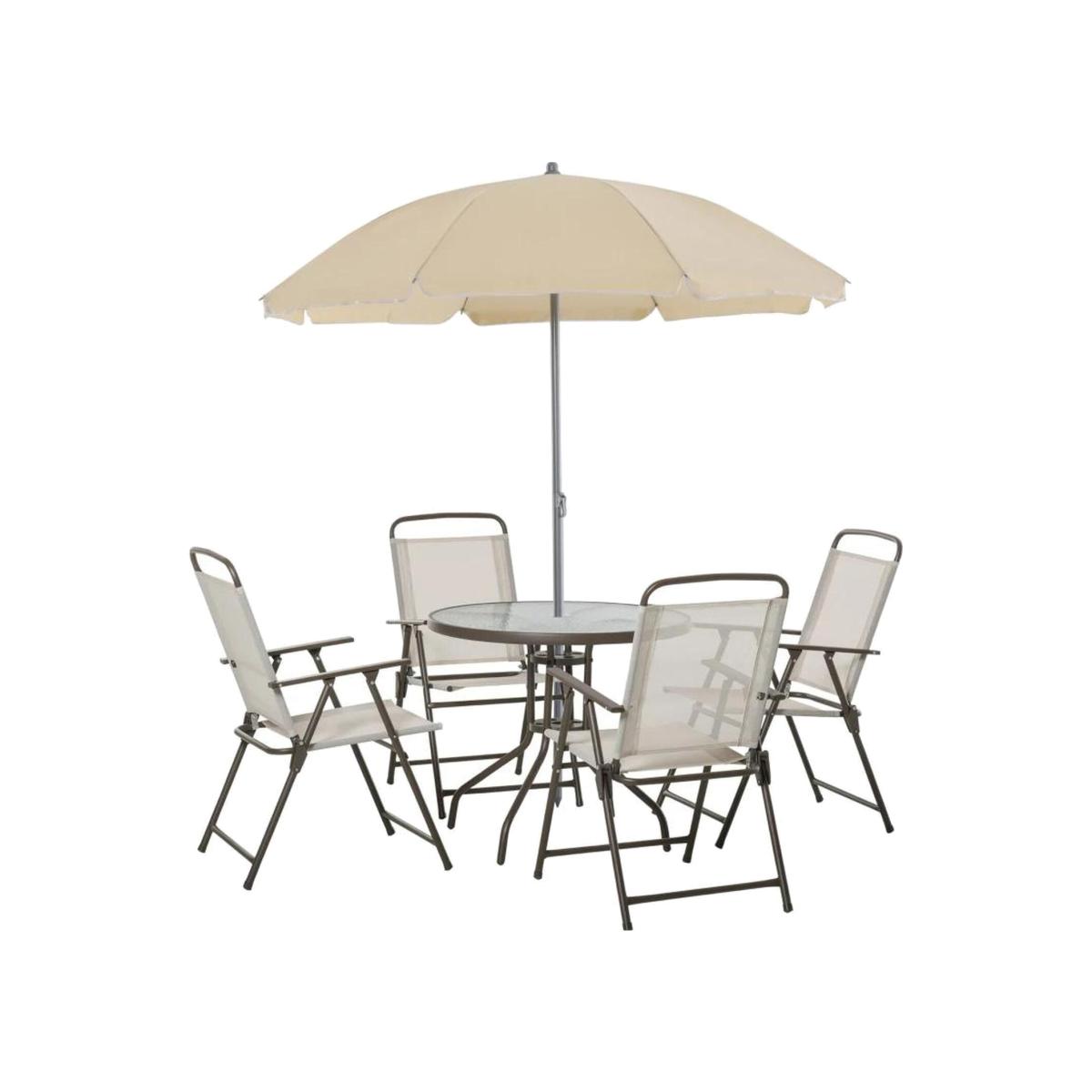 Check out this Chili Seating outdoor dining set to complete your space. The set includes four foldable chairs, a round glass top table and parasol umbrella, you've got everything you need to dine with family/friends and keep protected. The metal frames of each piece are strong and rust resistant, with the breathable mesh chairs making them perfect for hotter climes. An excellent addition to your patio all year round. Bistro Set with Folding Chairs Plus Table and Parasol - Beige
