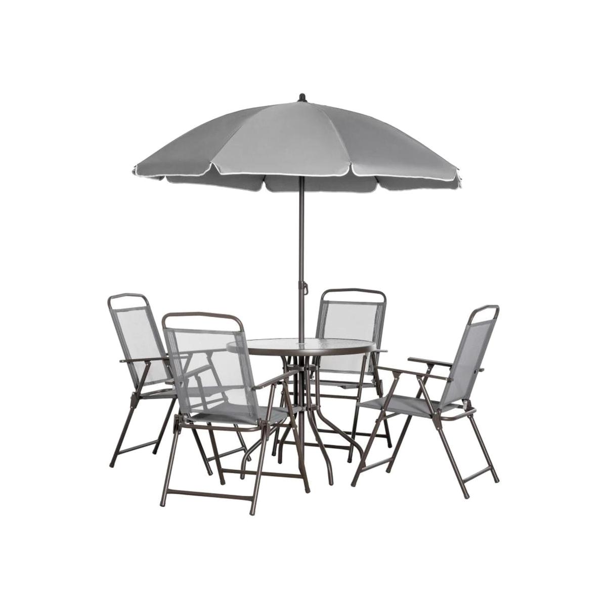 Check out this Chili Seating outdoor dining set to complete your space. The set includes four foldable chairs, a round glass top table and parasol umbrella, you've got everything you need to dine with family/friends and keep protected. The metal frames of each piece are strong and rust resistant, with the breathable mesh chairs making them perfect for hotter climes. An excellent addition to your patio all year round. Bistro Set with Folding Chairs Plus Table and Parasol - Grey
