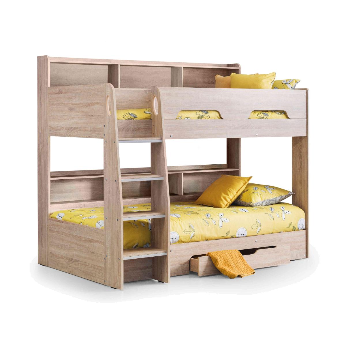 Combining a handy pull-out drawer with extensive shelving makes the Bjorn Bunk Bed with Storage an ideal solution for cluttered kids rooms. Why you'll love it Super-safe ladder with cut-out handles and optional glow-in-the-dark strips. Crafted from sturdy materials and built to last. Raised shelf lip prevents things slipping down the back of the bed. Available in 3 stylish finishes, white, oak, and grey oak. We also offer a range of kids mattresses that’ll fit perfectly. This bunk bed is part of our kids bedroom range from Julian Bowen. What you need to know This bed is not supplied with mattresses included. This product is suitable for children aged 6 and over. Please note this item is self-assembly and will take approximately 120 minutes to assemble. Maximum safe mattress depth is 18 cm. Clearance of 10 cm is required either end for assembly.
