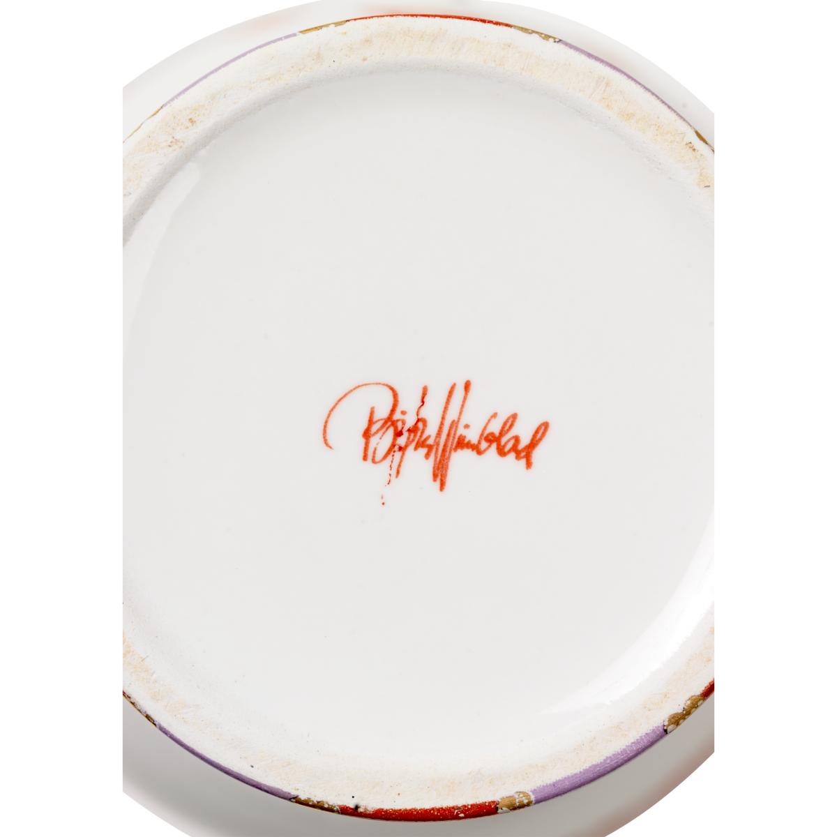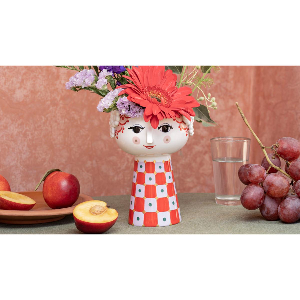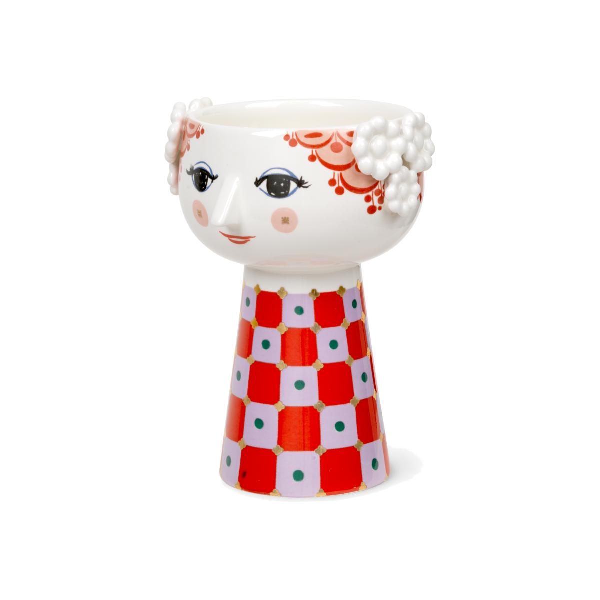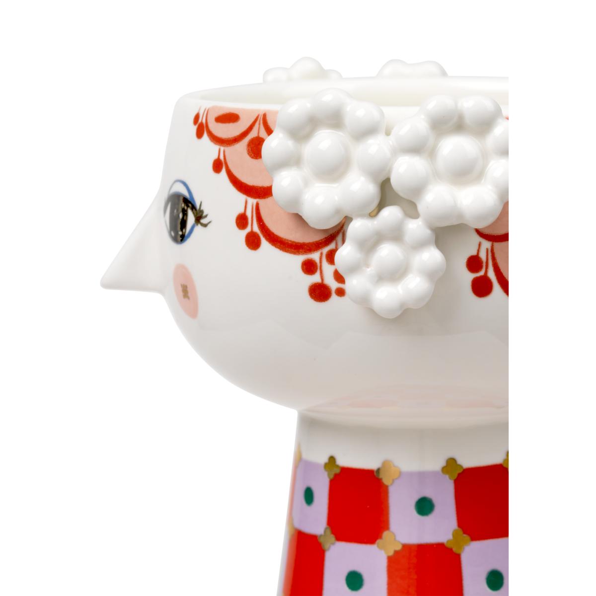 The 15 cm Eva vase from Bjørn Wiinblad is inspired by the designer's original Eva vases with wide heads and cone-shaped bodies. It's made of glossy glazed porcelain with coloured patterns and the exquisite face and dress that come from the illustrations of Bjørn Wiinblad himself. The small size of the vase makes it excellent for a few twigs or flowers.