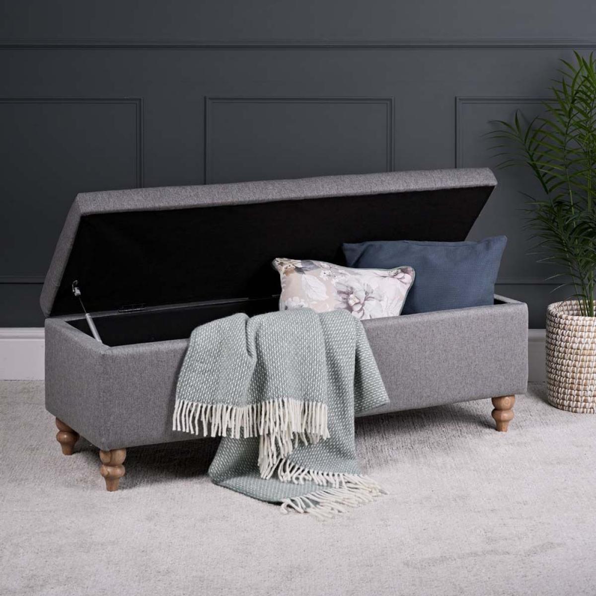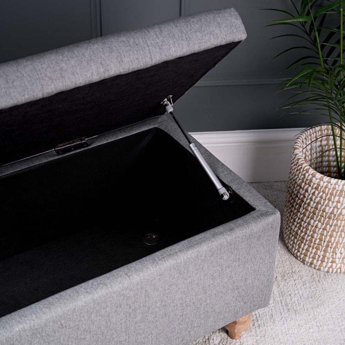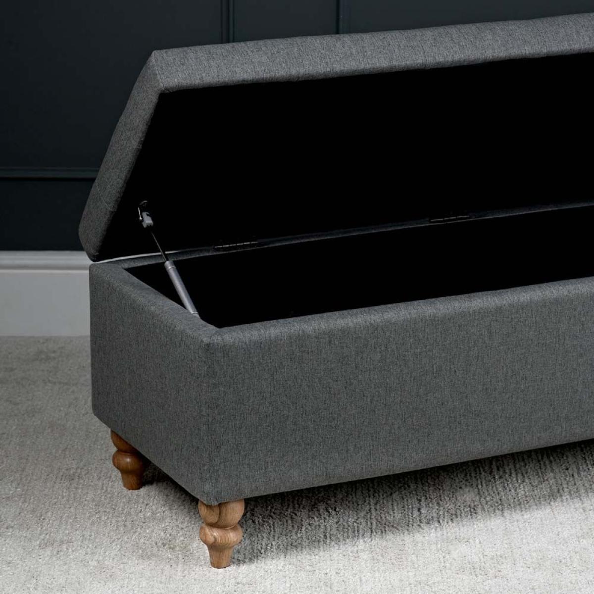 The Blaby Ottoman is a fully upholstered storage box which is great as blanket box in the bedroom or even as an additional seat below a window in the sitting room. The buttoned upholstery is in a neutral grey tone, and the lid features safe and secure hydraulic supports to assist with opening and prevent it closing unexpectedly. The ottoman is finished with turned wooden legs.